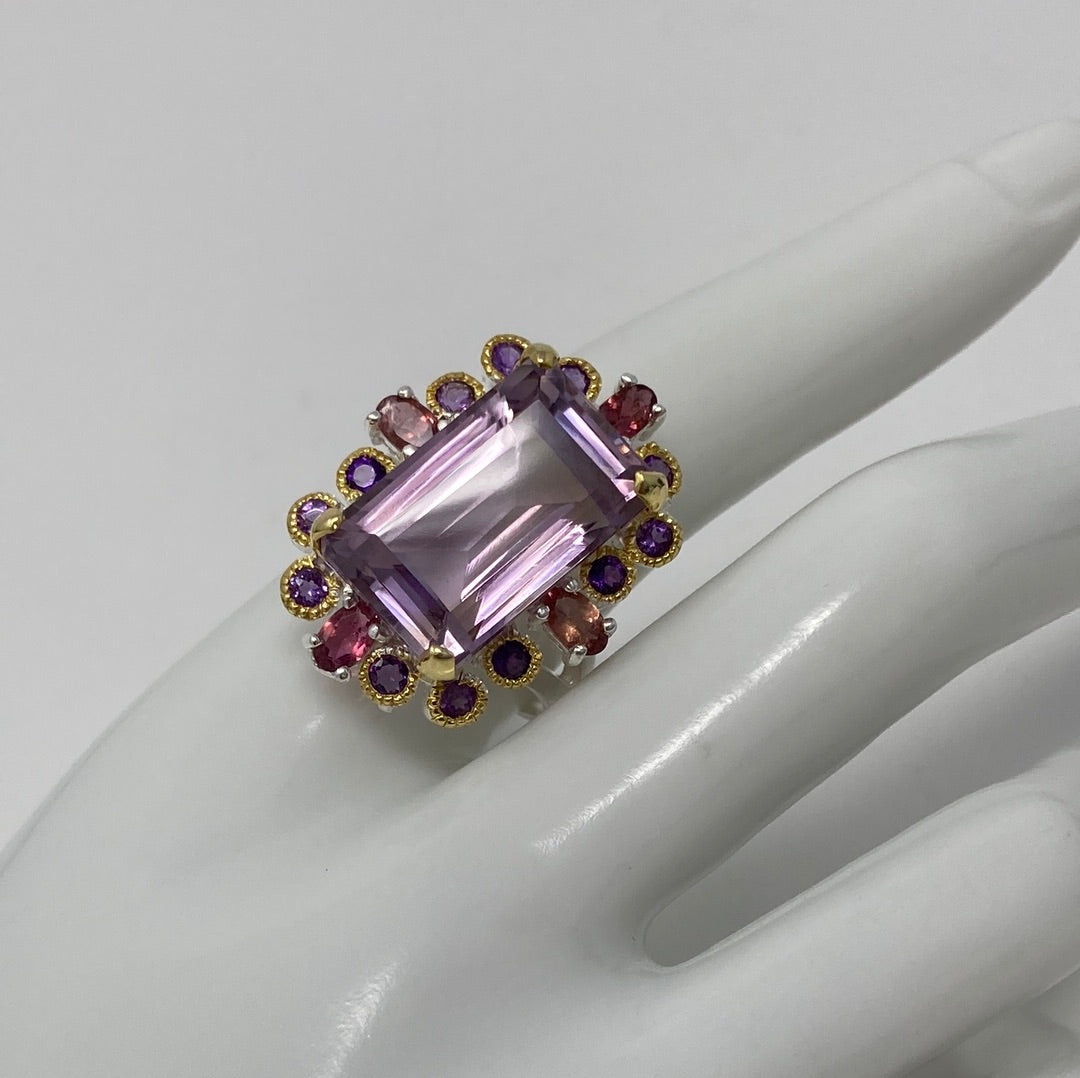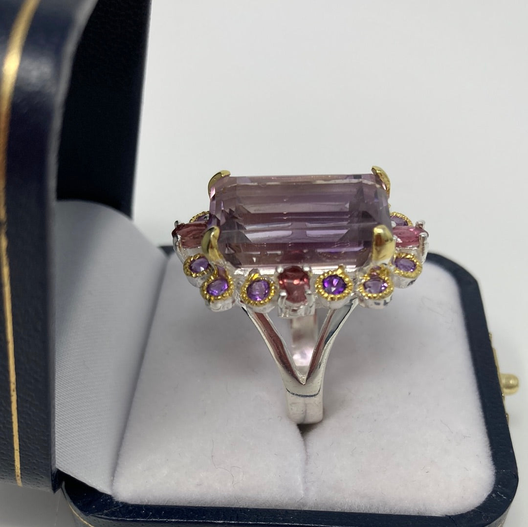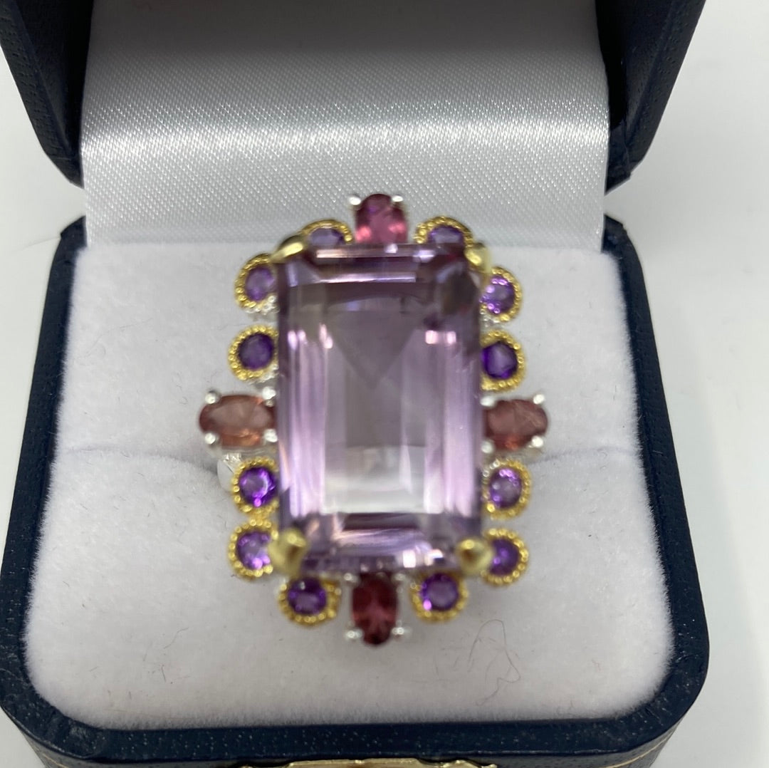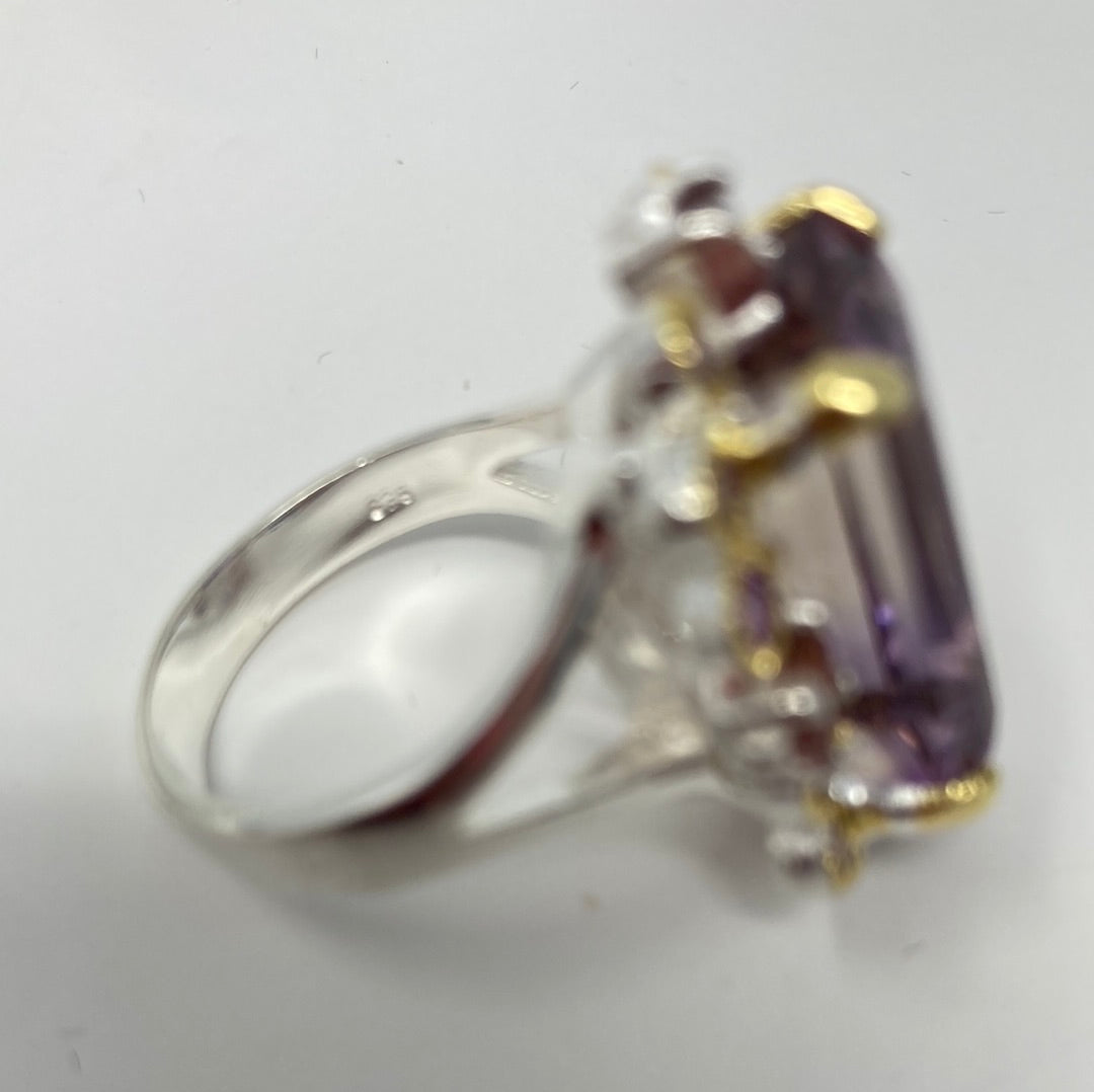 Extremely beautiful genuine Ametrine, in this highly desirable emerald cut faceting. A gemstone like this is a marriage between an Amethyst and a Citrine. The soft colors show the amazing color integration of this gemstone and a nice 15 CTW specimen surrounded by genuine rare Pink Tourmaline and Amethysts. Set in .925 sterling silver with a white gold overlay and yellow gold embellishments. Size 8 1/4, Resize at your jeweler or use a ring guard.