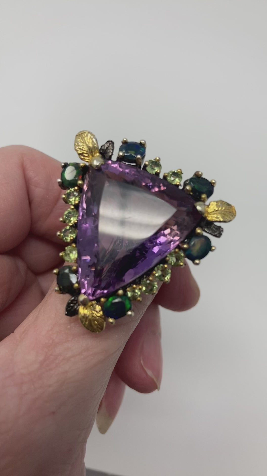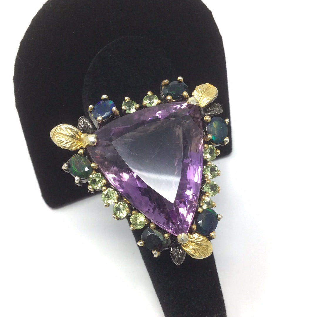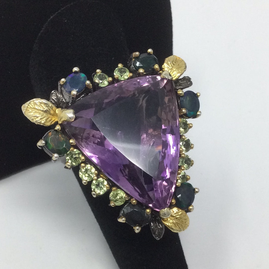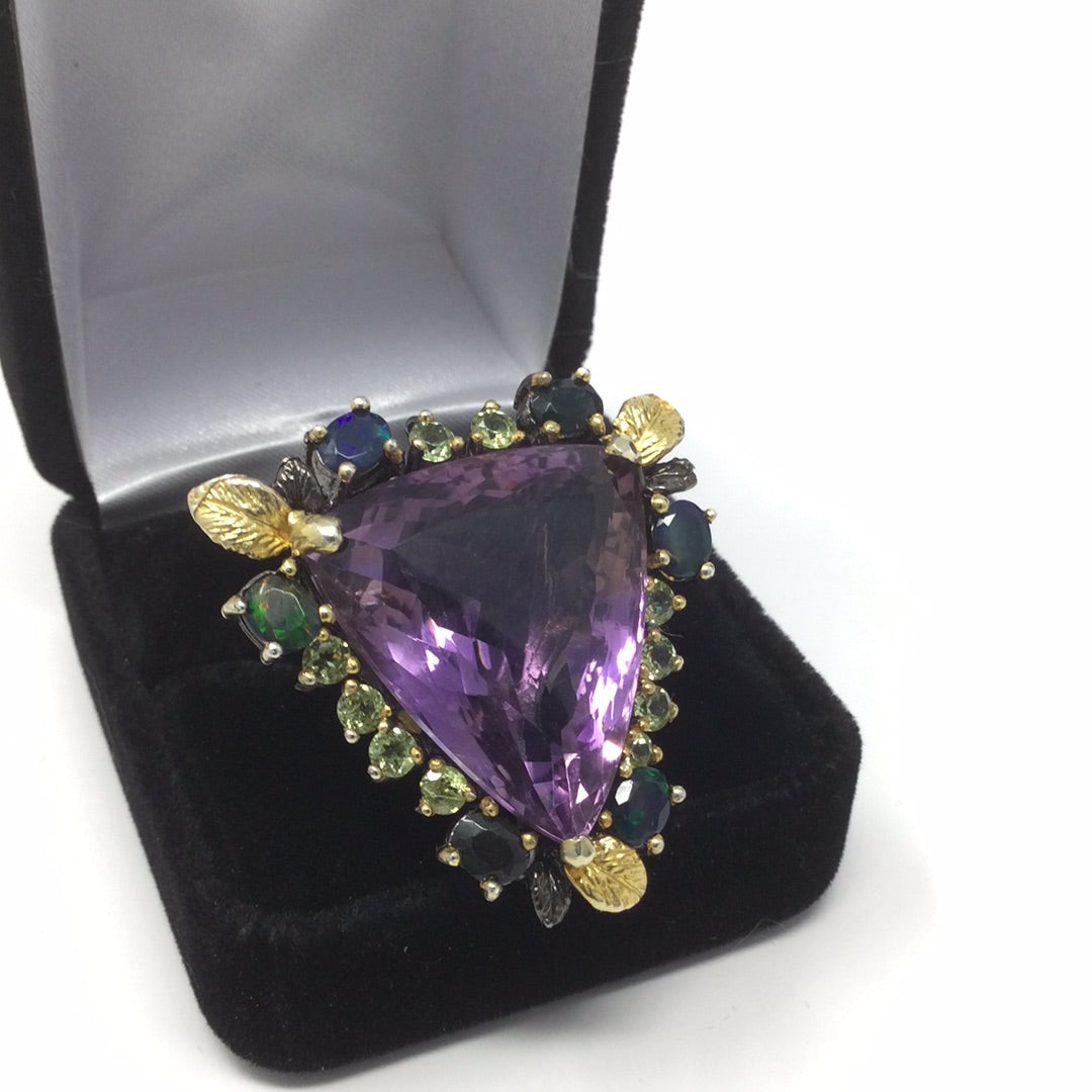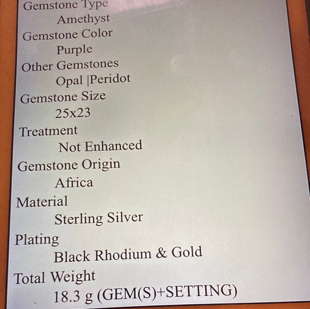 A breathtaking 43 CTW of Genuine Amethysts, custom made setting to accommodate this fabulous genuine gemstone. Encrusted with genuine Black Opals and Peridot makes this one spectacular ring that you won’t find anywhere else but here. It’s a one of a kind artist created piece. Crafted in .925 sterling silver with a Rhodium overlay for durability and beauty. Size 8 1/2, Resize at your jeweler