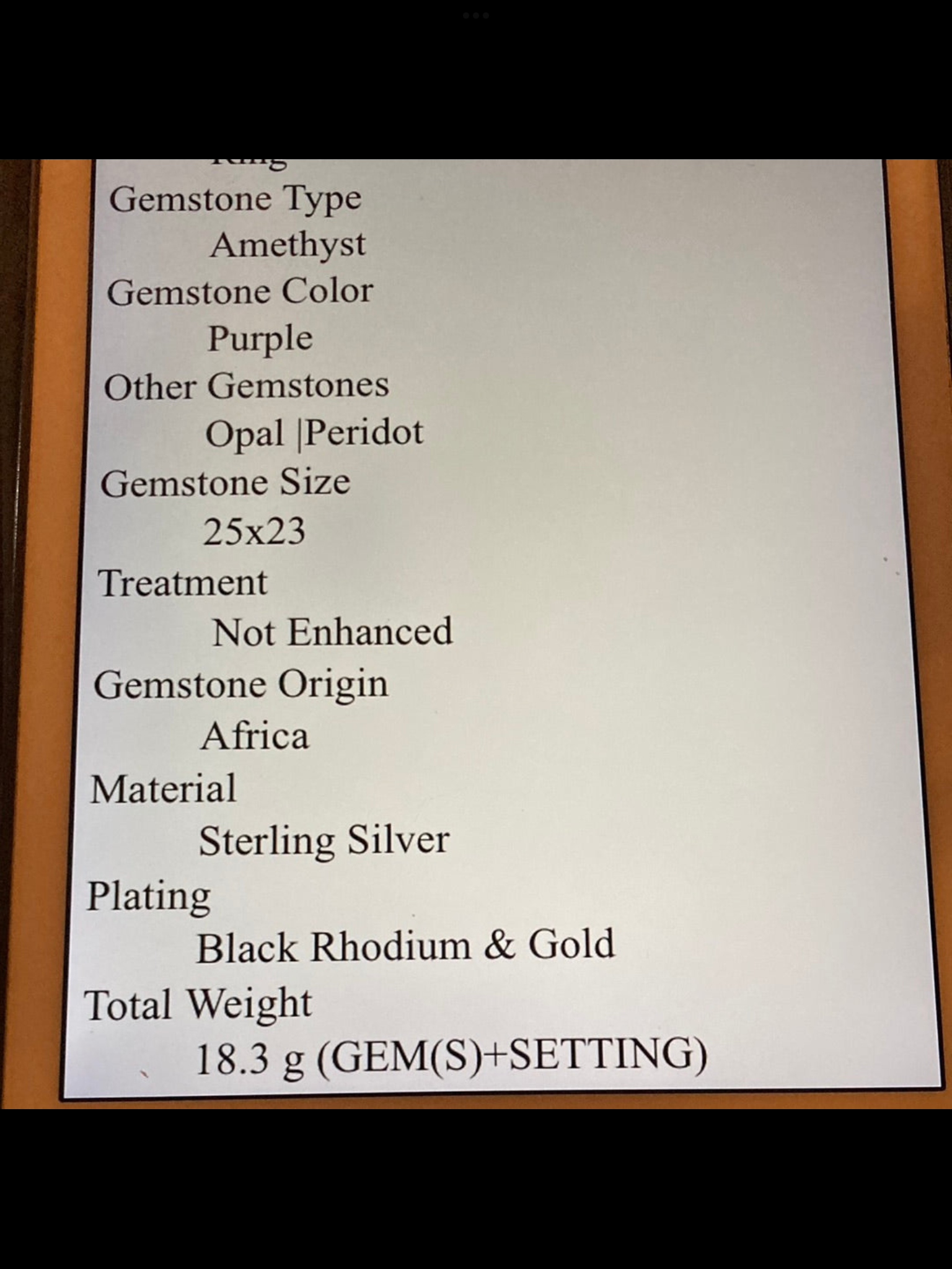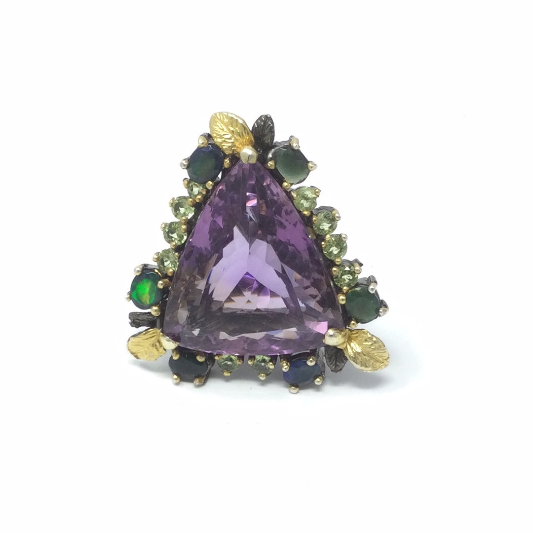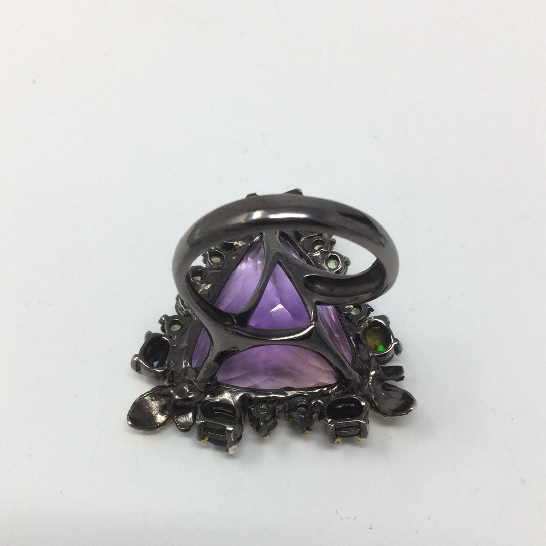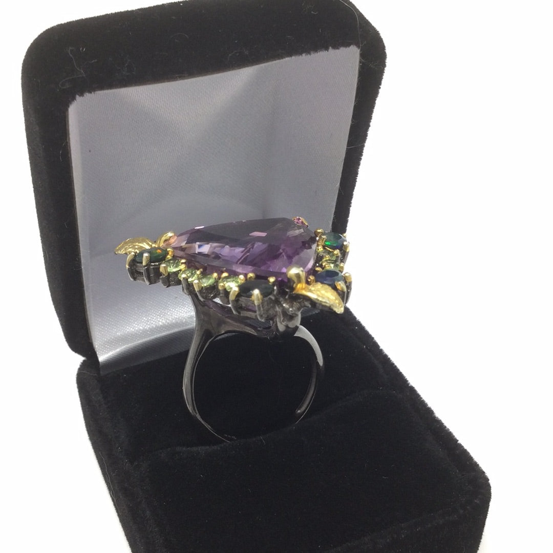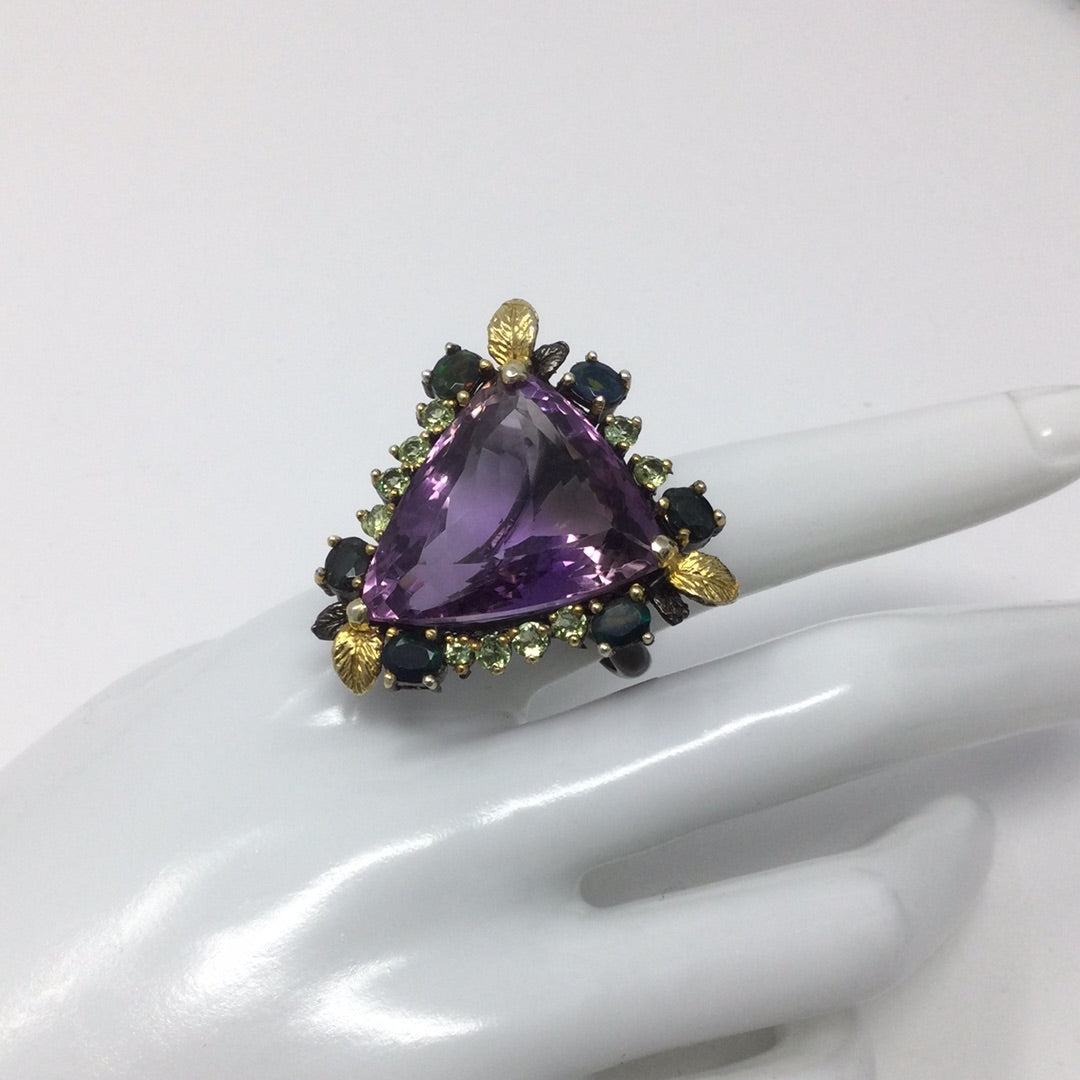 A breathtaking 43 CTW of Genuine Amethysts, custom made setting to accommodate this fabulous genuine gemstone. Encrusted with genuine Black Opals and Peridot makes this one spectacular ring that you won’t find anywhere else but here. It’s a one of a kind artist created piece. Crafted in .925 sterling silver with a Rhodium overlay for durability and beauty. Size 8 1/2, Resize at your jeweler