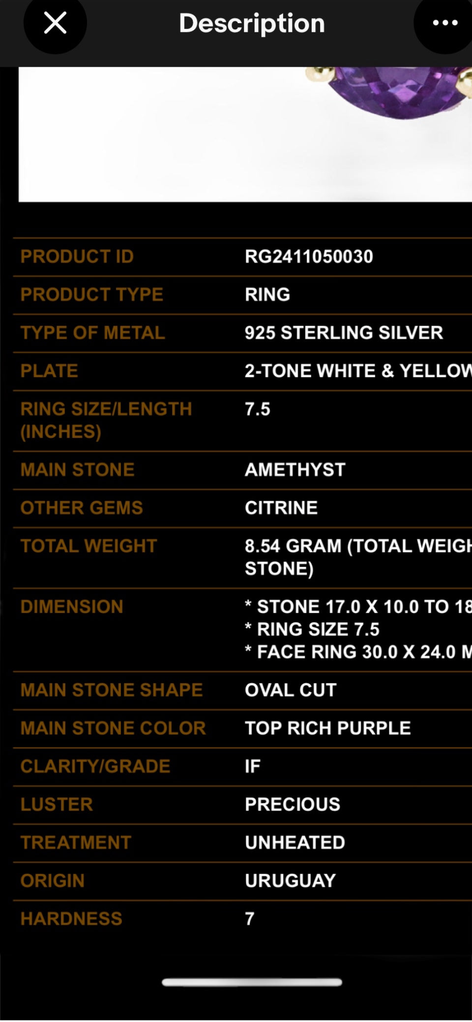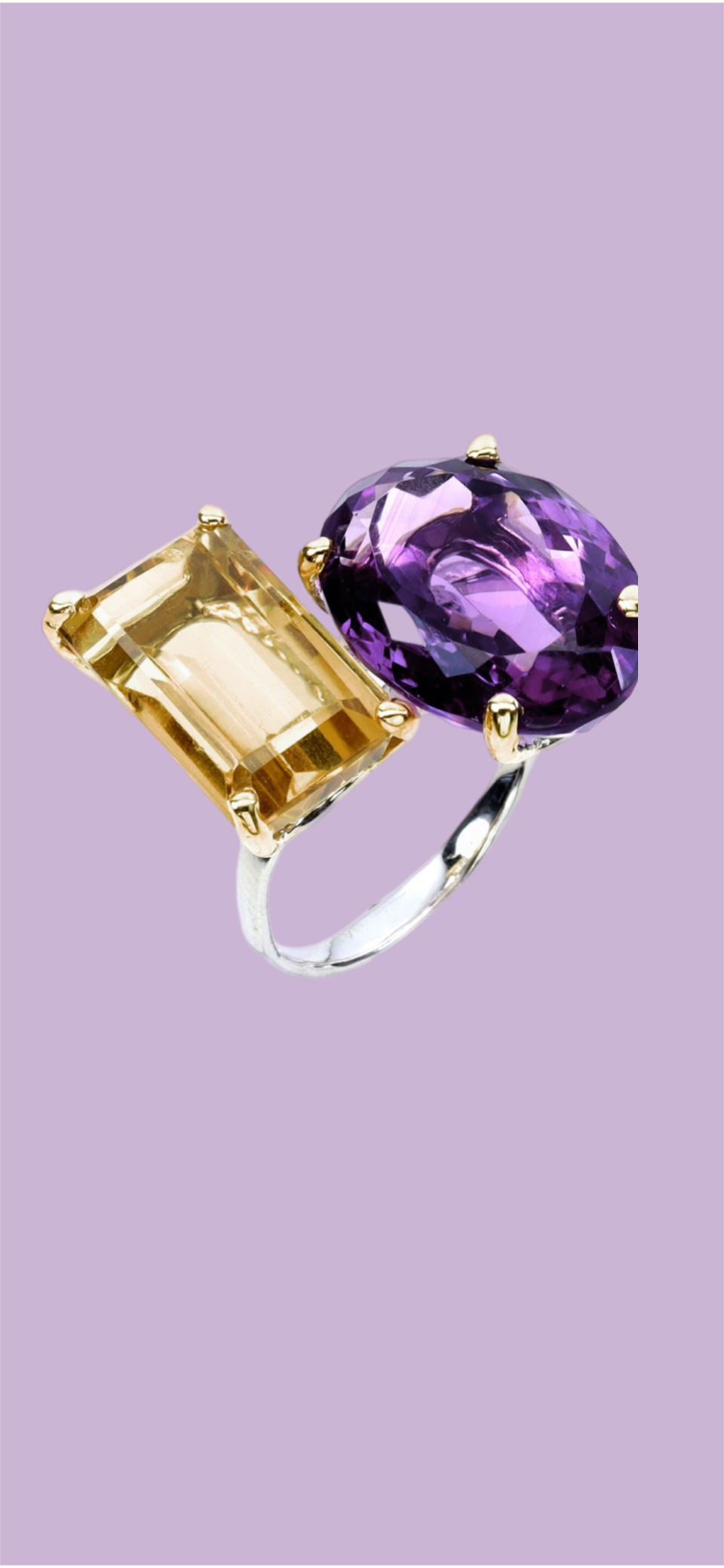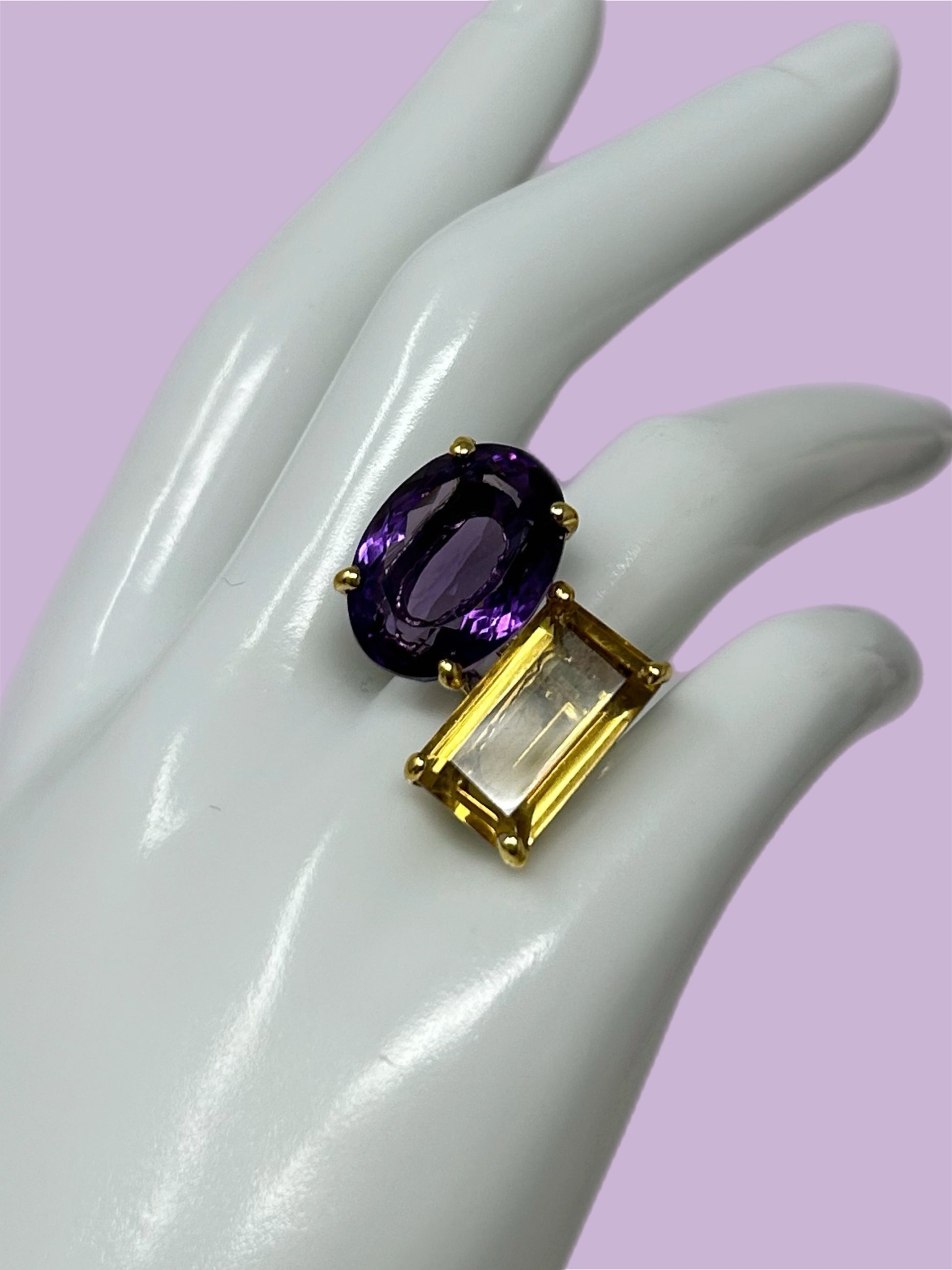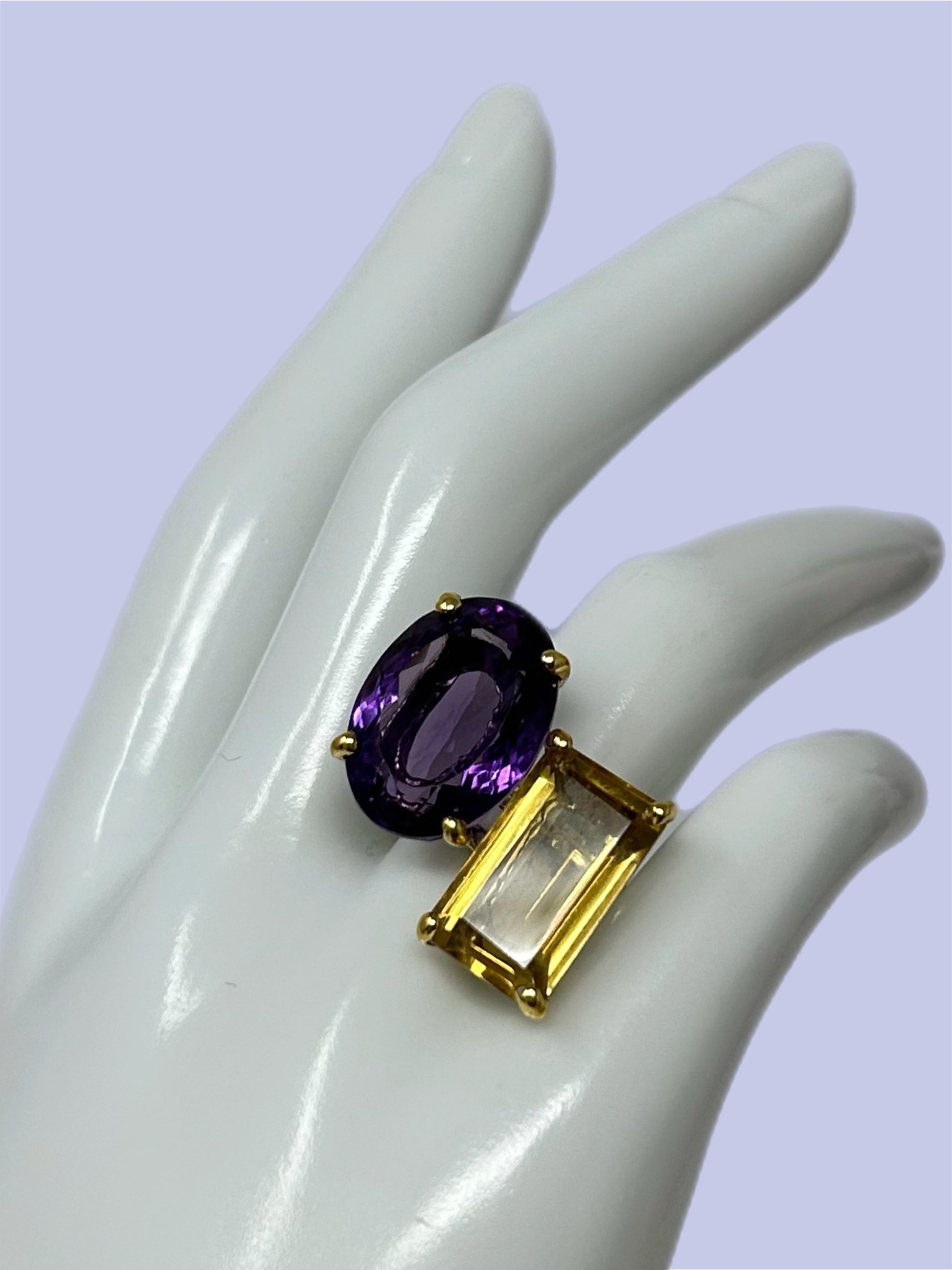 These Genuine Gemstones Kiss, this exquisitely designed duo weighs in at over 30 ctw. Exceptionally classy and such clean lines for an elevated sophisticated look. A large oval Amethyst and a highly sought after emerald faceted Citrine. Set in .925 Sterling Silver with yellow gold prongs Size 7 1/2, resize at your jeweler or use a ring guard