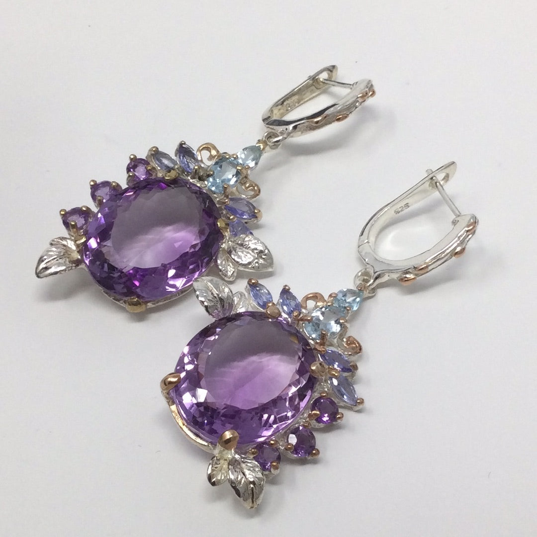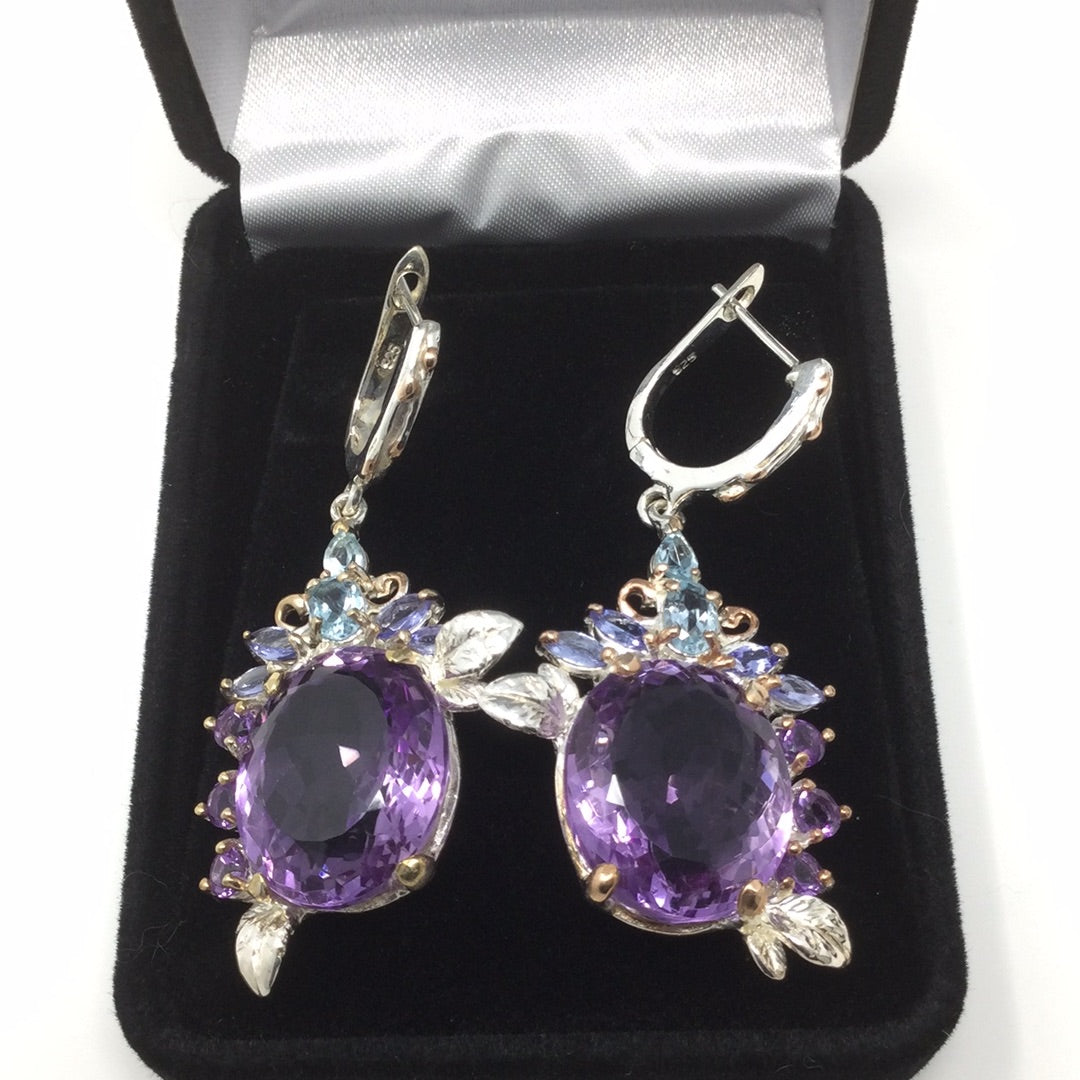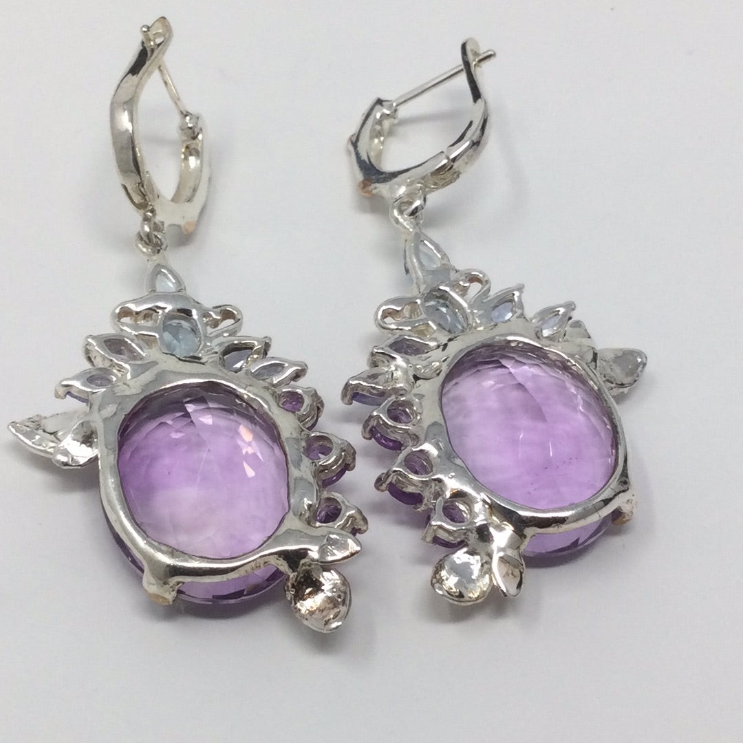 These fabulous genuine Amethysts earrings are in beloved lavender, accented with precious Iolites and Topaz. These are custom made one of a kind in this artistic design, a future heirloom for your family. Set in .925 sterling silver with a white gold finish for durability and beauty.