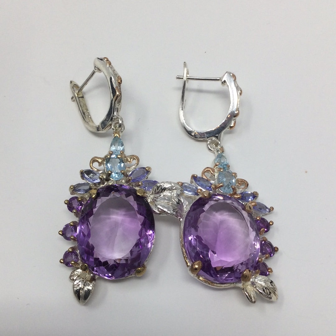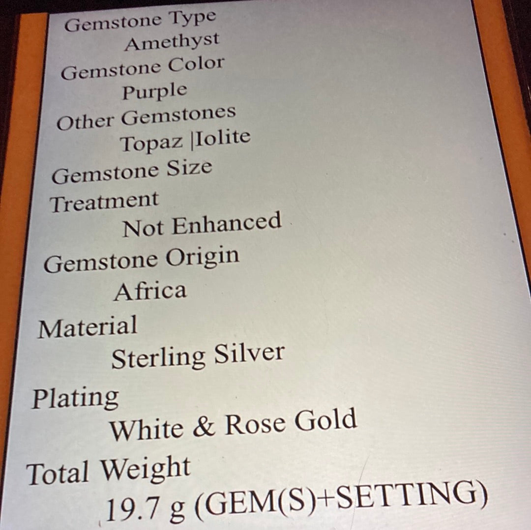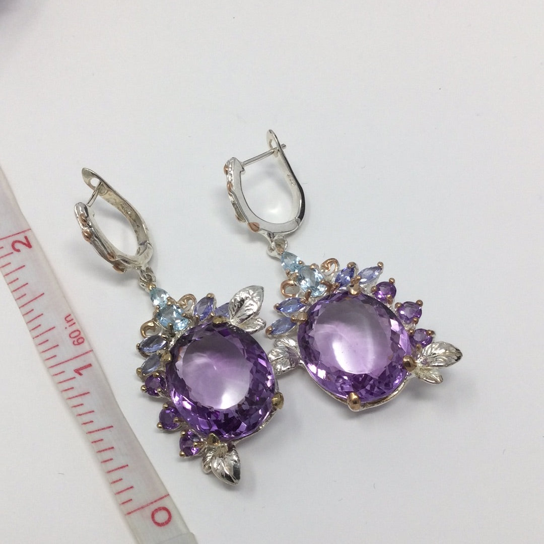 These fabulous genuine Amethysts earrings are in beloved lavender, accented with precious Iolites and Topaz. These are custom made one of a kind in this artistic design, a future heirloom for your family. Set in .925 sterling silver with a white gold finish for durability and beauty.