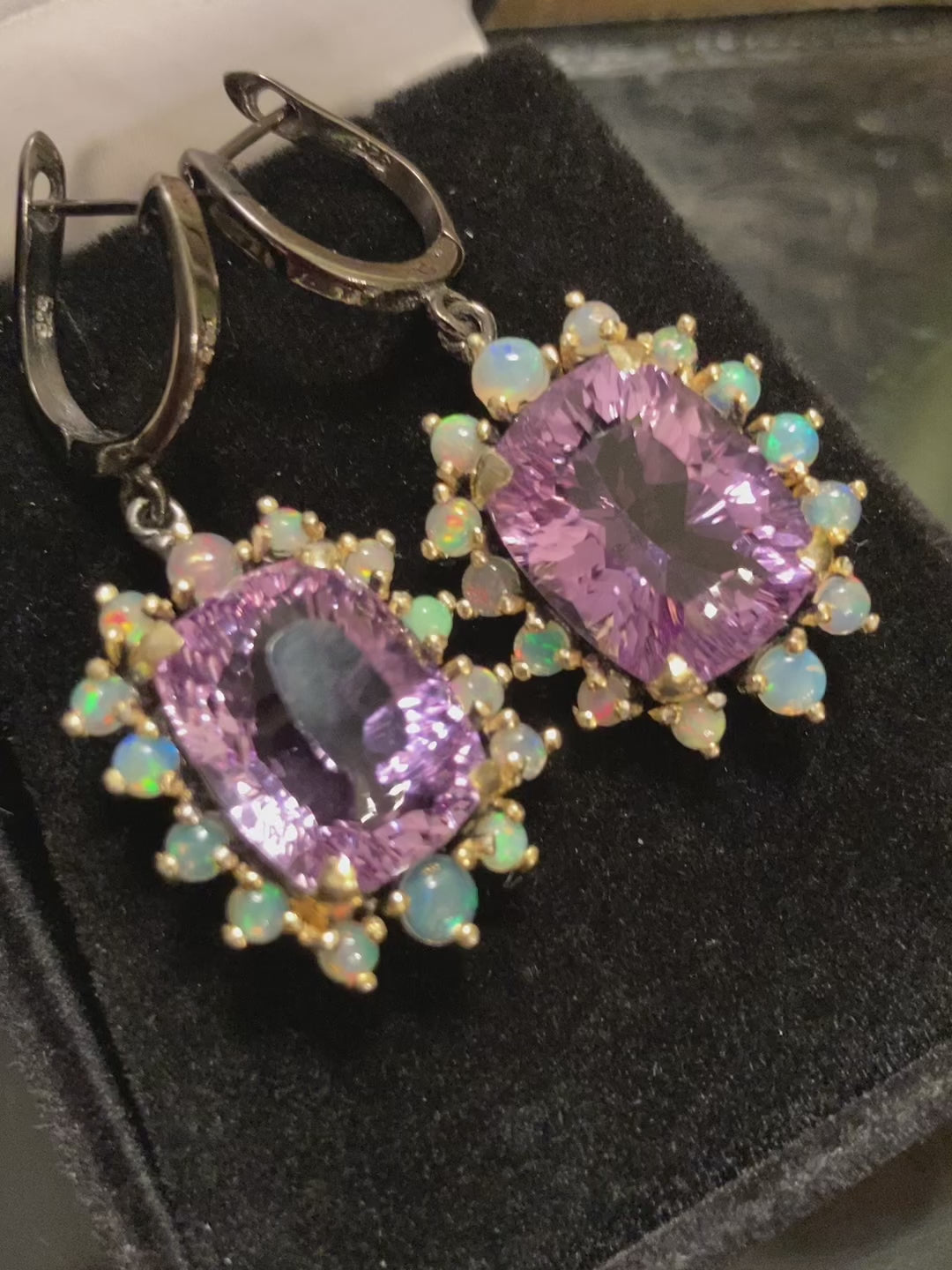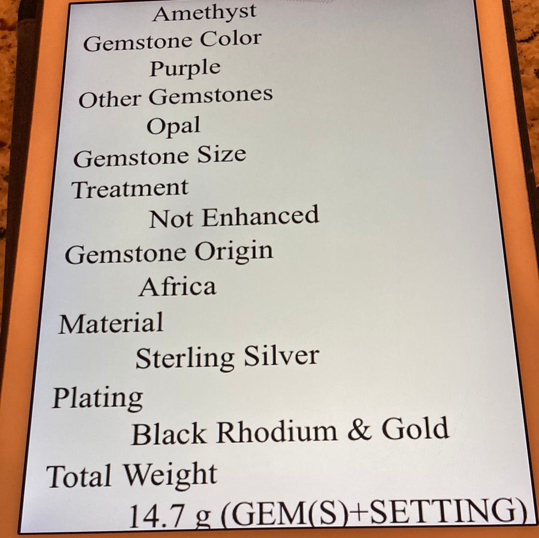 36 CTW of Genuine Amethyst in a fancy faceted cut, each gemstone is framed with all genuine iridescent Opals! Notice the cut, color and clarity of these gemstones, the attention to detail. These are custom made one of a kind, set in .925 silver with a Rhodium overlay and accented of yellow gold too. You’ll love these fine gemstone works of art, a elegant way to frame your face. Approximately 1” Long.