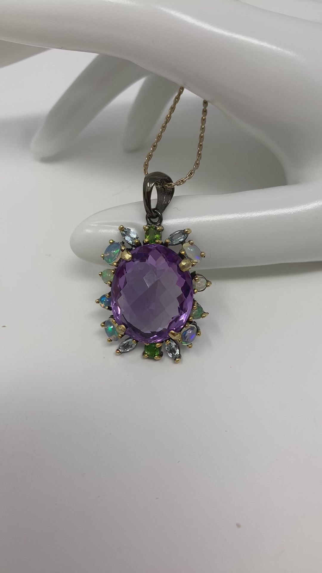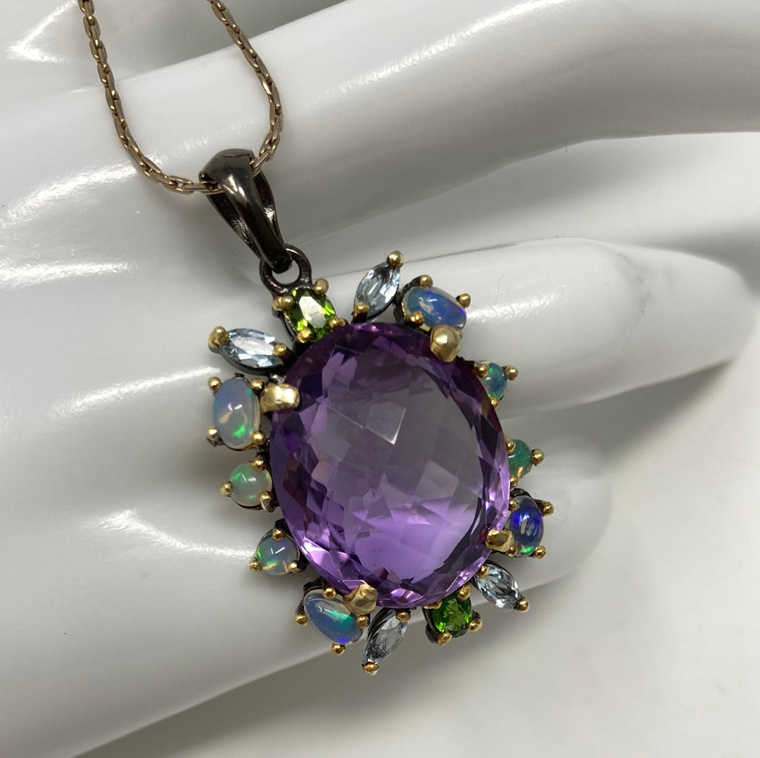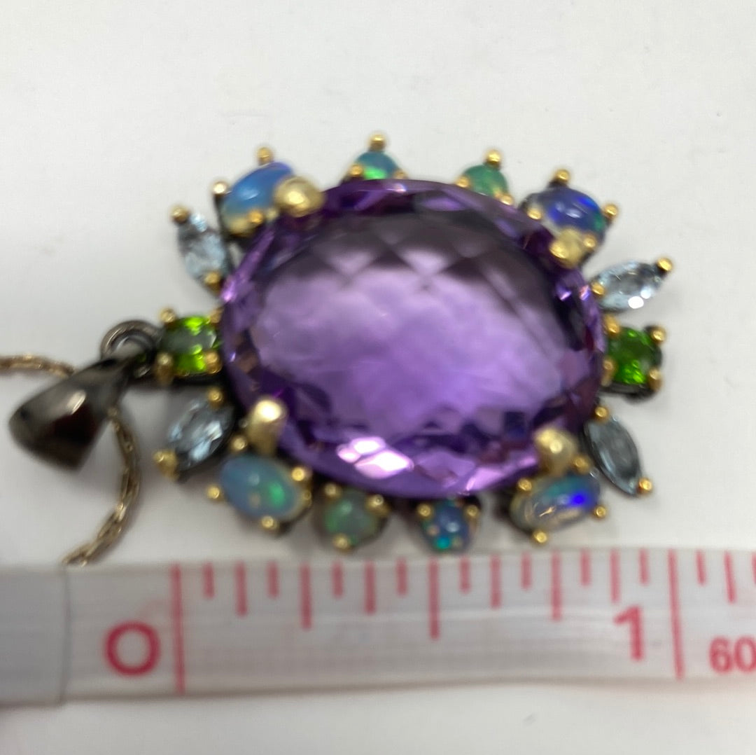 Extra special genuine 16 CTW Amethyst in that unusual checkerboard faceting. This is surrounded by genuine Opals, Russian Chrome Diopside and Peridot. This is a one of a kind masterpiece to accent your décolletage. A stone of this size is perfect to draw subtle attention to all your assets. Bedecked and bejeweled in class. Approximately 1 inch long on a 16” vintage gold chain