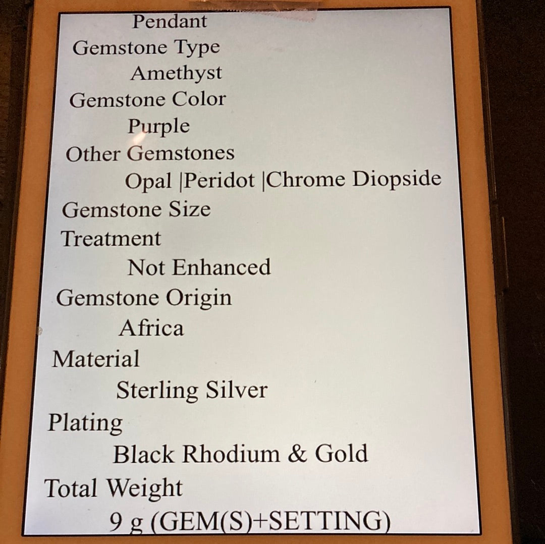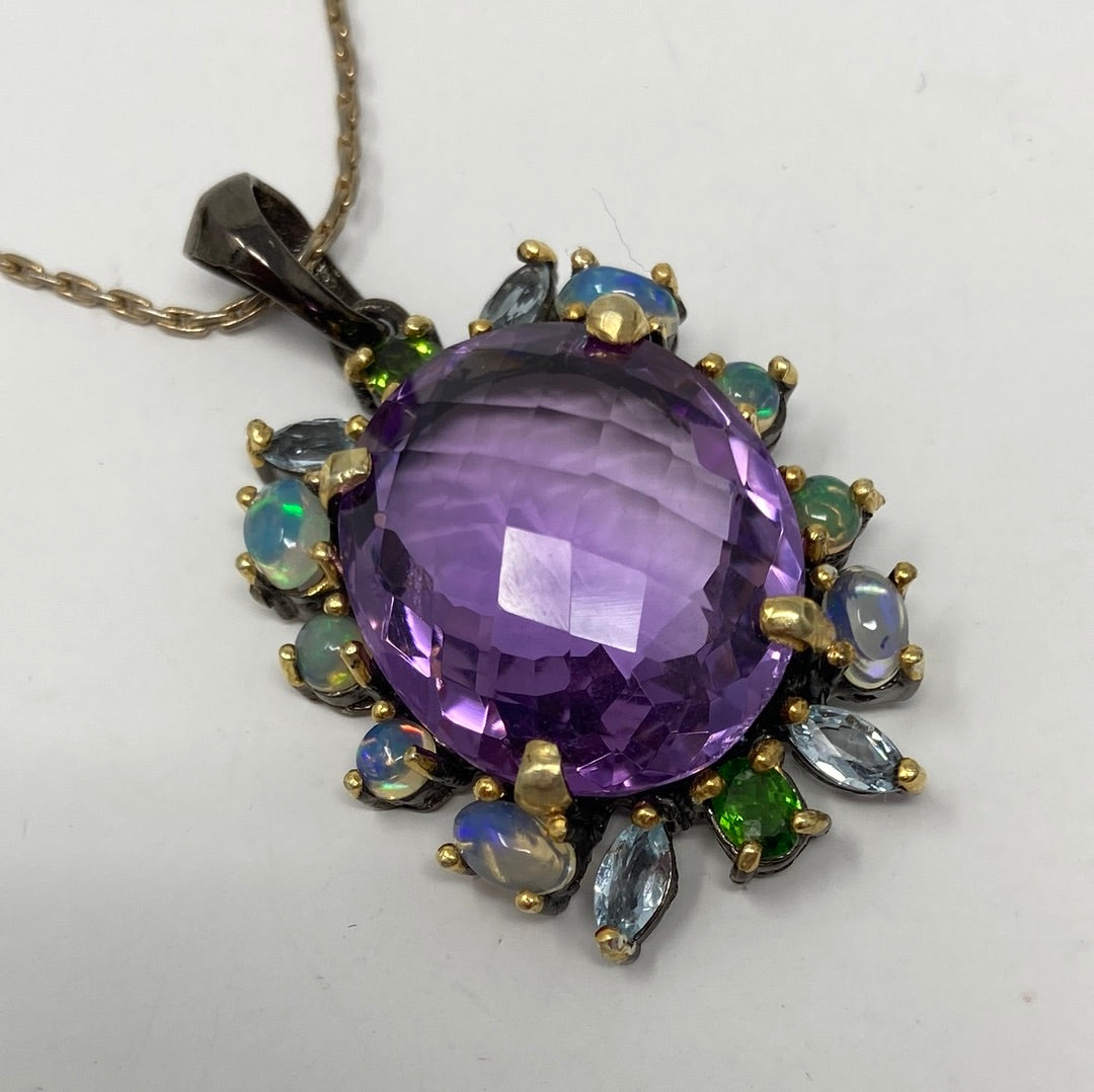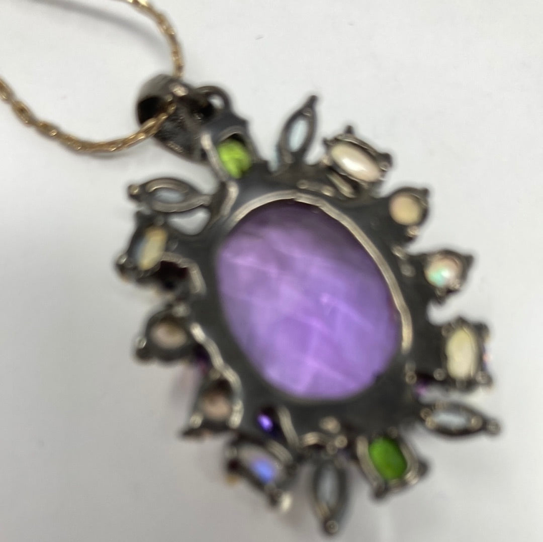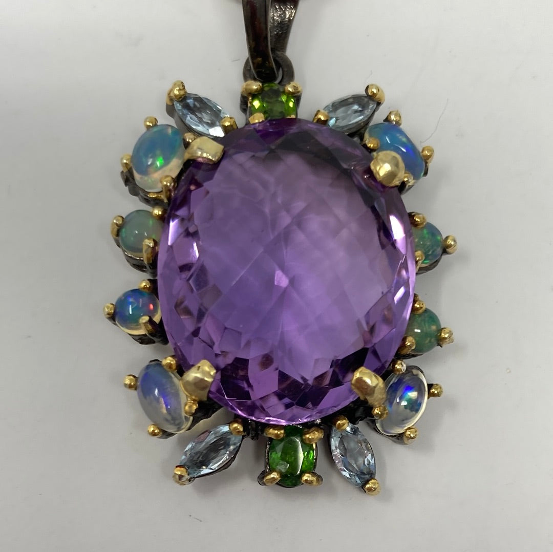 Extra special genuine 16 CTW Amethyst in that unusual checkerboard faceting. This is surrounded by genuine Opals, Russian Chrome Diopside and Peridot. This is a one of a kind masterpiece to accent your décolletage. A stone of this size is perfect to draw subtle attention to all your assets. Bedecked and bejeweled in class. Approximately 1 inch long on a 16” vintage gold chain