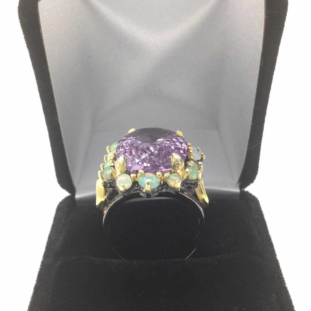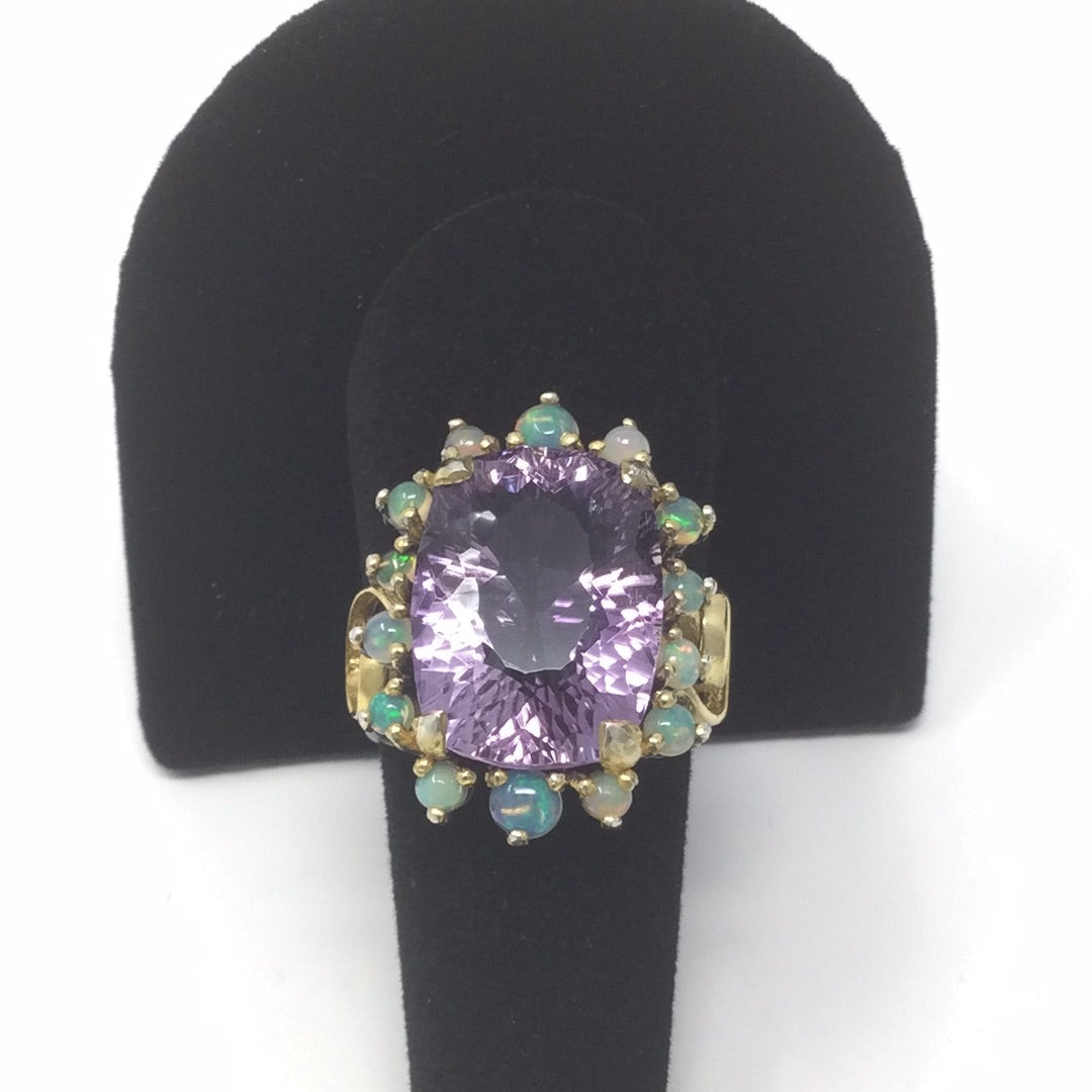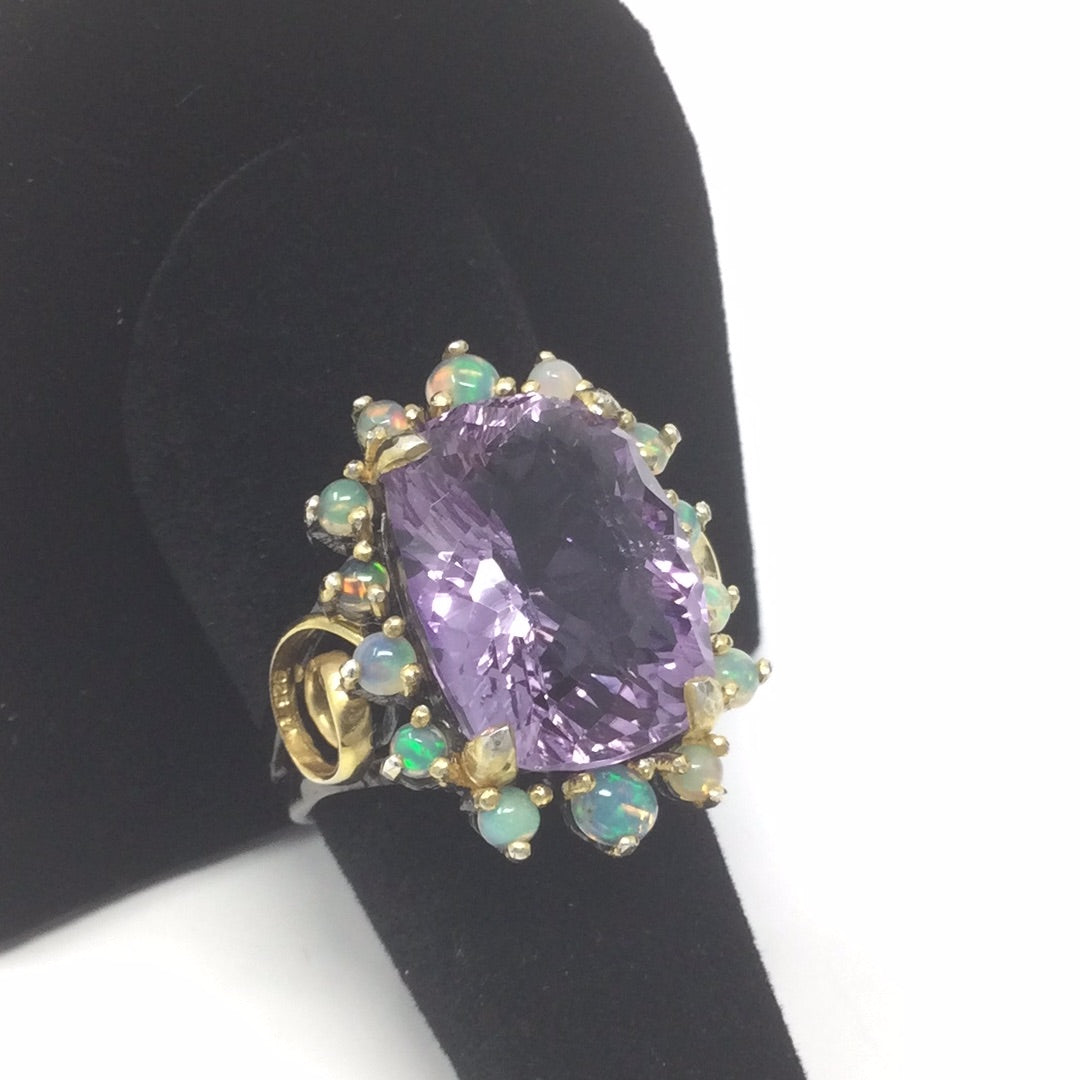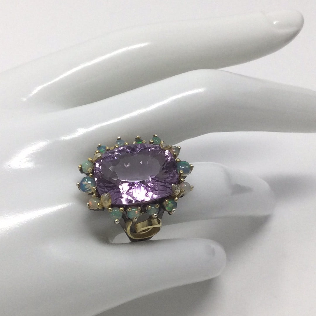 The amazing unique, fancy faceted, high quality Amethyst in remarkable. Measuring in at 18mm by 13mm, approximately 20 CTW. Notice also the fine iridescent natural Opals thar frames this ring, a very high end look. This is a custom made one of a kind artist created piece, only the best gemstones are hand selected for this special collection. All set in .925 sterling silver with a Rhodium overlay and accented with 14K yellow gold. Size 8, Resize at your local jeweler.