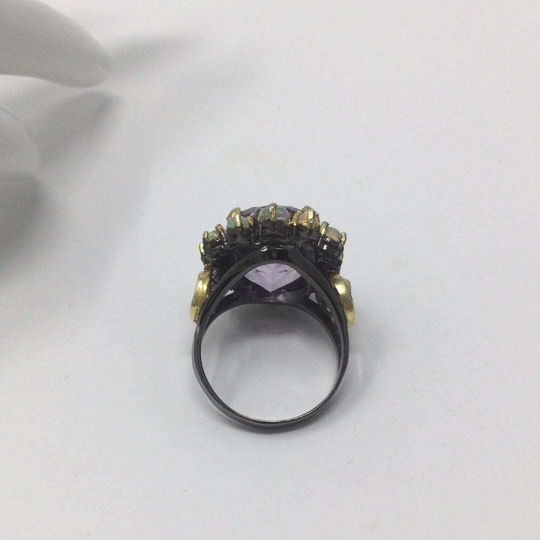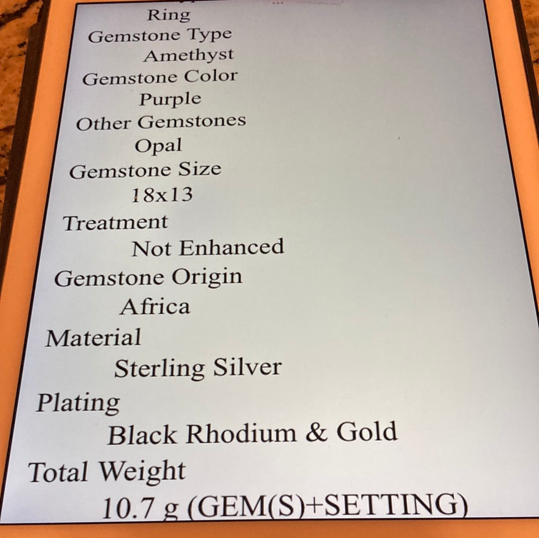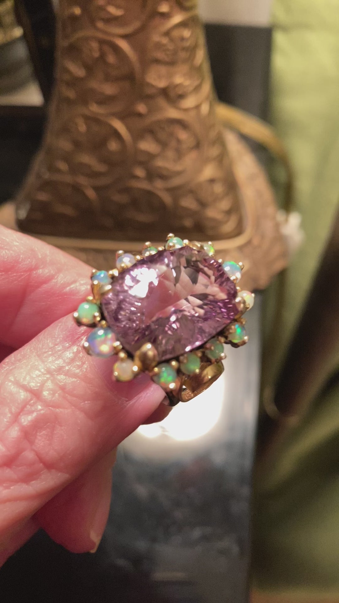The amazing unique, fancy faceted, high quality Amethyst in remarkable. Measuring in at 18mm by 13mm, approximately 20 CTW. Notice also the fine iridescent natural Opals thar frames this ring, a very high end look. This is a custom made one of a kind artist created piece, only the best gemstones are hand selected for this special collection. All set in .925 sterling silver with a Rhodium overlay and accented with 14K yellow gold. Size 8, Resize at your local jeweler.