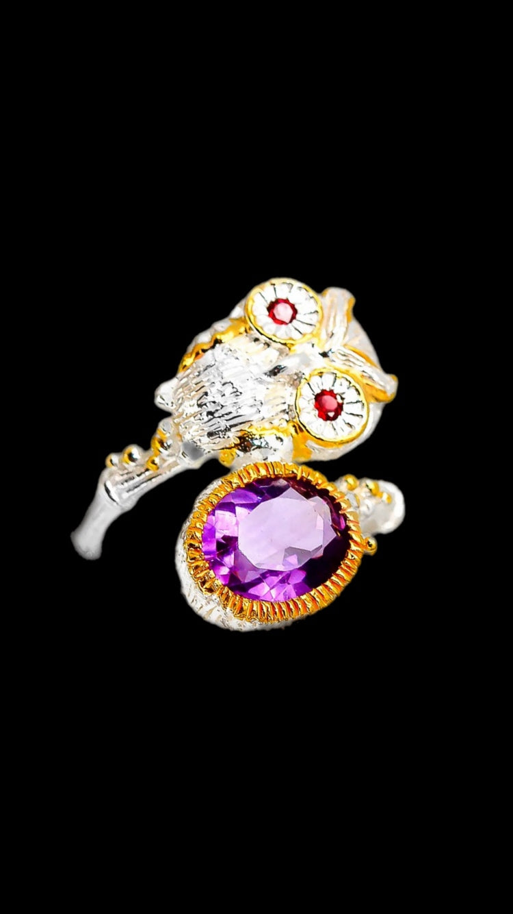 Genuine Amethyst Owl Ring