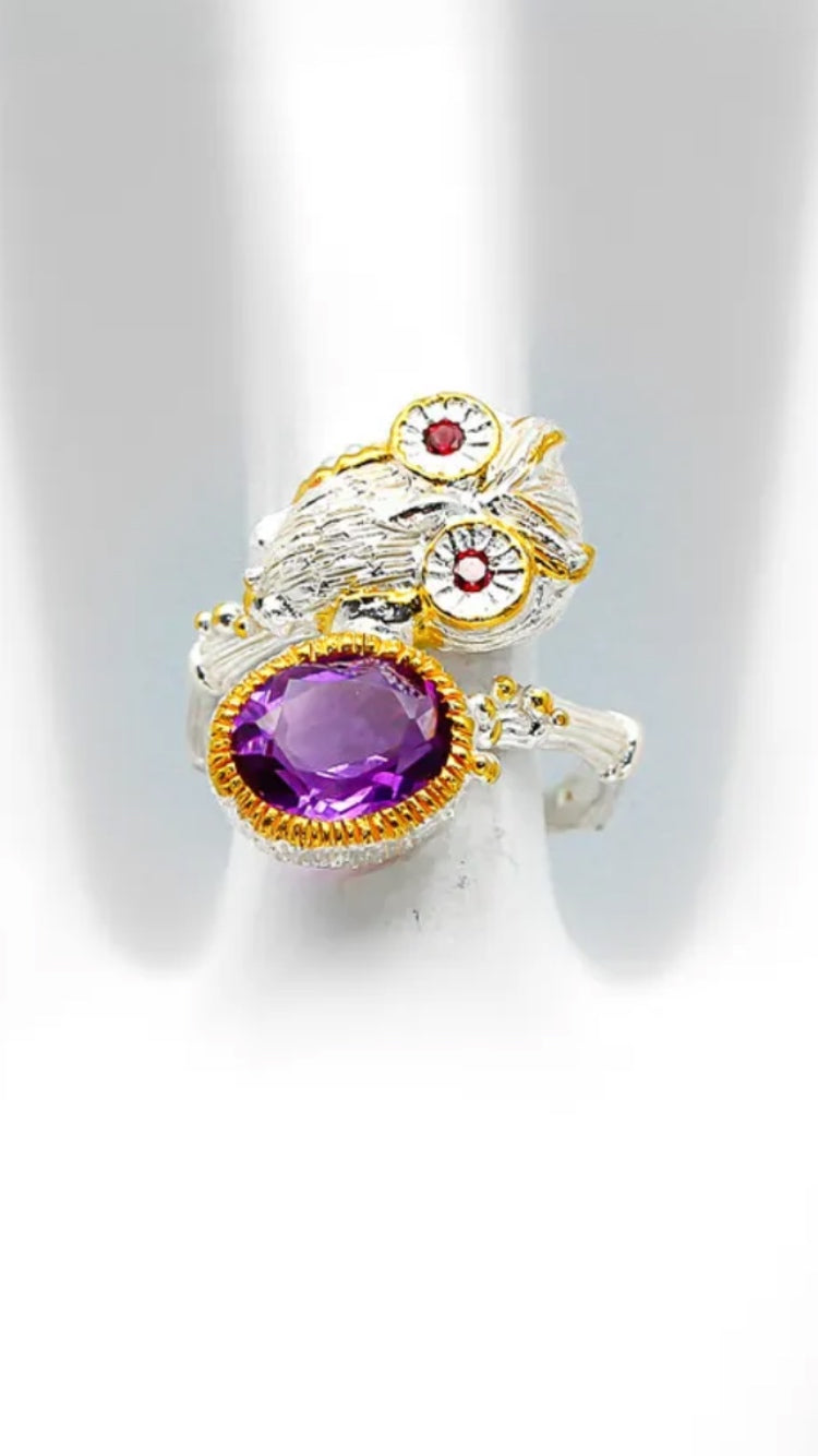 Super sweet and unique , featuring a genuine Amethyst, exceptionally crafted Owl Ring. The eyes are accented with Rhodolite Garnets All crafted in .925 Sterling Silver with yellow gold accents. It truly is a conversation piece. It’s a cute flirty ring. Size 7, 8, 9