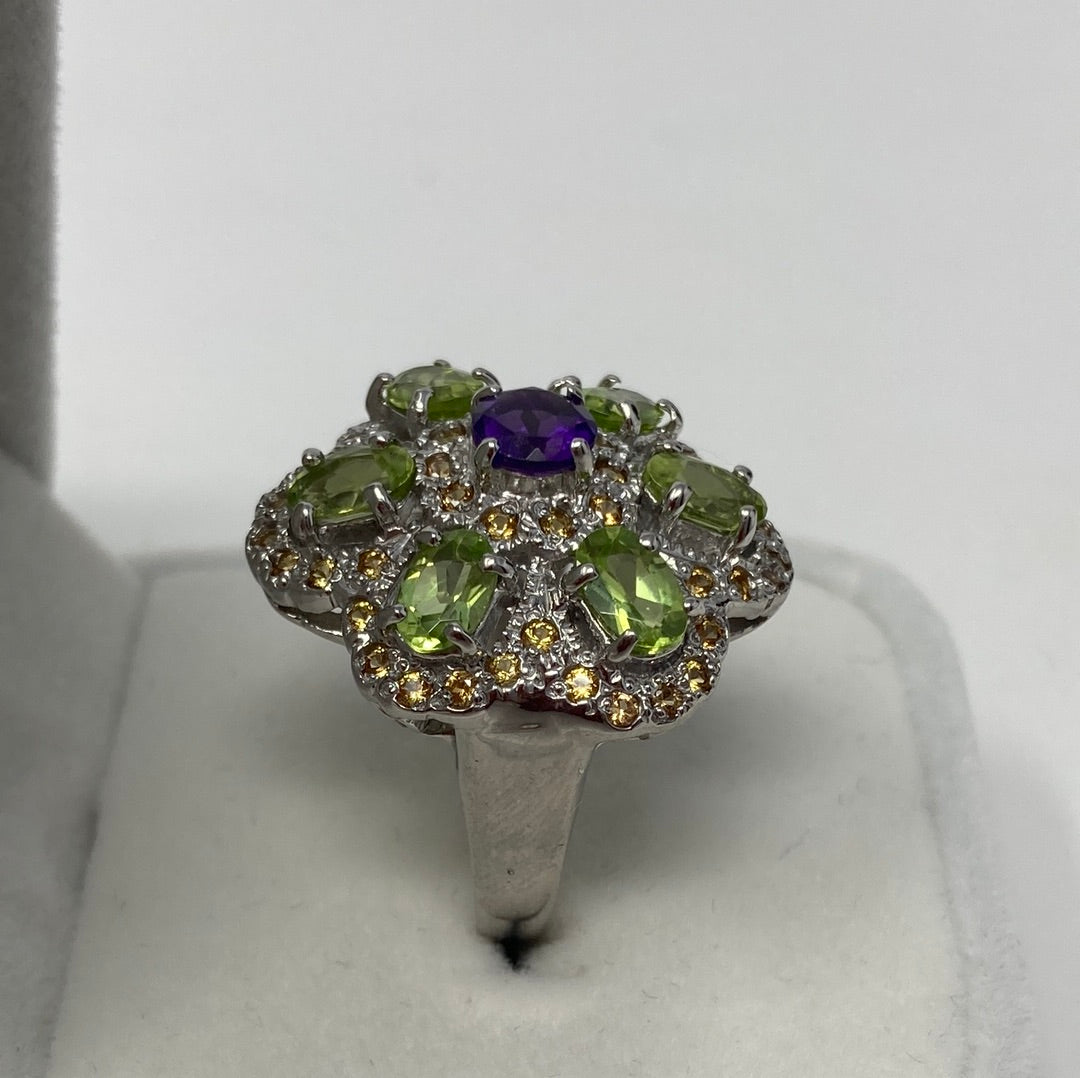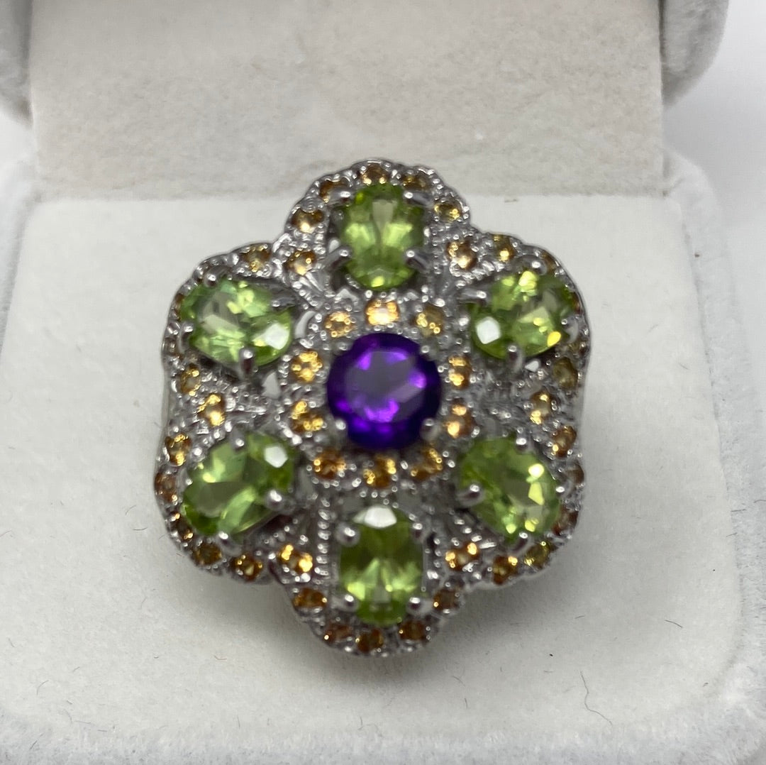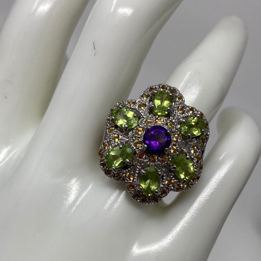 What a beautiful princess style setting this ring features all genuine gemstones. A centerpiece round faceted Amethyst surrounded by Peridot and genuine yellow Sapphires. This ring is like a beautifully composed symphony of gems. A one of a kind, custom made treasure. Set in .925 Sterling silver. Always invest in genuine gemstones. Size 9, Resize at your jeweler or use a ring guard