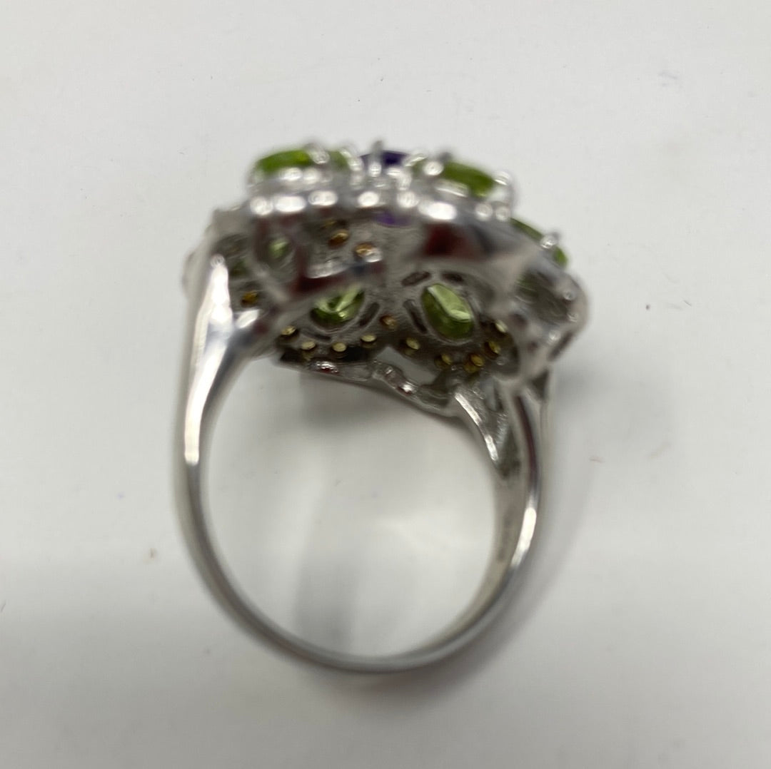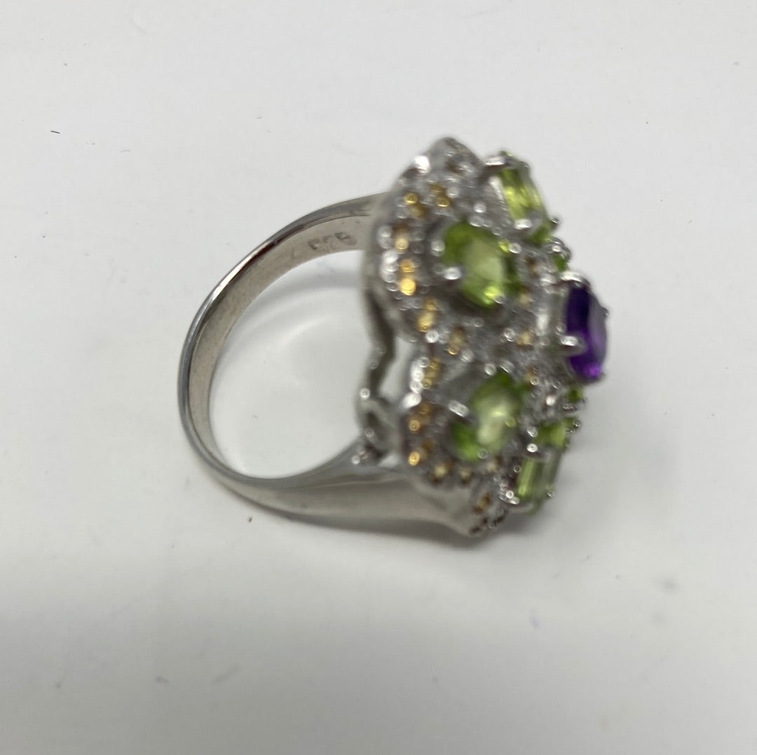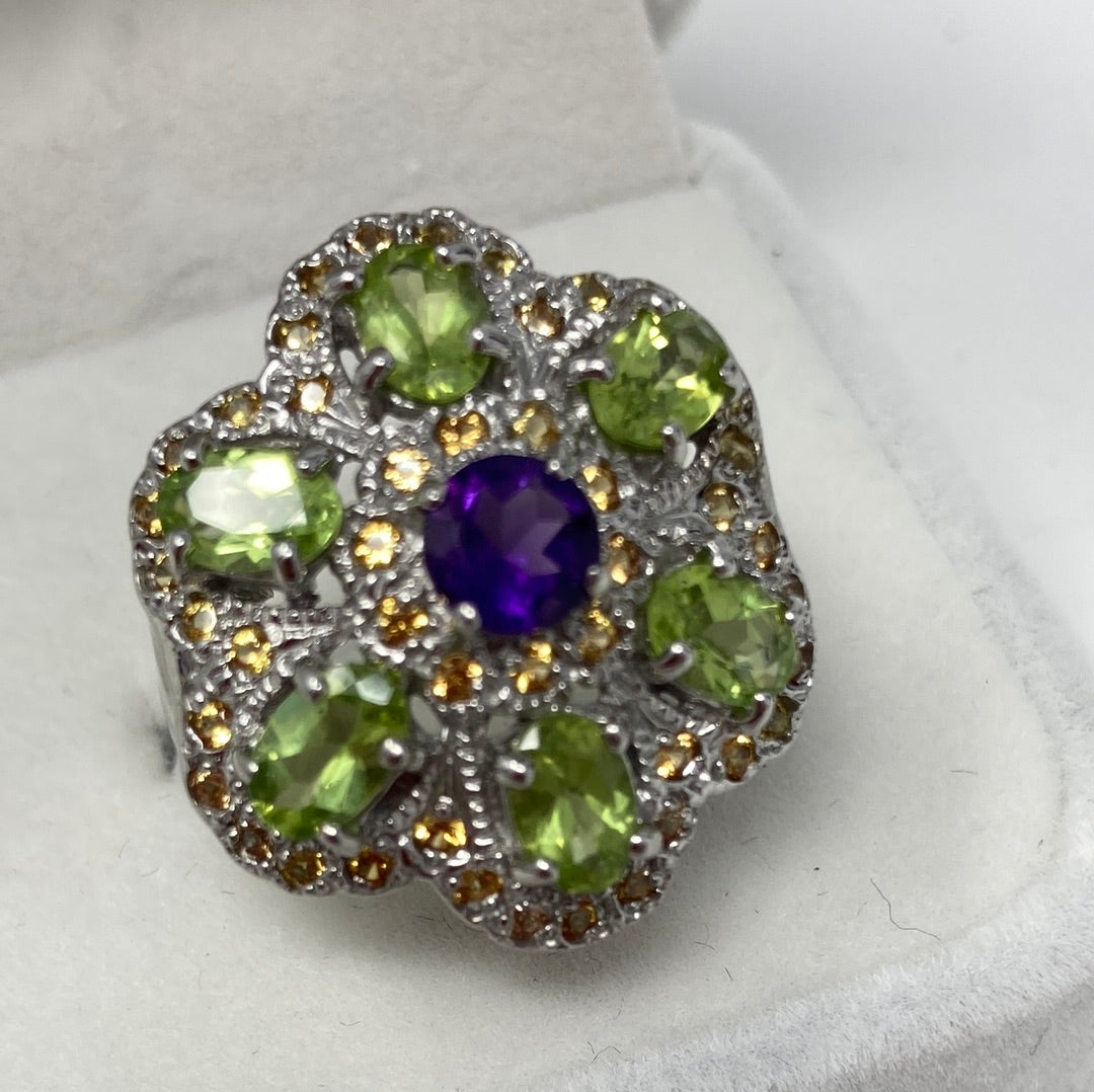 What a beautiful princess style setting this ring features all genuine gemstones. A centerpiece round faceted Amethyst surrounded by Peridot and genuine yellow Sapphires. This ring is like a beautifully composed symphony of gems. A one of a kind, custom made treasure. Set in .925 Sterling silver. Always invest in genuine gemstones. Size 9, Resize at your jeweler or use a ring guard