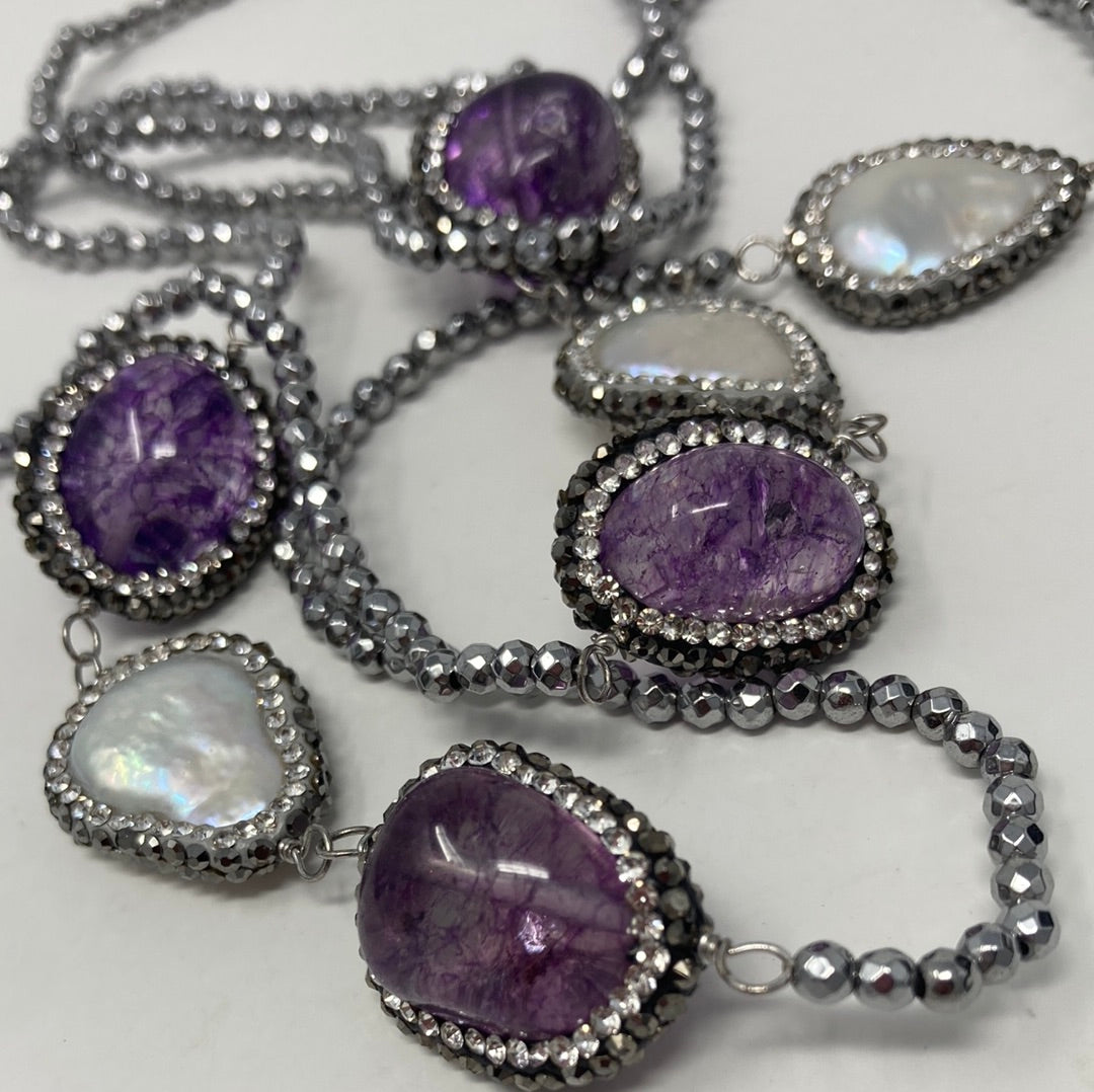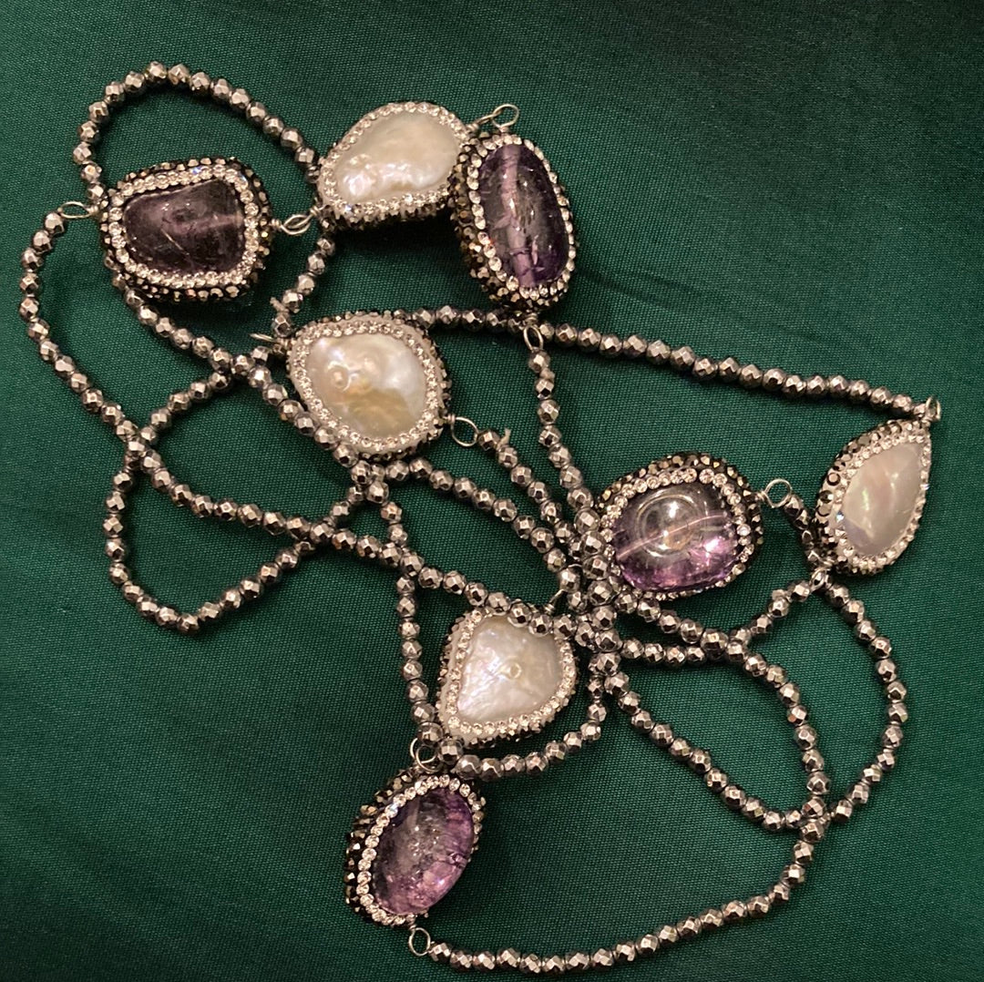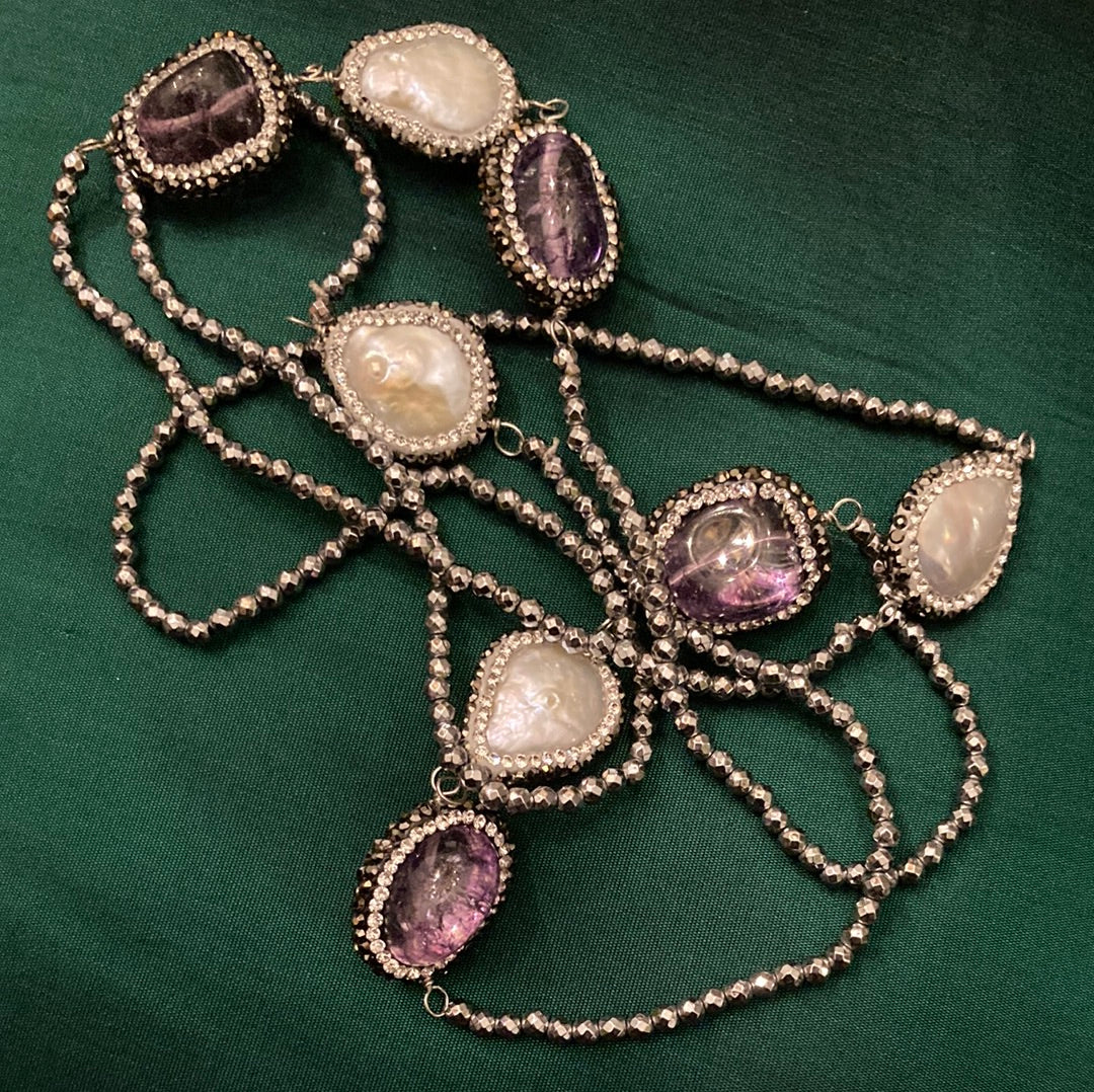 Enchantment and elegance in this long single strand Art Deco inspired necklace. Approximately 40” of sultry seduction, featuring gorgeous genuine Amethysts and large free formed pearls. All strung on silver faceted beads, each gem and pearl is encircled in a beaded embrace of gunmetal and silver beads. Each gem and pearl station is hand wrought then placed onto this seeming endless necklace. The perfect necklace for your inner drama queen.