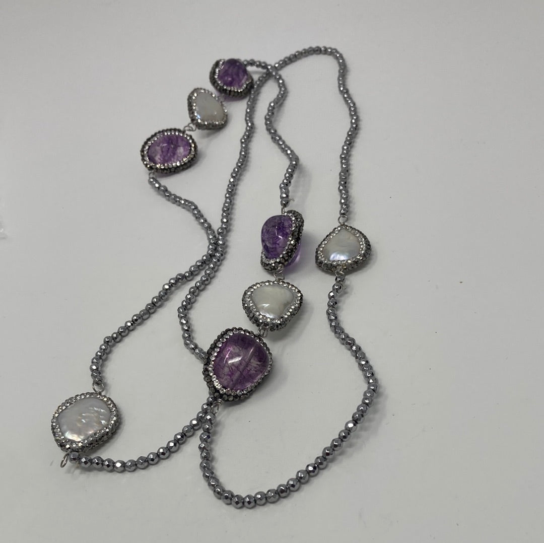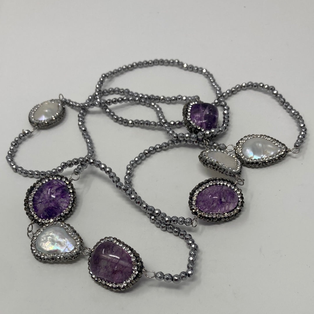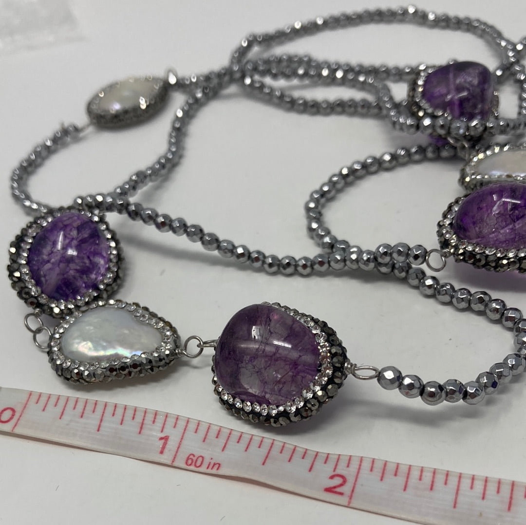 Enchantment and elegance in this long single strand Art Deco inspired necklace. Approximately 40” of sultry seduction, featuring gorgeous genuine Amethysts and large free formed pearls. All strung on silver faceted beads, each gem and pearl is encircled in a beaded embrace of gunmetal and silver beads. Each gem and pearl station is hand wrought then placed onto this seeming endless necklace. The perfect necklace for your inner drama queen.