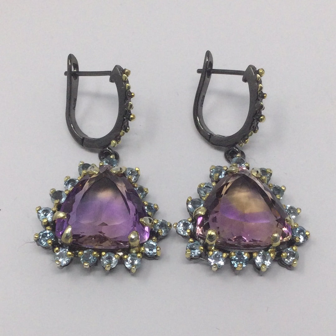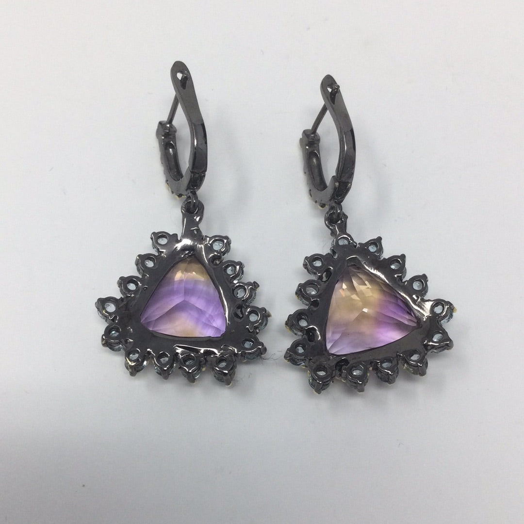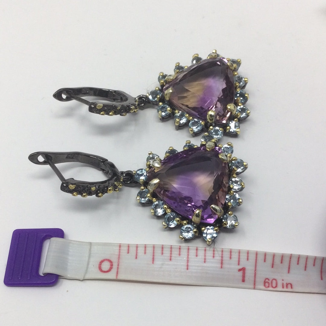 Here’s a combined 37 CTW of genuine faceted Ametrines, a very coveted unique faceted trillion cut. The color dispersion is remarkable, framed in Genuine blue Topaz, these are sure to be a favorite way to frame your face in elegance. These are a one of a kind custom made pair of earrings crafted in .925 sterling silver with a Rhodium overlay accented with yellow gold. Always invest in genuine gemstones and be confident these are not mass produced for large jewelry store retailers with big overhead. Here quality and artistic, fine craftsmanship is what matters. Approximately a little less than 1” Long