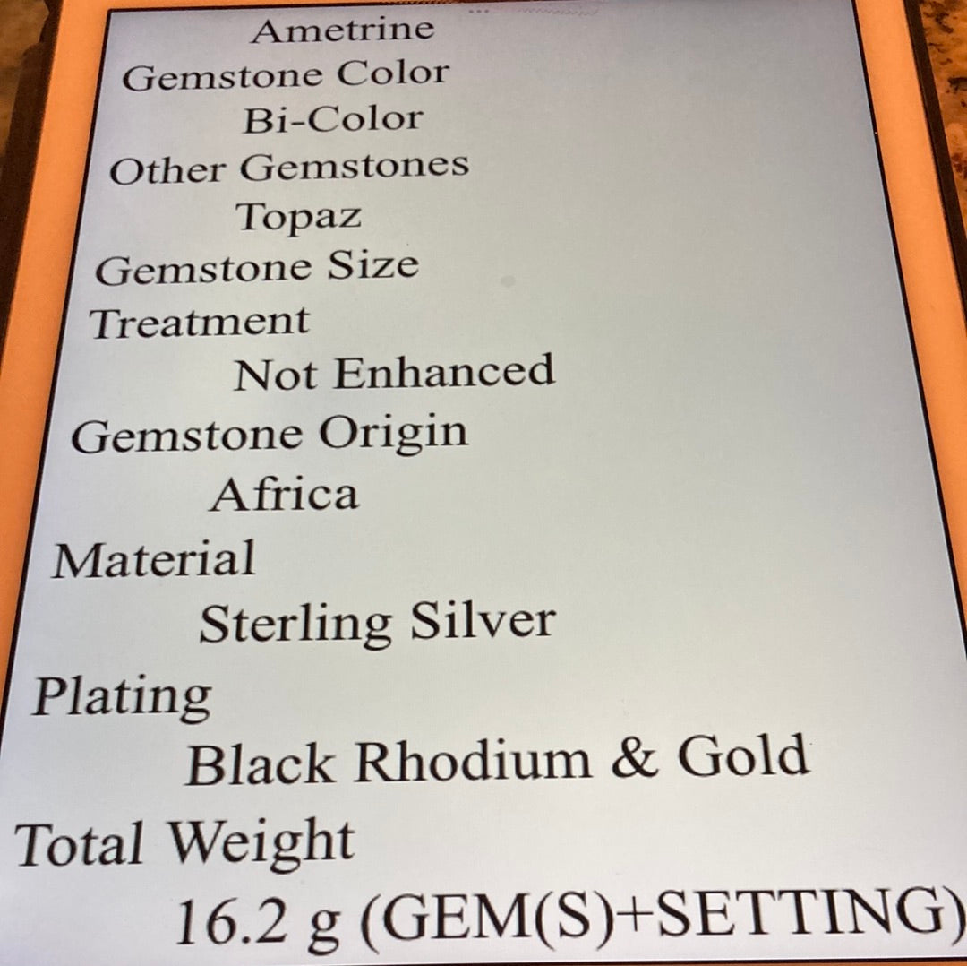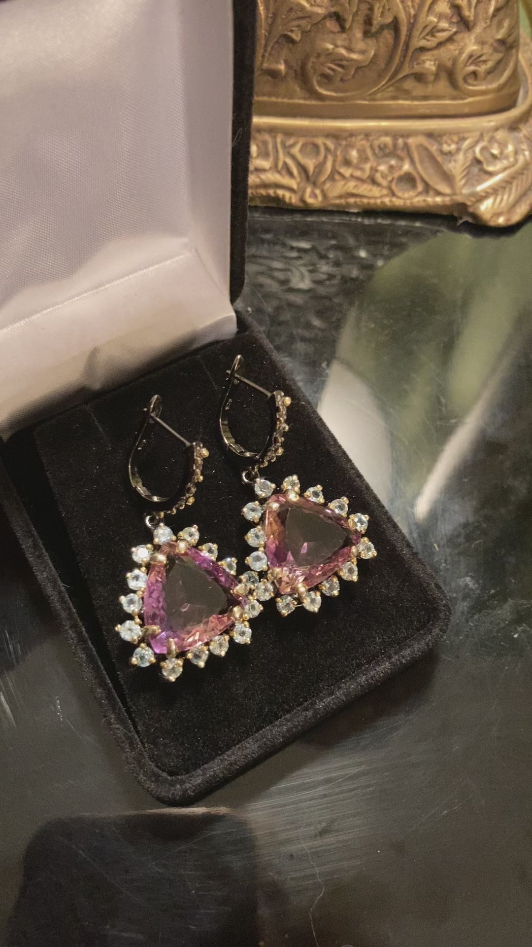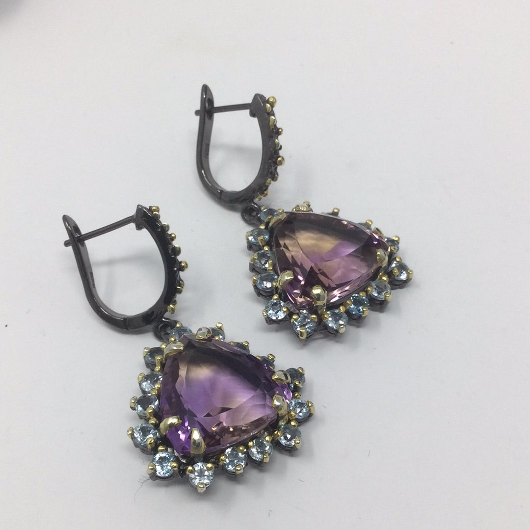 Here’s a combined 37 CTW of genuine faceted Ametrines, a very coveted unique faceted trillion cut. The color dispersion is remarkable, framed in Genuine blue Topaz, these are sure to be a favorite way to frame your face in elegance. These are a one of a kind custom made pair of earrings crafted in .925 sterling silver with a Rhodium overlay accented with yellow gold. Always invest in genuine gemstones and be confident these are not mass produced for large jewelry store retailers with big overhead. Here quality and artistic, fine craftsmanship is what matters. Approximately a little less than 1” Long