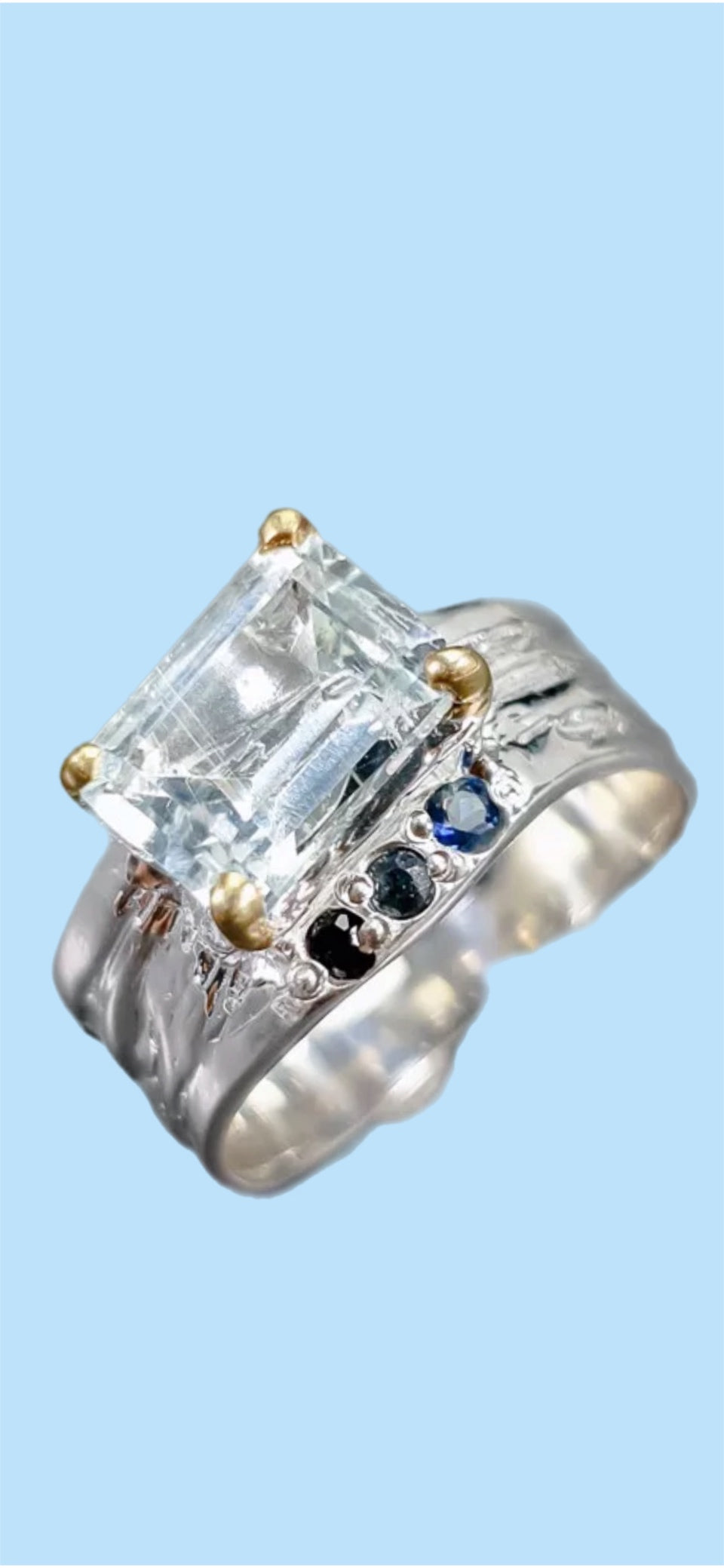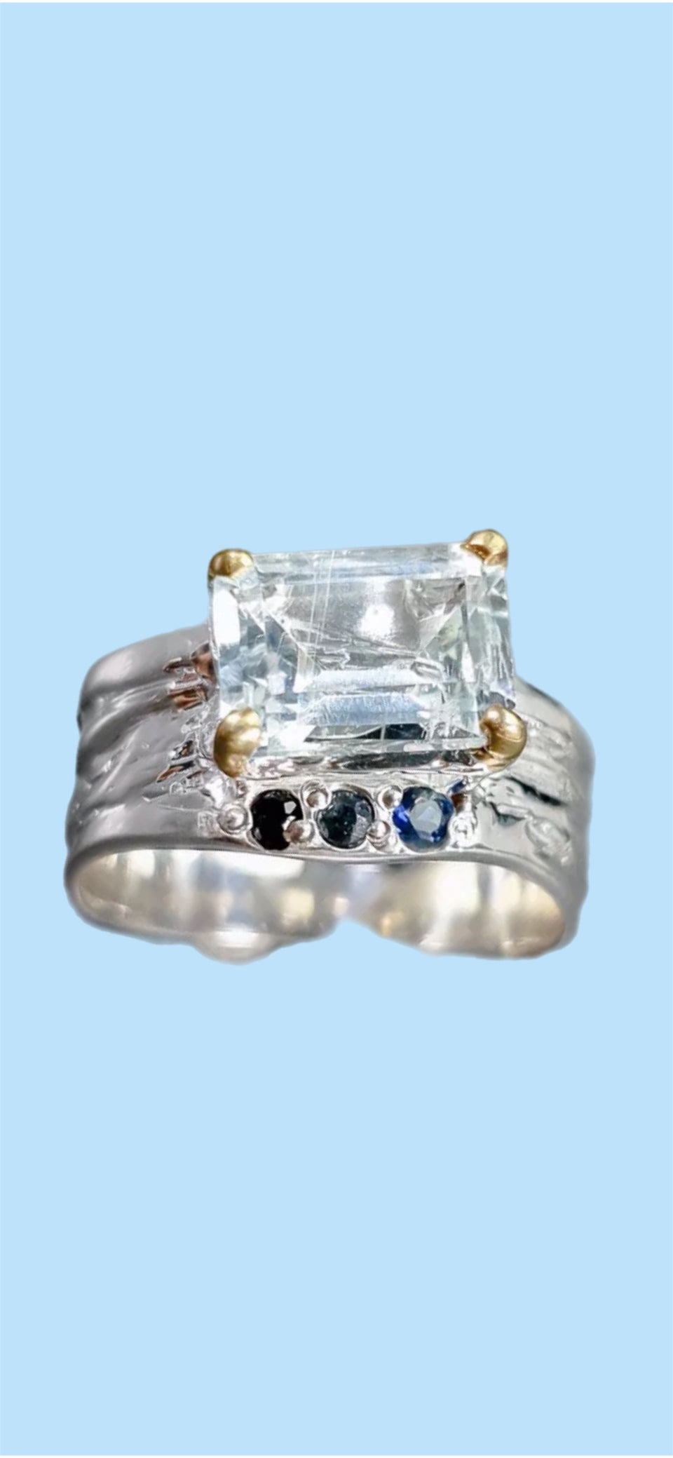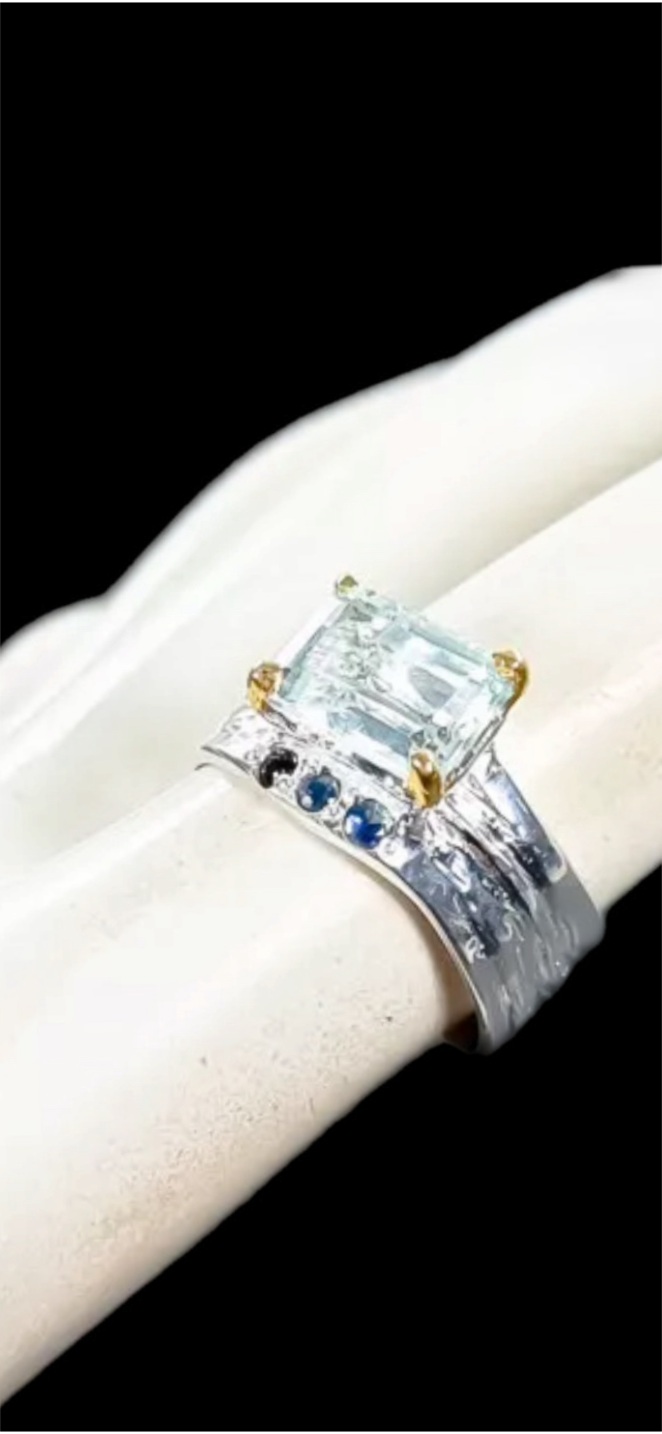 A superb Genuine Aquamarine in a highly desirable emerald cut faceting. This gem measures 10mm by 8mm approximately 4 CTW and accented with Genuine Sapphires. Set in .925 Sterling silver with yellow gold accents. This is a custom crafted, one of a kind work of art to wear. Genuine Aquamarines always increase in value. Size 7 1/2