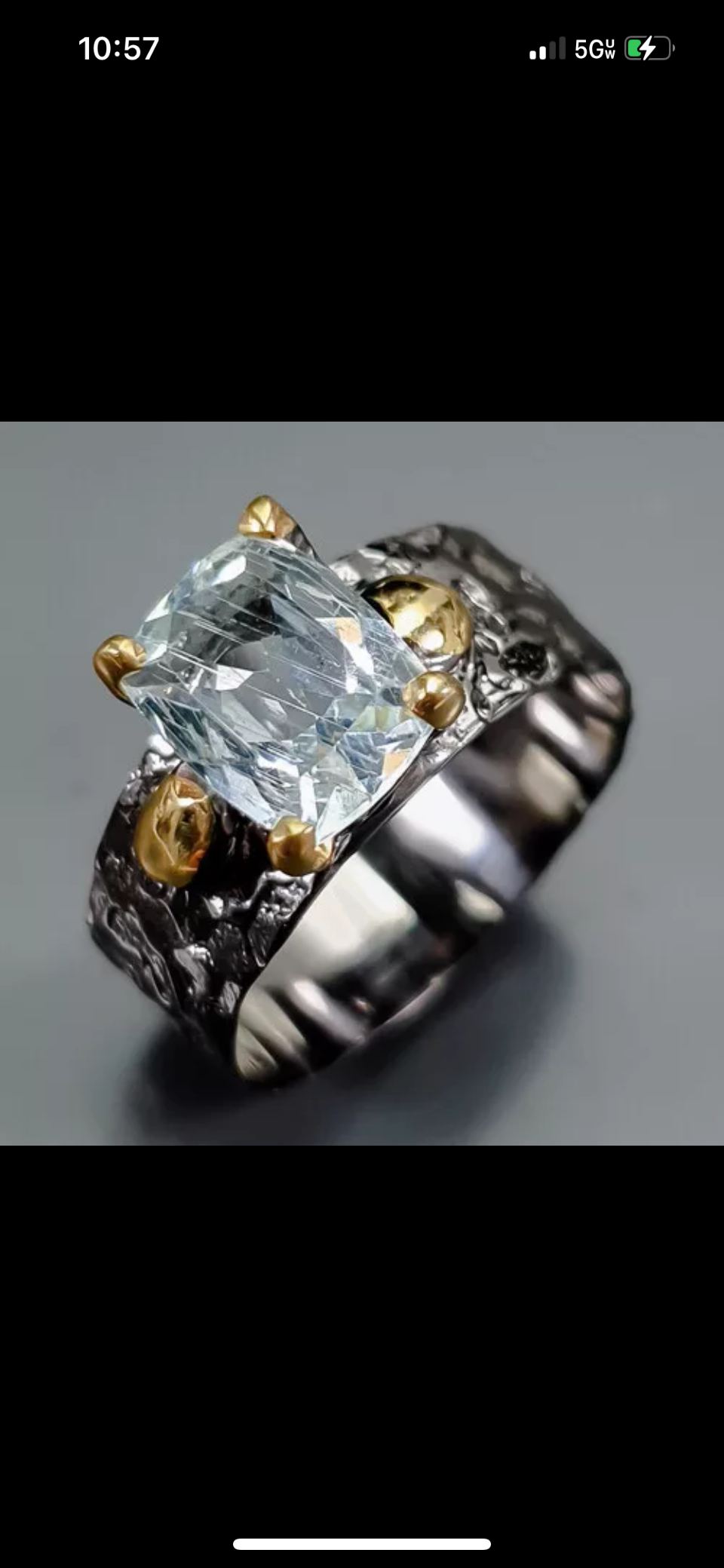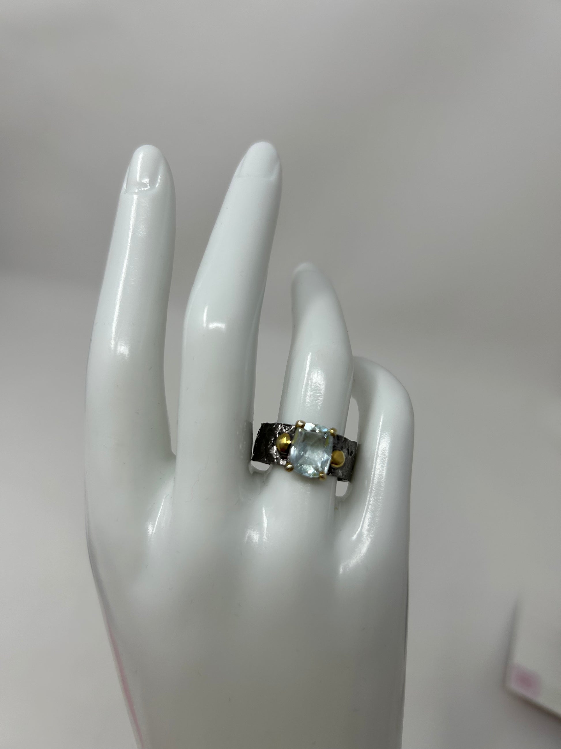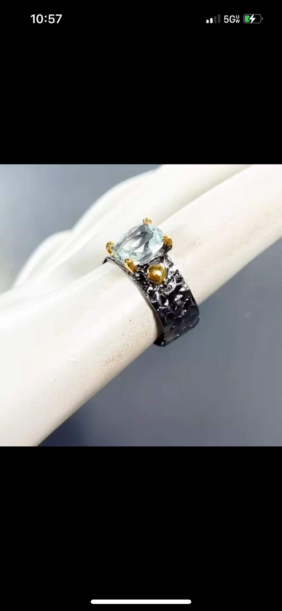 A genuine 10mm by 8mm Aquamarine set in .925 Sterling Silver with a Black Rhodium & yellow Gold accents. This is a one of a kind and not mass produced Aquamarine is highly desirable and an investment gemstone, famous for its watery, crystalline blue. A natural gemstone that increases in value making it a special piece for your heirloom collection. Size 8 1/2 can be resized at your jeweler.