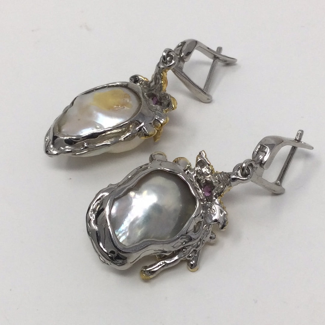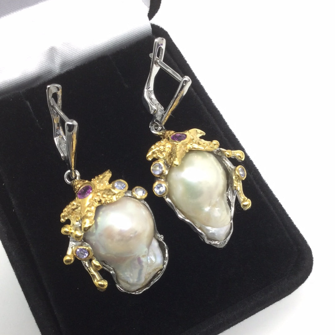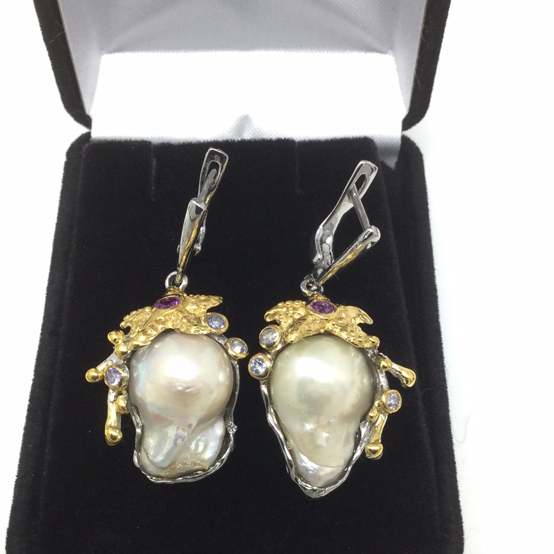 Baroque Pearls were treasured throughout history, set into the crowns of royals. These are top quality genuine Baroque Pearls, notice the highly desirable luster in these magnificent specimens. Accented with Genuine Rhodolite Garnets & Tanzanite, set in .925 sterling silver with 14K yellow gold accents in this unique one of a kind earrings. Will be a special treasure for generations to come.