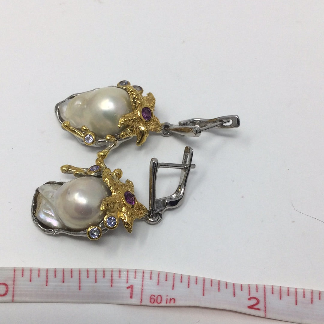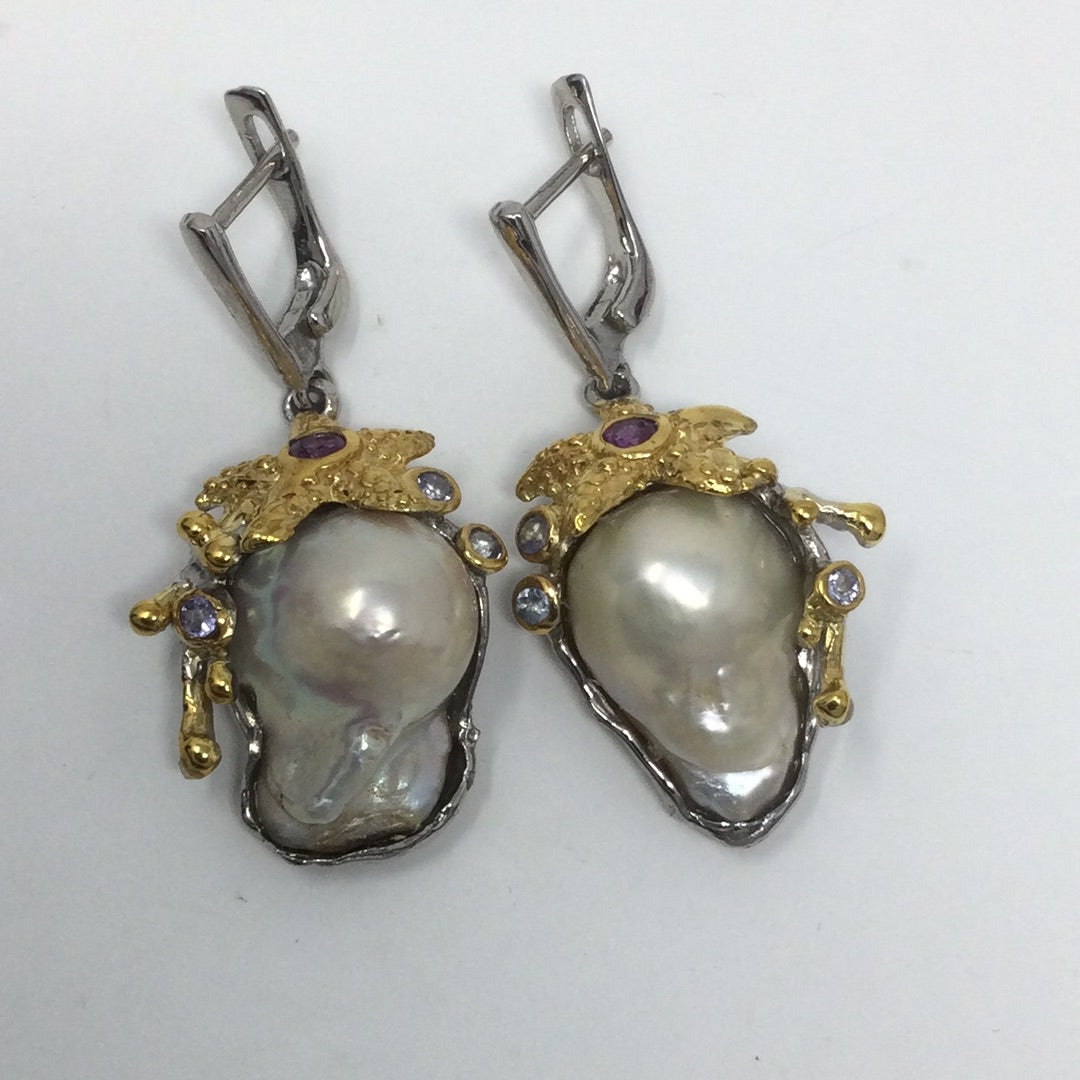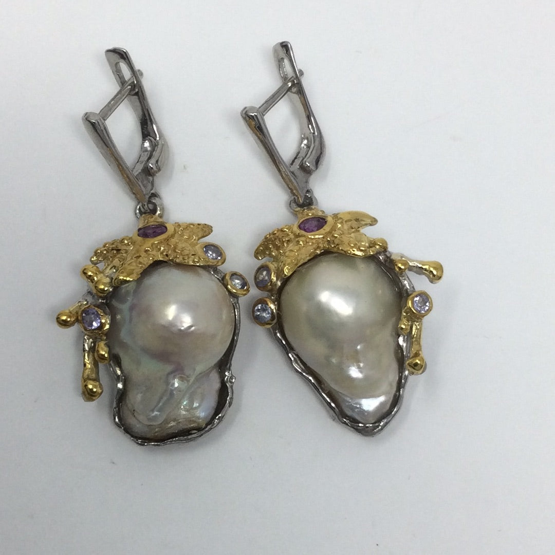 Baroque Pearls were treasured throughout history, set into the crowns of royals. These are top quality genuine Baroque Pearls, notice the highly desirable luster in these magnificent specimens. Accented with Genuine Rhodolite Garnets & Tanzanite, set in .925 sterling silver with 14K yellow gold accents in this unique one of a kind earrings. Will be a special treasure for generations to come.