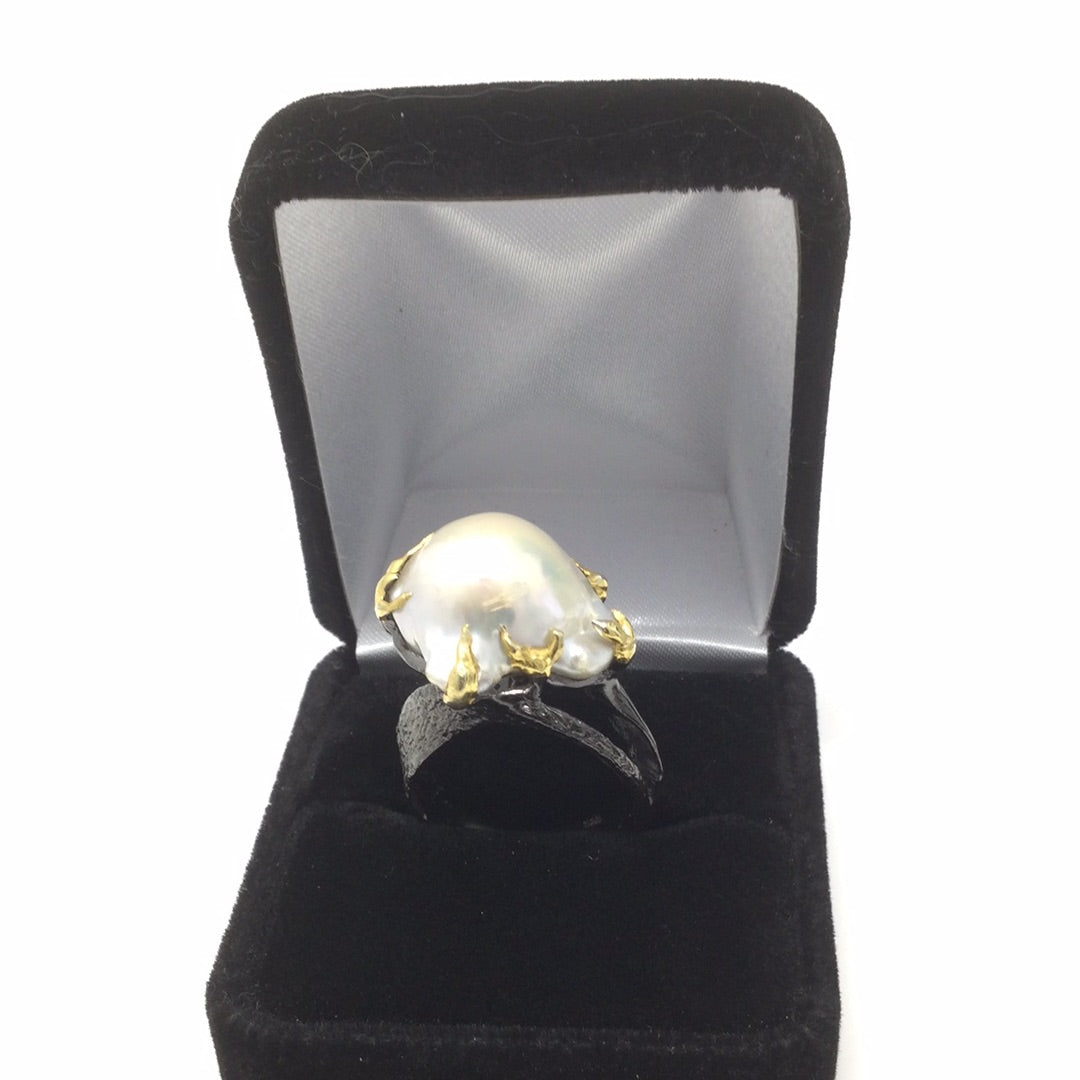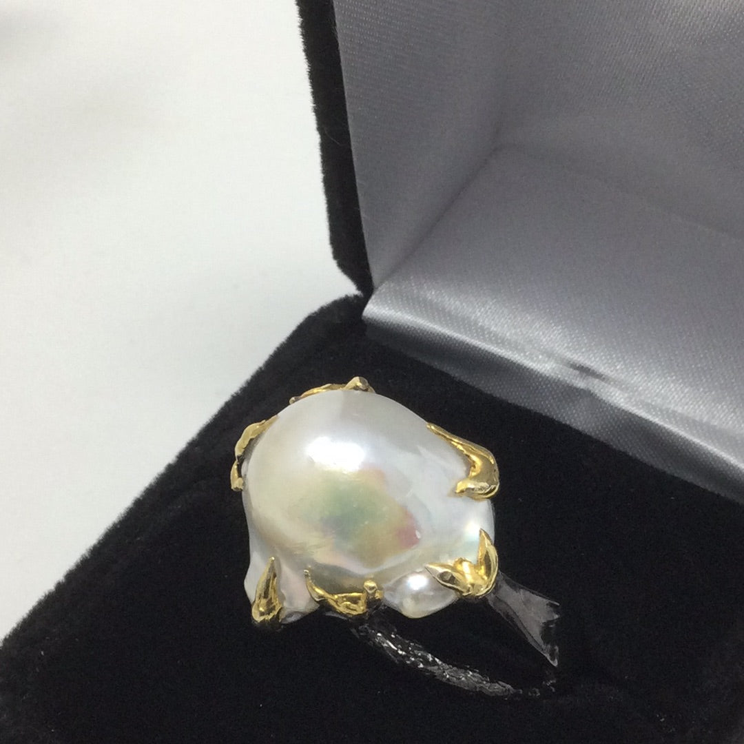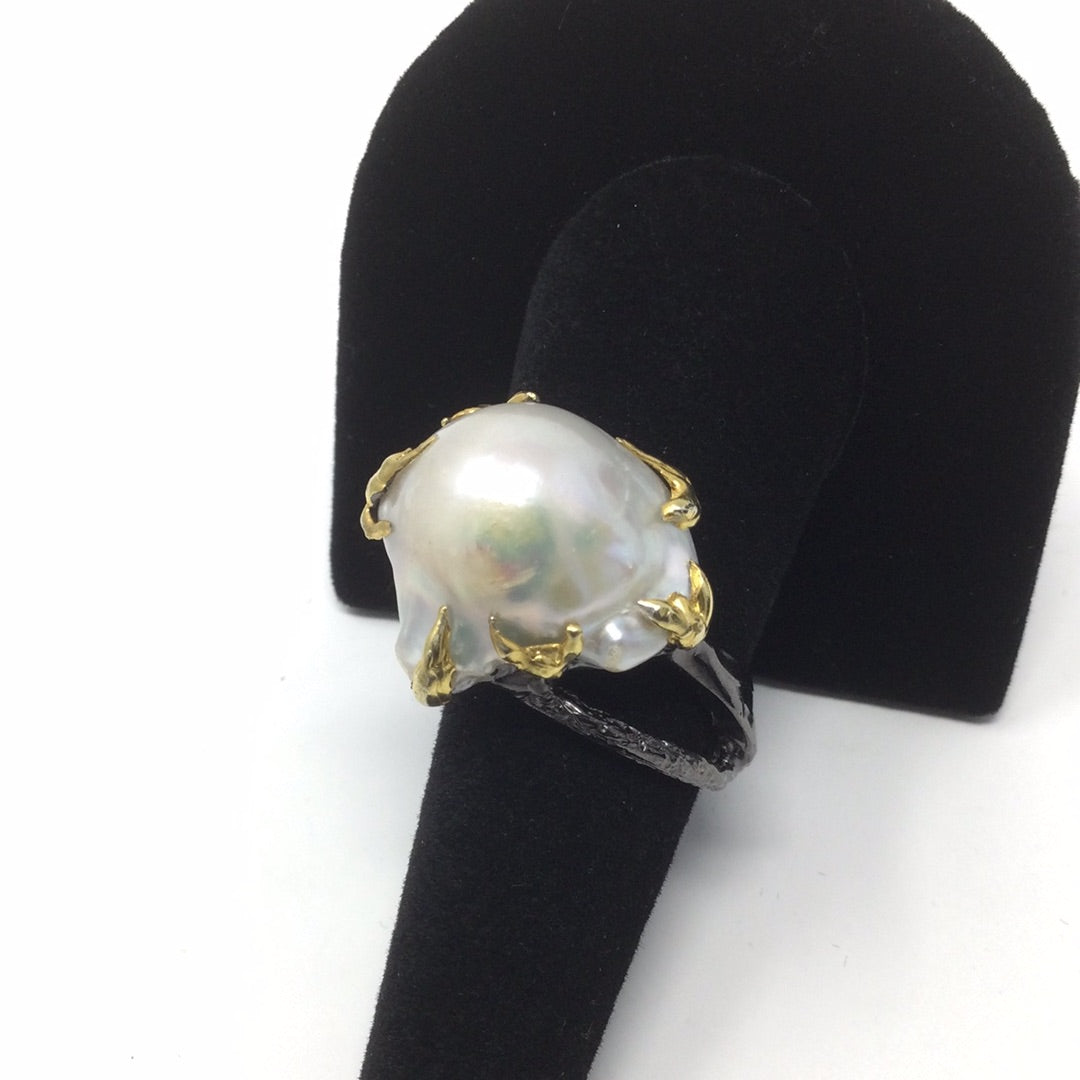 The luster on this natural 18mm by 16mm south sea Baroque Pearl is just luscious. This setting was custom made just for this fine quality Baroque Pearl, set in .925 sterling silver with a Rhodium overlay and accented with 14K yellow gold overlay too. I love the claw like prongs that securely embrace the pearl. This elegant piece is unique fine that will be future heirloom jewelry for your family. Size 8, Resize at your jeweler.