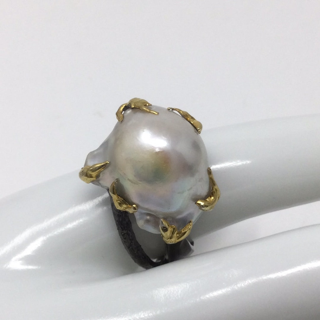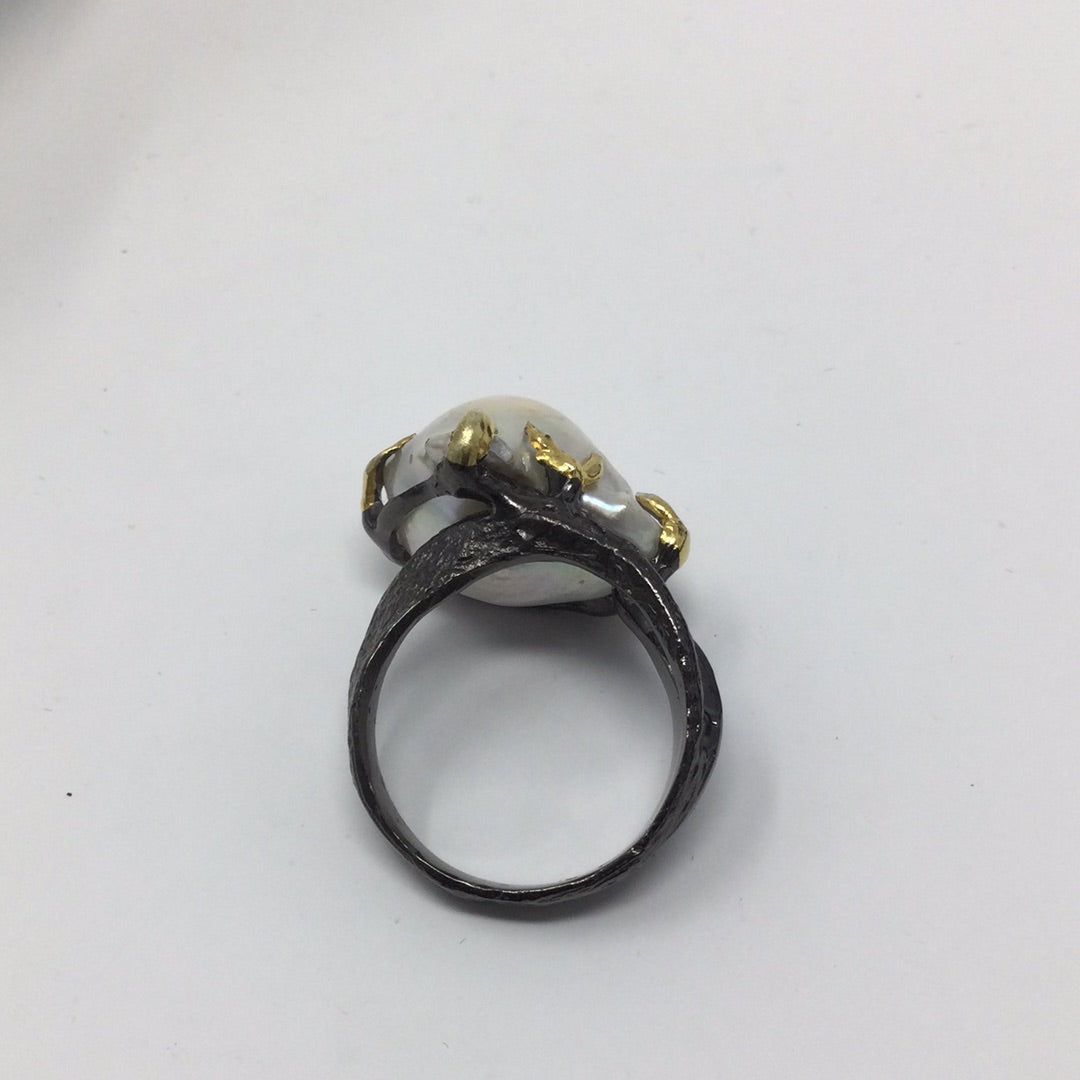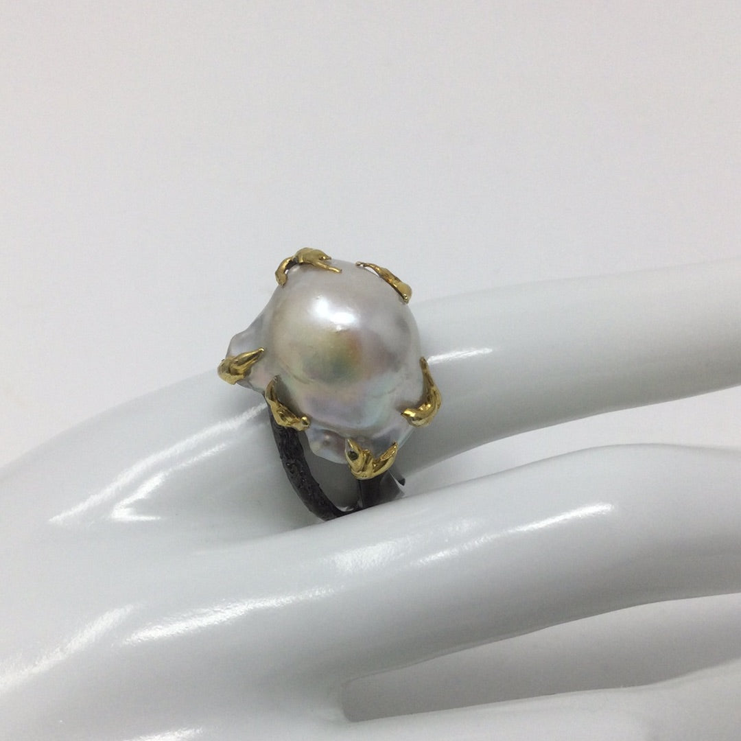 The luster on this natural 18mm by 16mm south sea Baroque Pearl is just luscious. This setting was custom made just for this fine quality Baroque Pearl, set in .925 sterling silver with a Rhodium overlay and accented with 14K yellow gold overlay too. I love the claw like prongs that securely embrace the pearl. This elegant piece is unique fine that will be future heirloom jewelry for your family. Size 8, Resize at your jeweler.