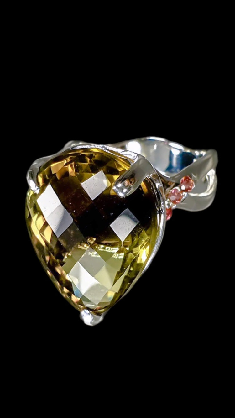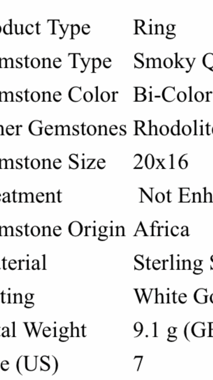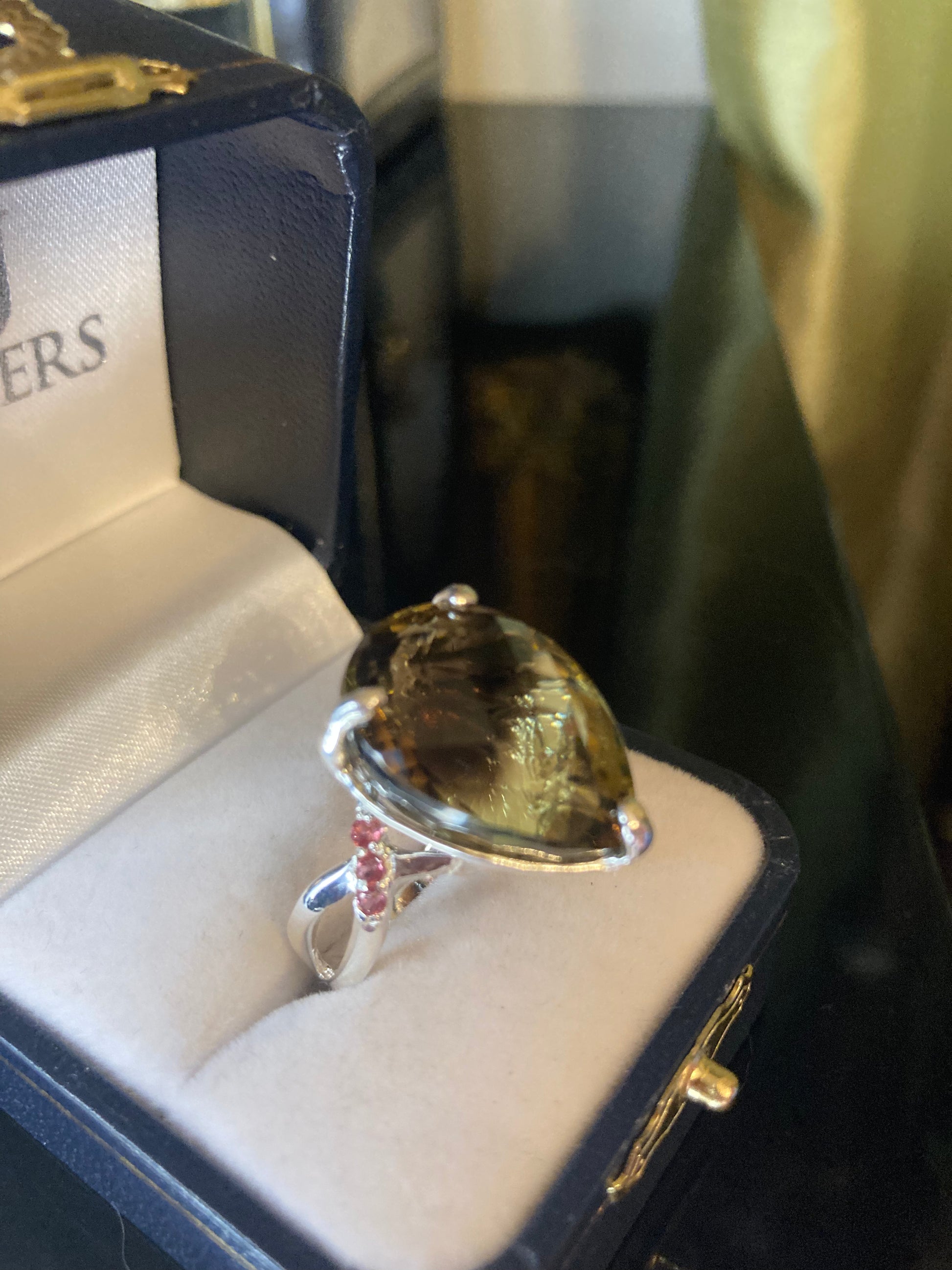 This genuine Bi -Color Smokey Quartz was hand selected for its rare, natural coloration. It’s is a one of a kind specimen that is crafted in .925 Sterling Silver, accented with Genuine Rhodolite Garnets. A treasure that will get lots of admiration and comments because it is a collectors gemstone. Size 7, Resize at your jeweler