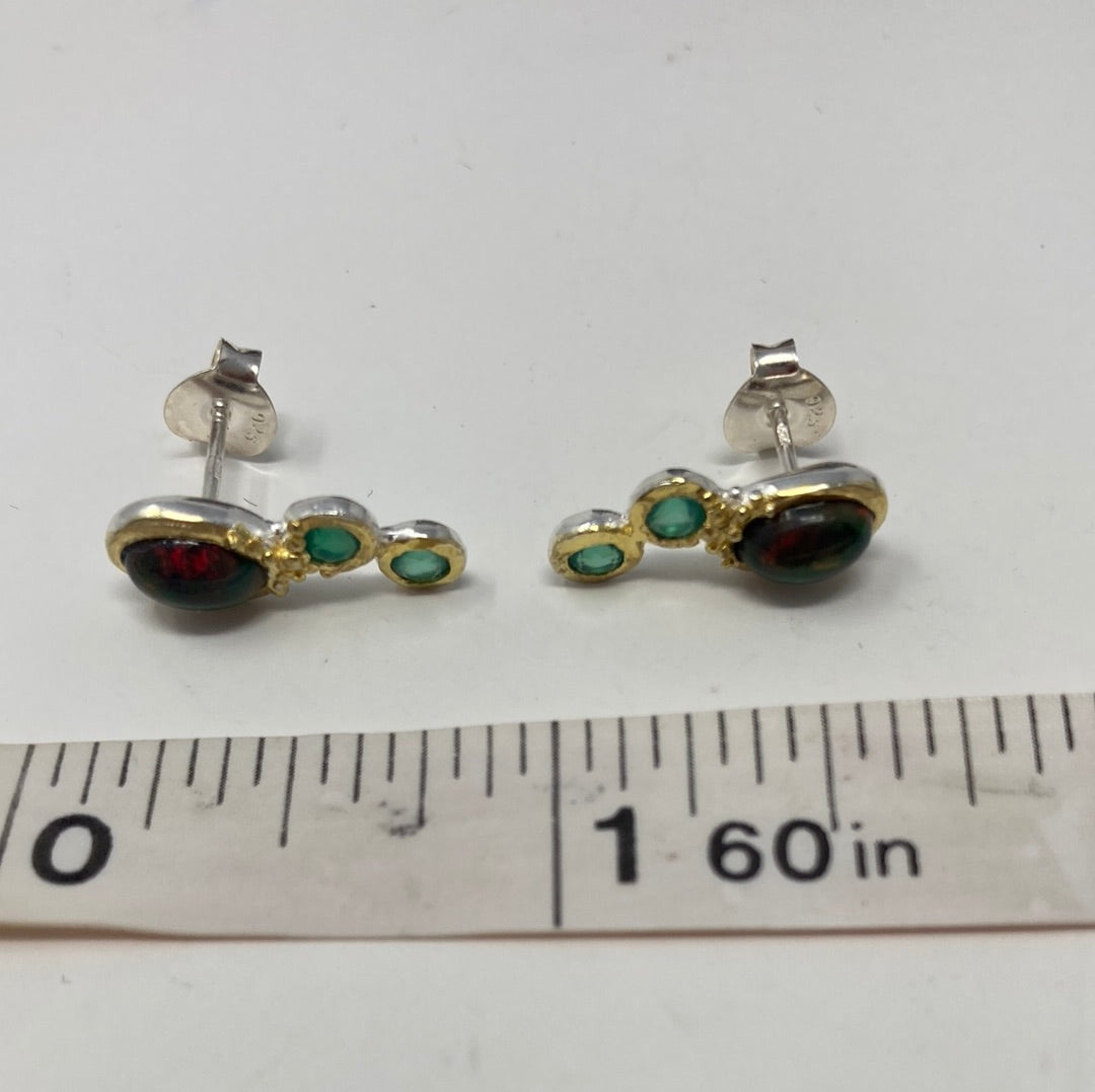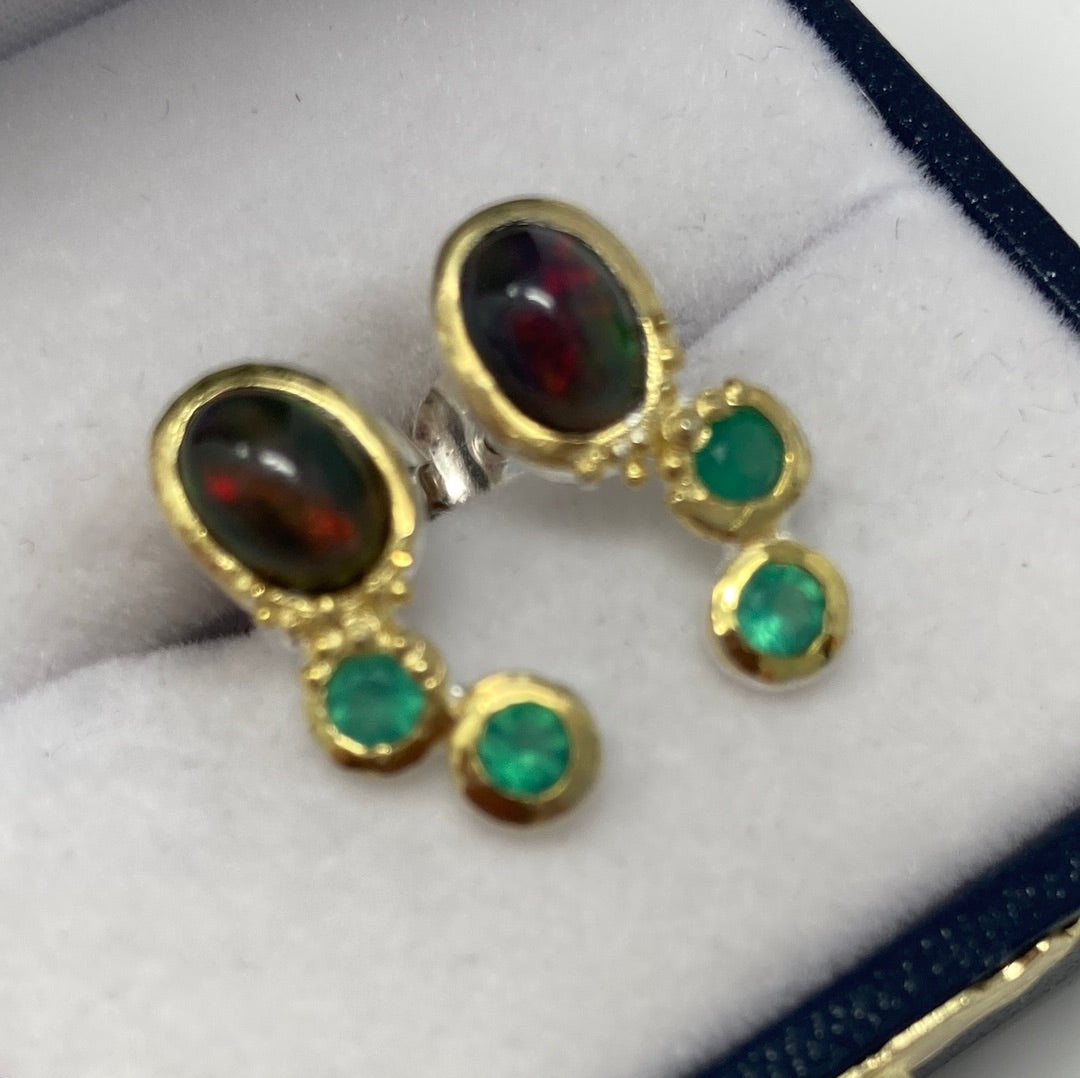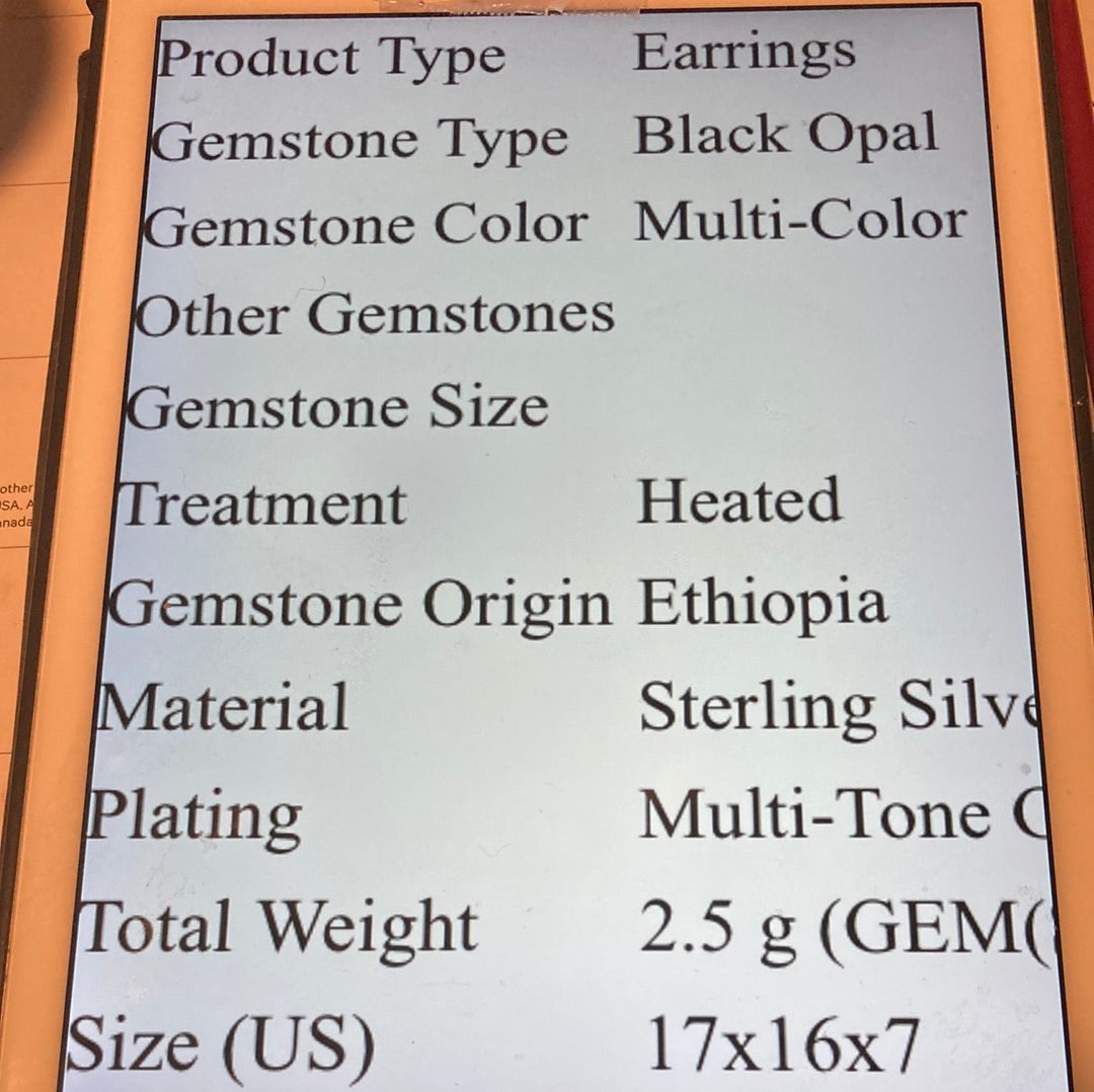 Very alluring and feminine with an edgy look. These mysterious Genuine Black Opals are set in .925 sterling silver with a white and yellow gold overlay. Iridescence is fascinating and the colors seem to have a life of their own. Elegant and classy, just like you and what a lovely way to frame your face.
