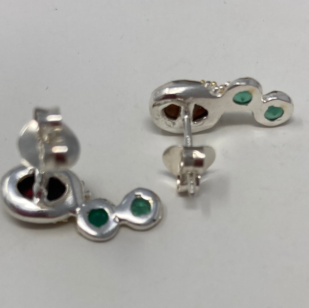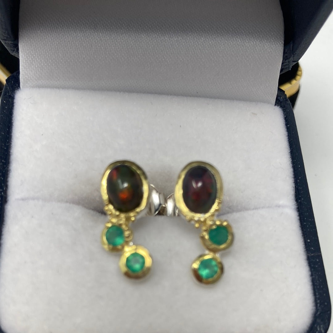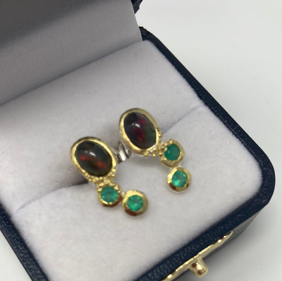Very alluring and feminine with an edgy look. These mysterious Genuine Black Opals are set in .925 sterling silver with a white and yellow gold overlay. Iridescence is fascinating and the colors seem to have a life of their own. Elegant and classy, just like you and what a lovely way to frame your face.