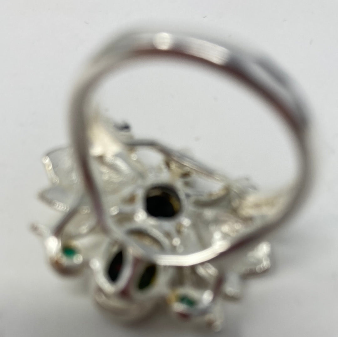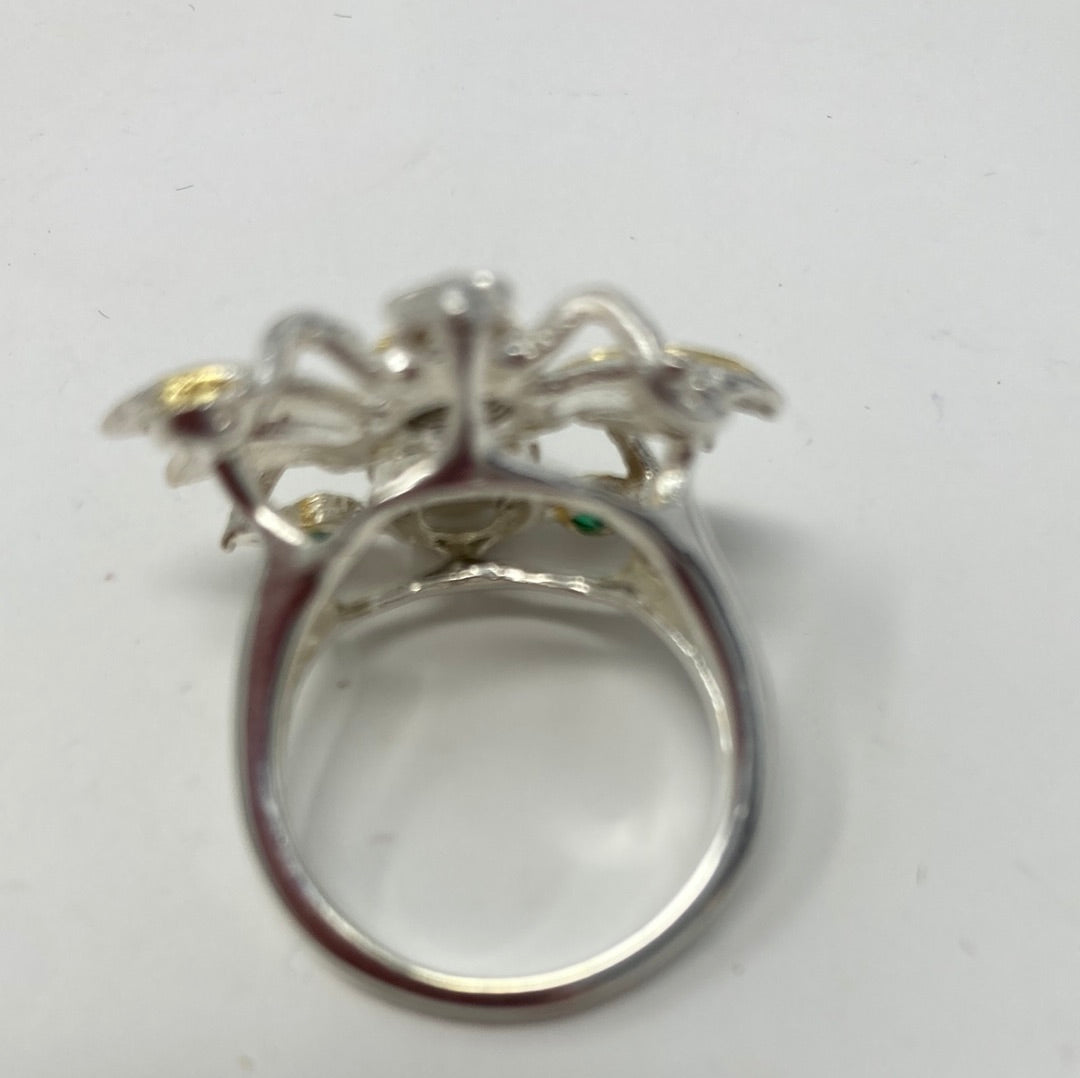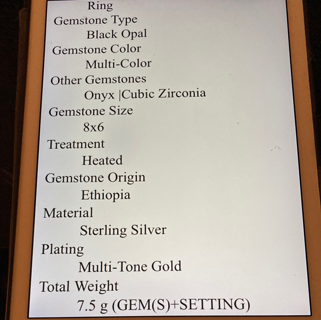 Exquisite genuine 8mm by 6mm fiery Black Opals accent with genuine Green Onyx too this is a one of a kind custom made ring. Crafted in . 925 sterling silver with white and yellow gold overlay. Notice the detailing in the design, intricate and has the look of a museum piece celebrating our natural history. This is a forever ring for your future family heirloom collection. Size 7, Resize at your jeweler or use a ring guard.