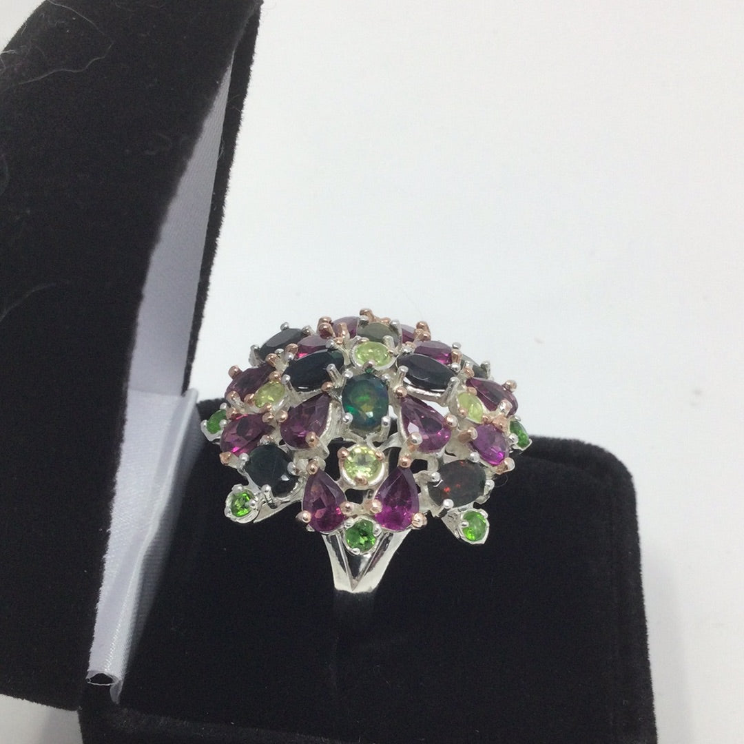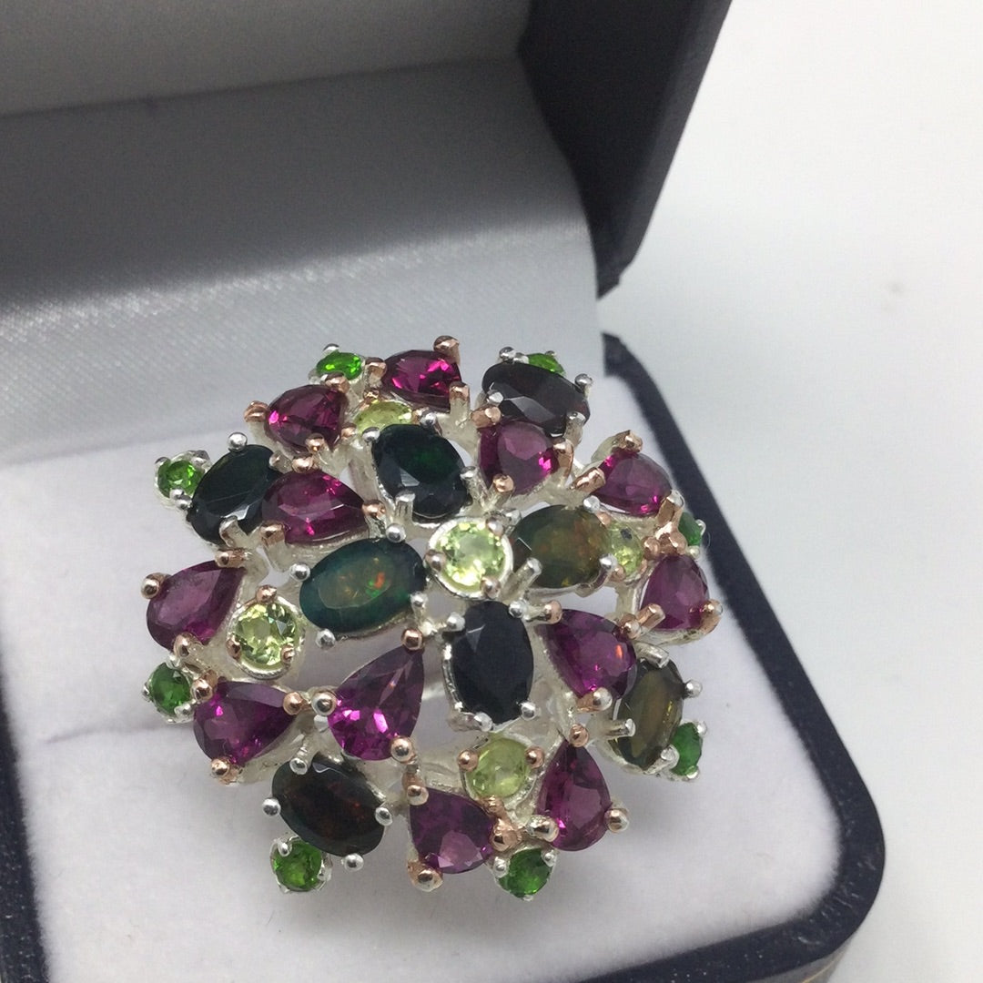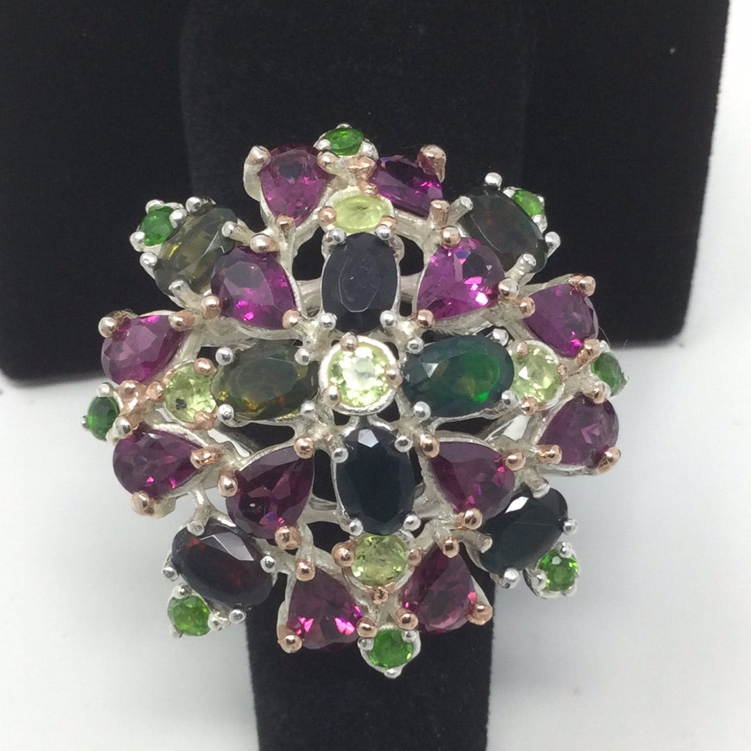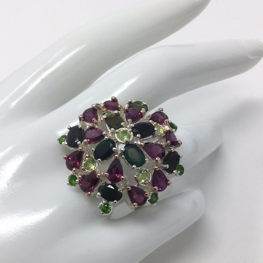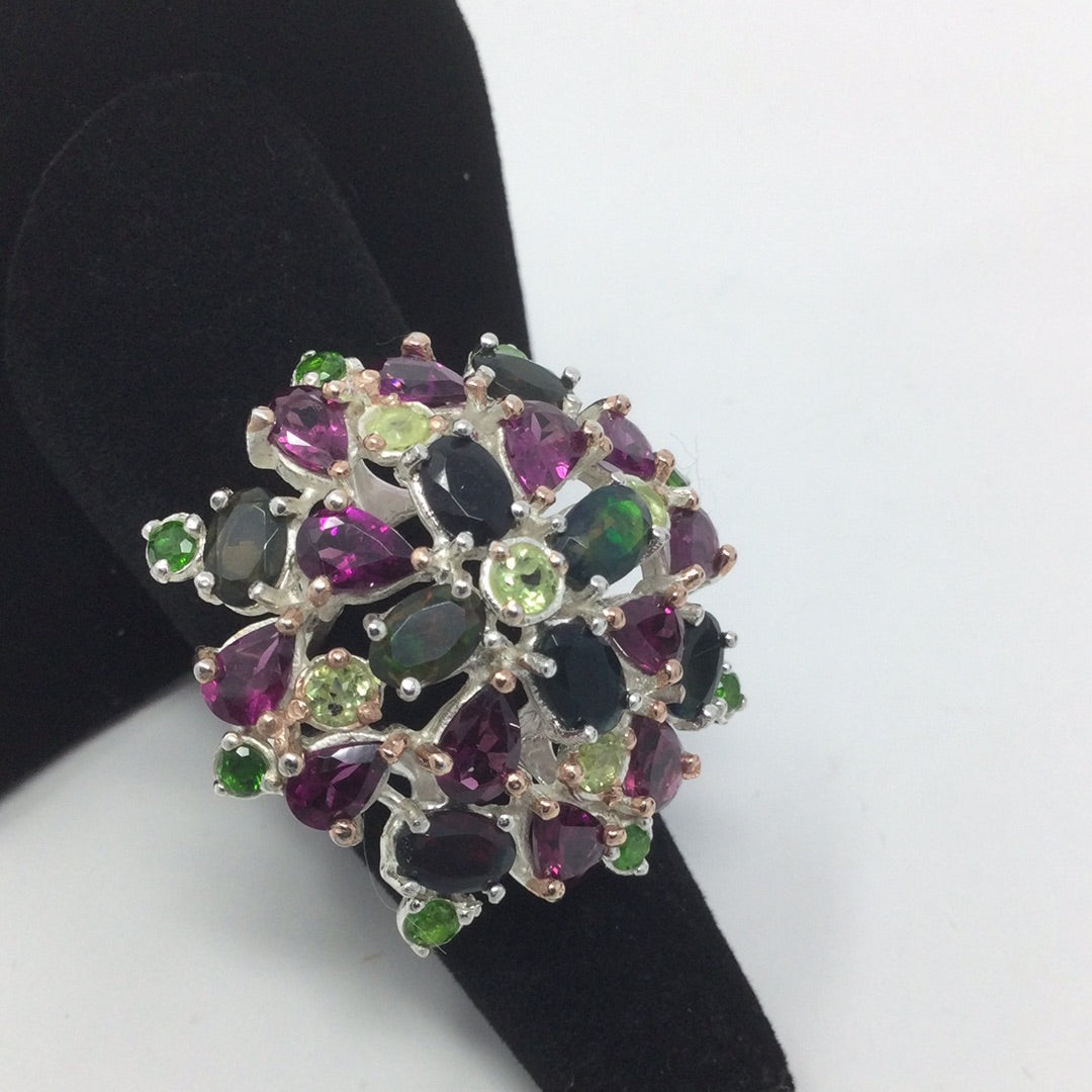 An magnificent take on an elegant dome ring encrusted with the finest genuine gemstones, Mysterious Black Opals, married with genuine with rare Russian Chrome Diopside, Garnets and Peridot. Breathtaking in its impact and beauty, looks like a famous Hollywood high end jeweler. This is set in. 925 sterling silver with a white gold overlay for durability and beauty. Very swanky look that defies the traditional dome ring in a majestic way. This is a custom made, one of a kind, guaranteed to thrill.
