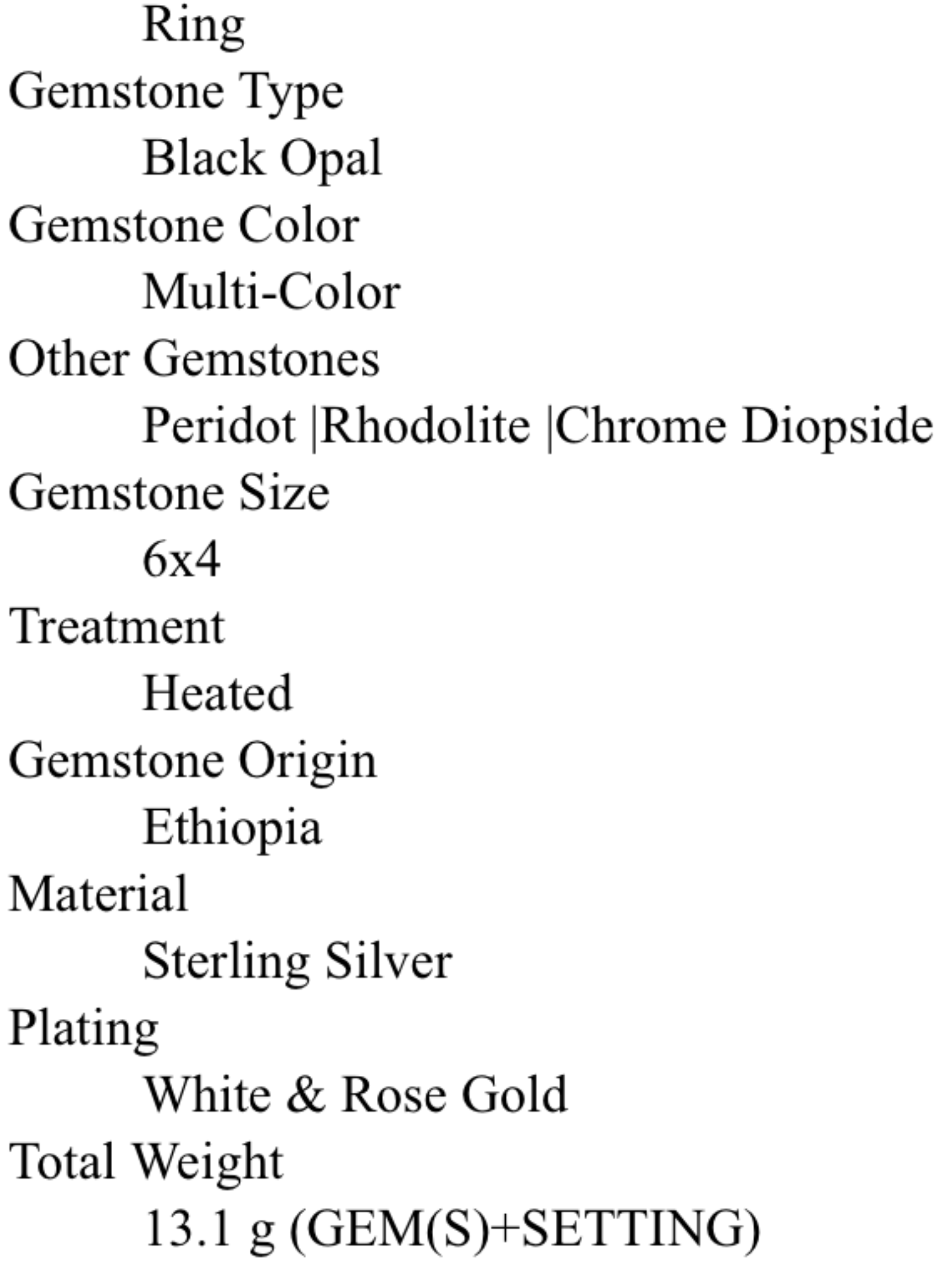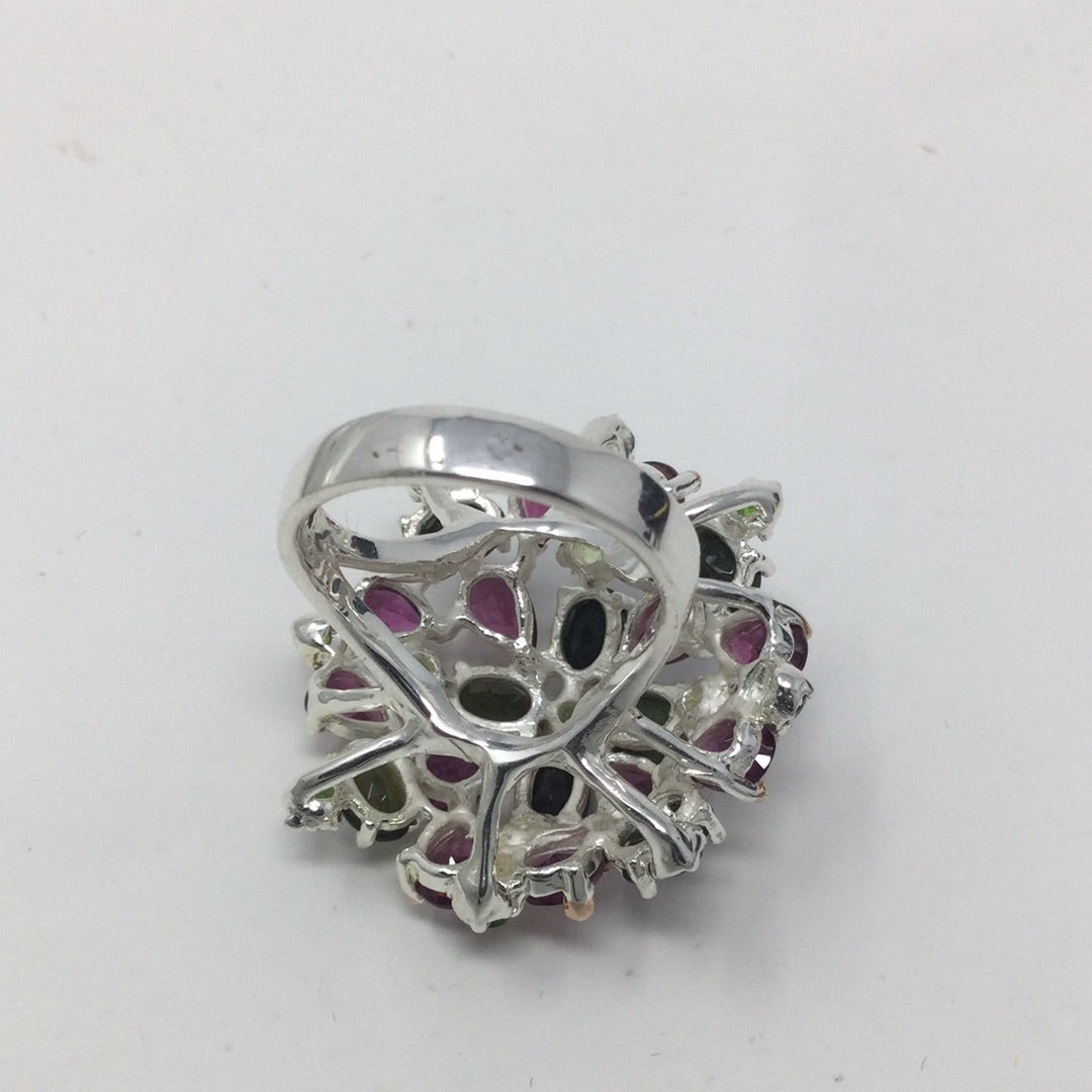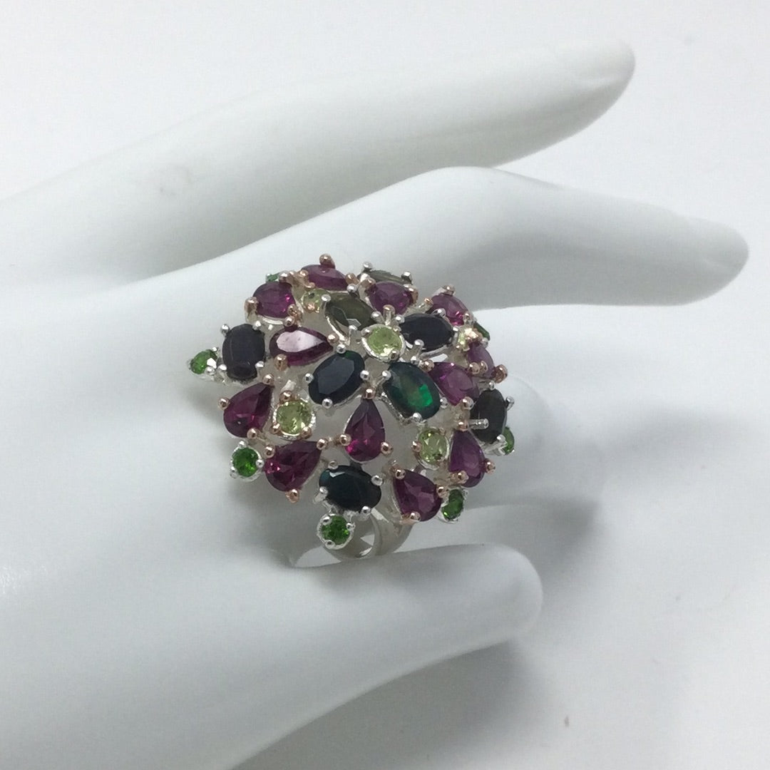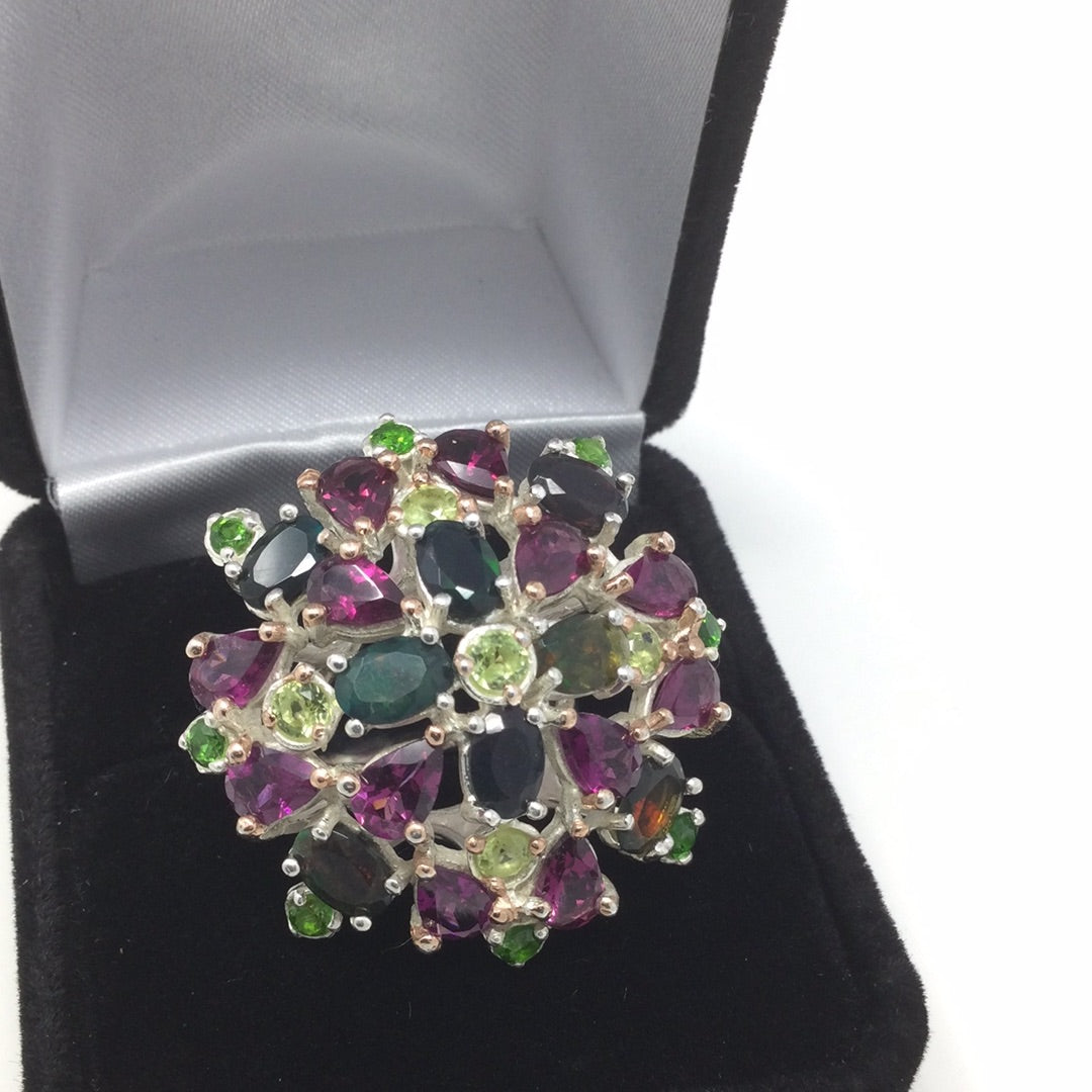 An magnificent take on an elegant dome ring encrusted with the finest genuine gemstones, Mysterious Black Opals, married with genuine with rare Russian Chrome Diopside, Garnets and Peridot. Breathtaking in its impact and beauty, looks like a famous Hollywood high end jeweler. This is set in. 925 sterling silver with a white gold overlay for durability and beauty. Very swanky look that defies the traditional dome ring in a majestic way. This is a custom made, one of a kind, guaranteed to thrill.