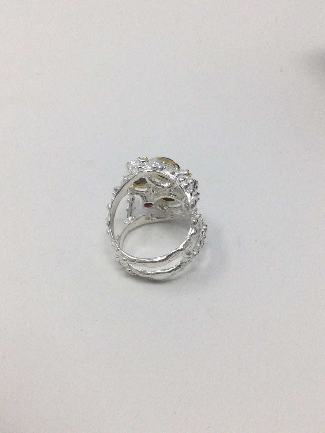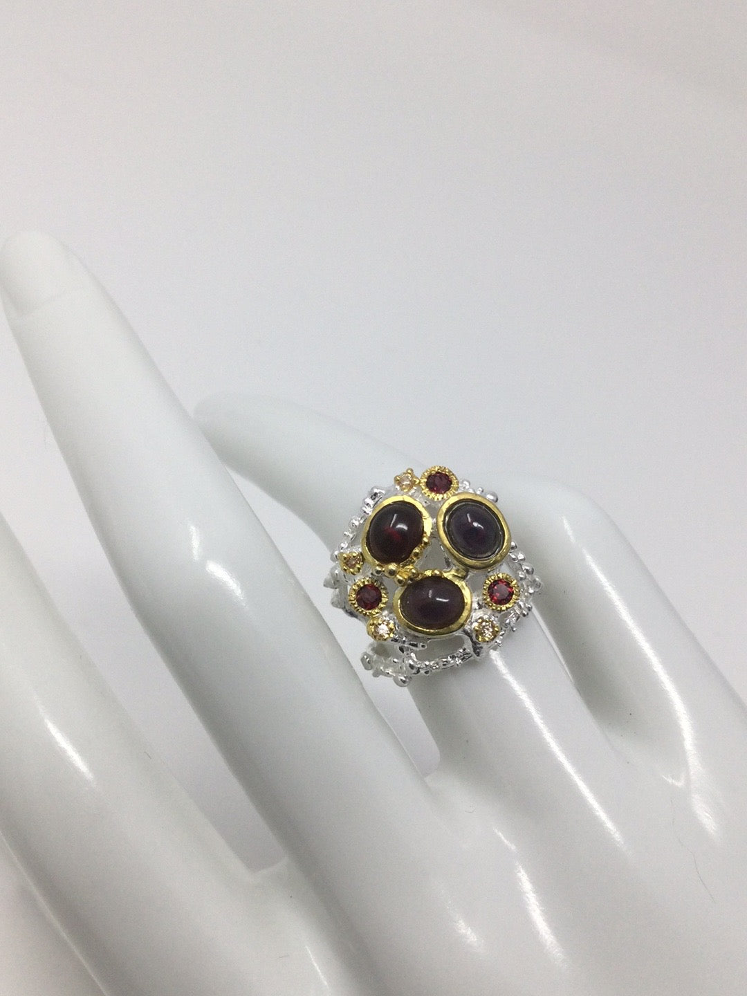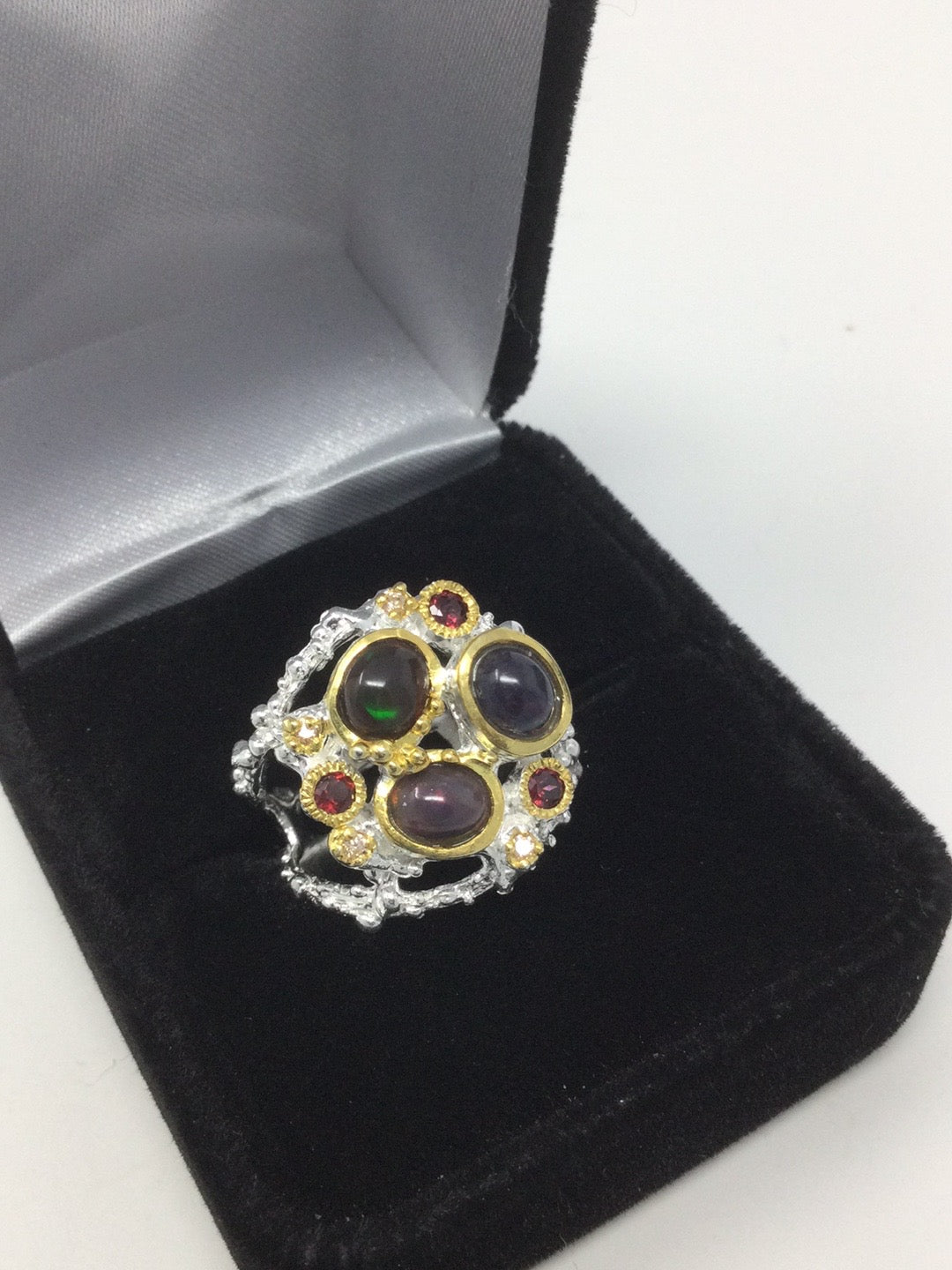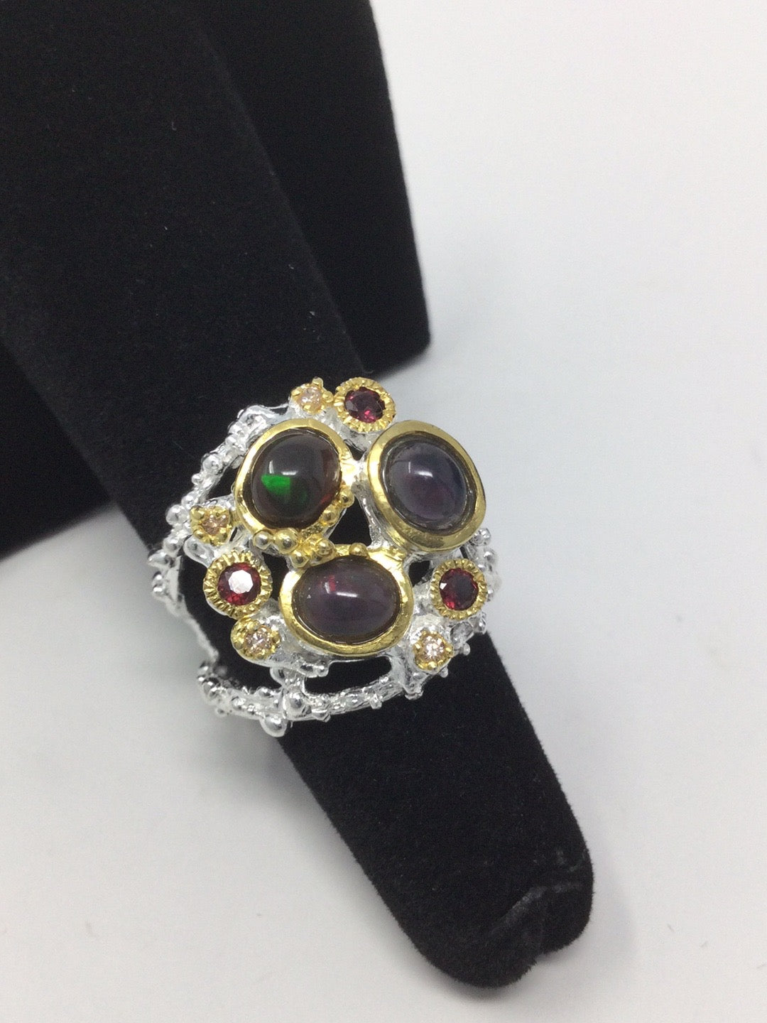 A gorgeous rough, tough artsy ring utilizing genuine Black Opals accented with Garnets. This custom made ring has an edgy Art Moderne look for that person that doesn’t want what everyone else is wearing. Set in .925 sterling silver with a 14K white gold overlay for durability and beauty. My rings are never mass produced for the masses. Size 6 1/2, Resize at your jeweler.