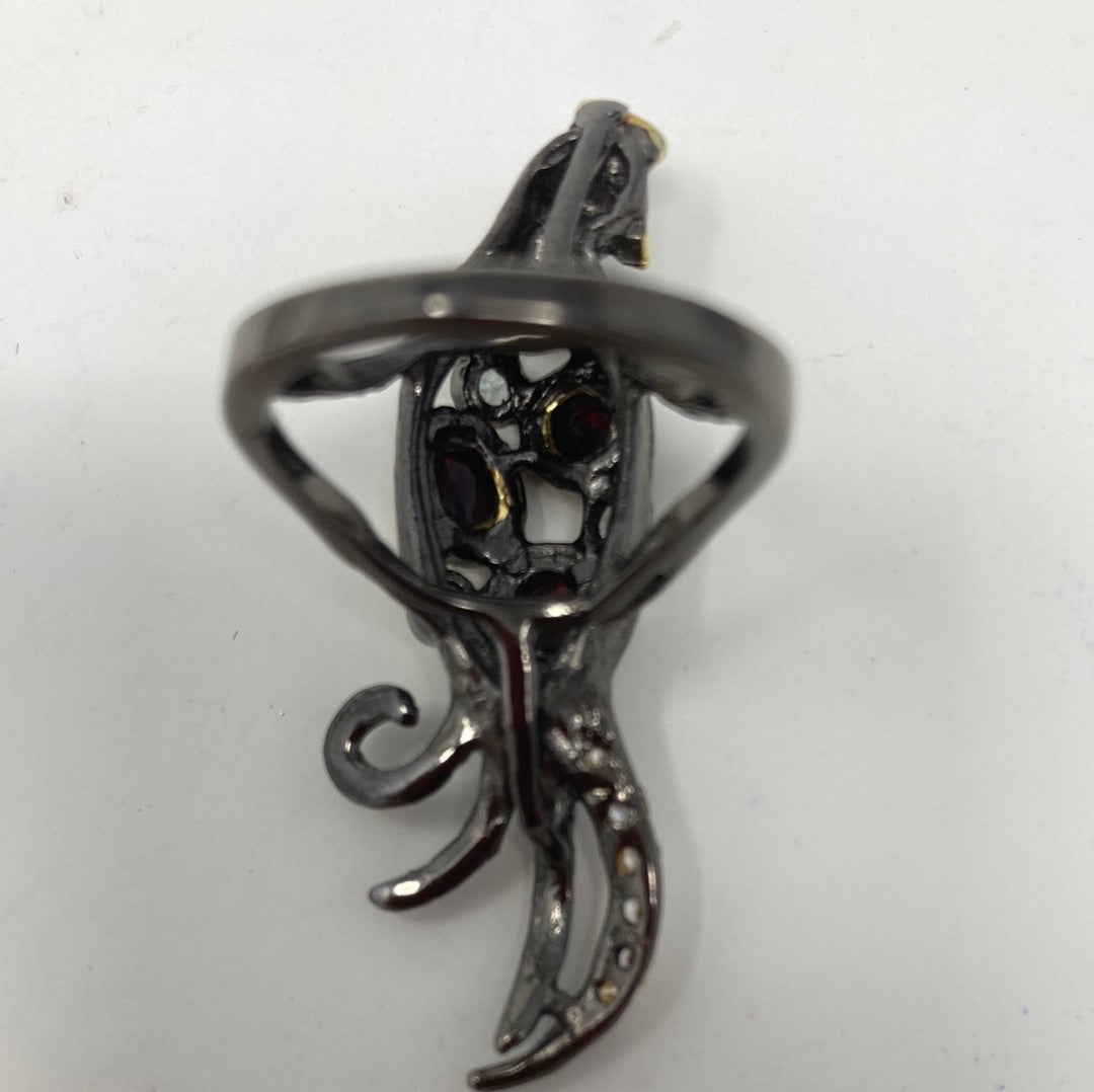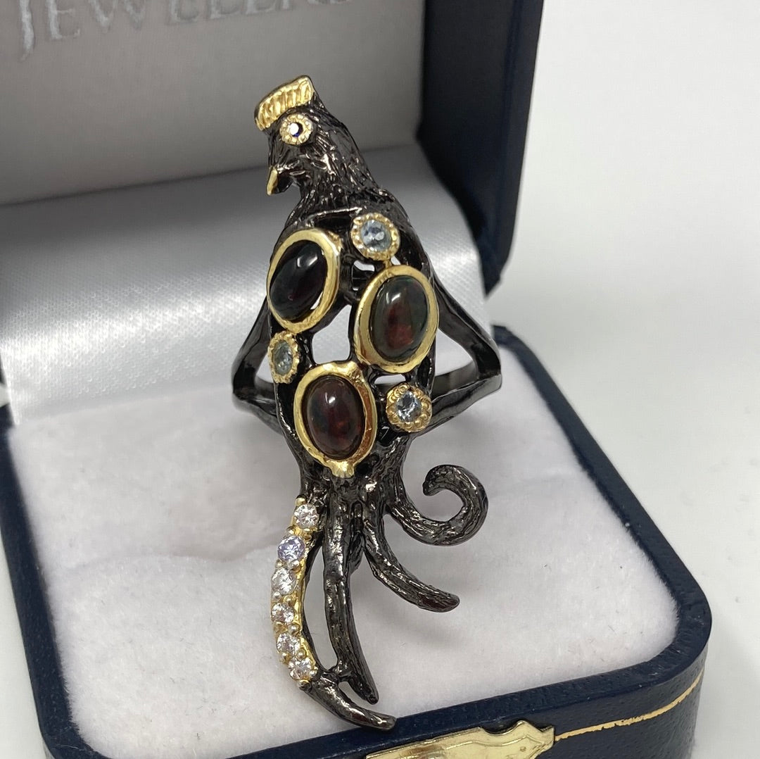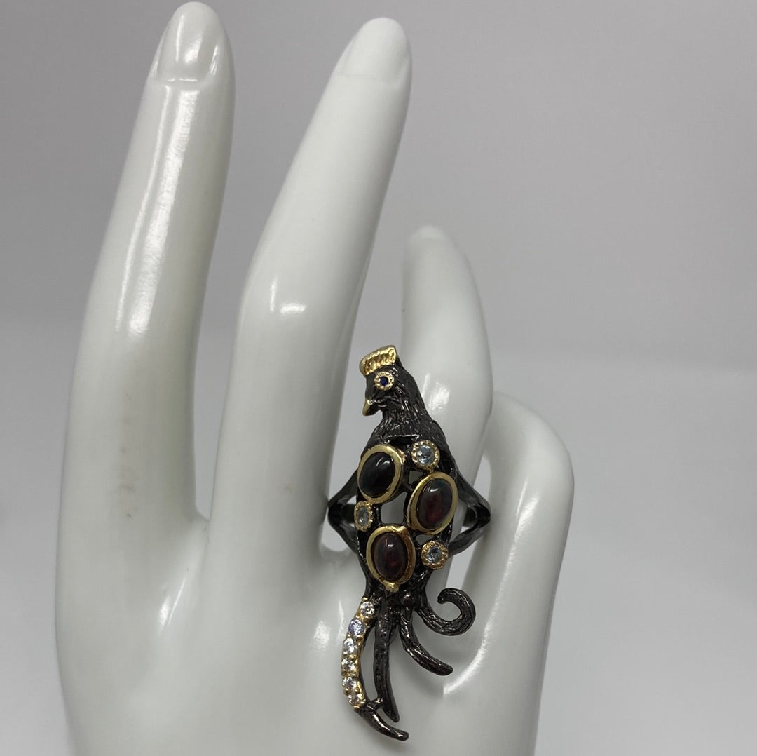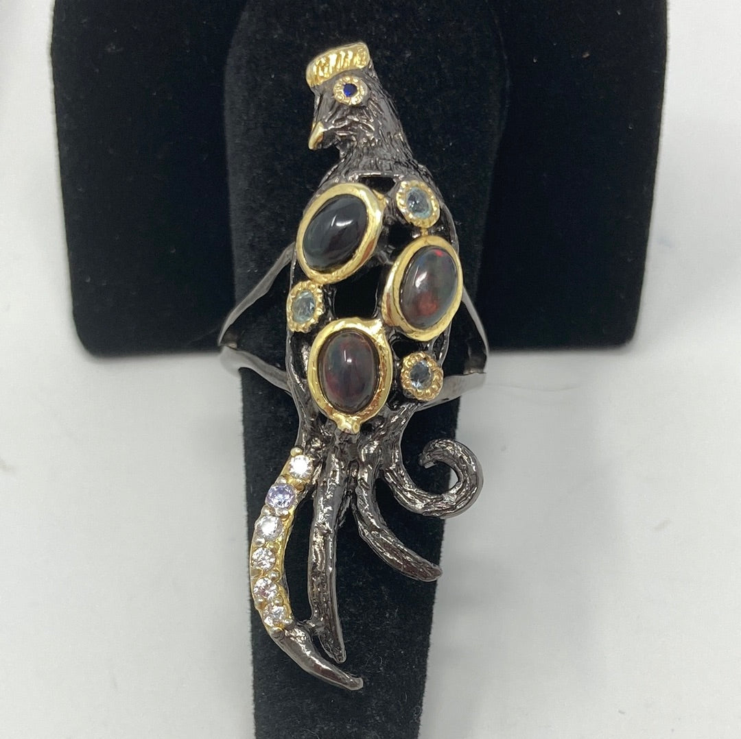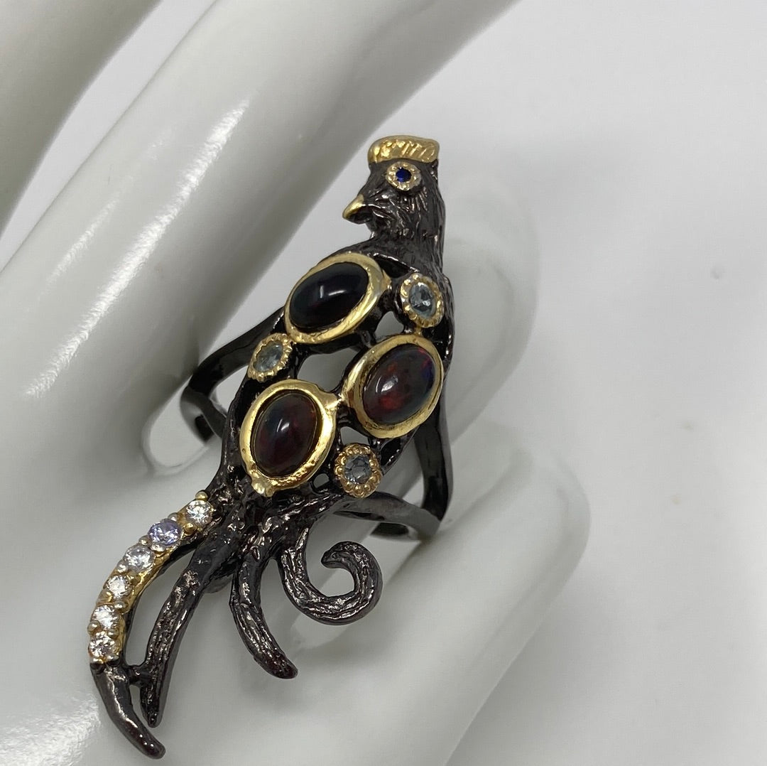 Outstanding little eccentric peacock to perch upon your finger. Featuring 6mm by 4mm genuine Black Opals set on .925 sterling silver with a Rhodium overlay with yellow gold embellishments. Notice the sweeping artistic design of this majestic bird. It is accented with tiny CZS for a kiss of sparkle and contrast, very artful design that is exquisitely detailed. Size 7, Resize at your jeweler or use a ring guard.