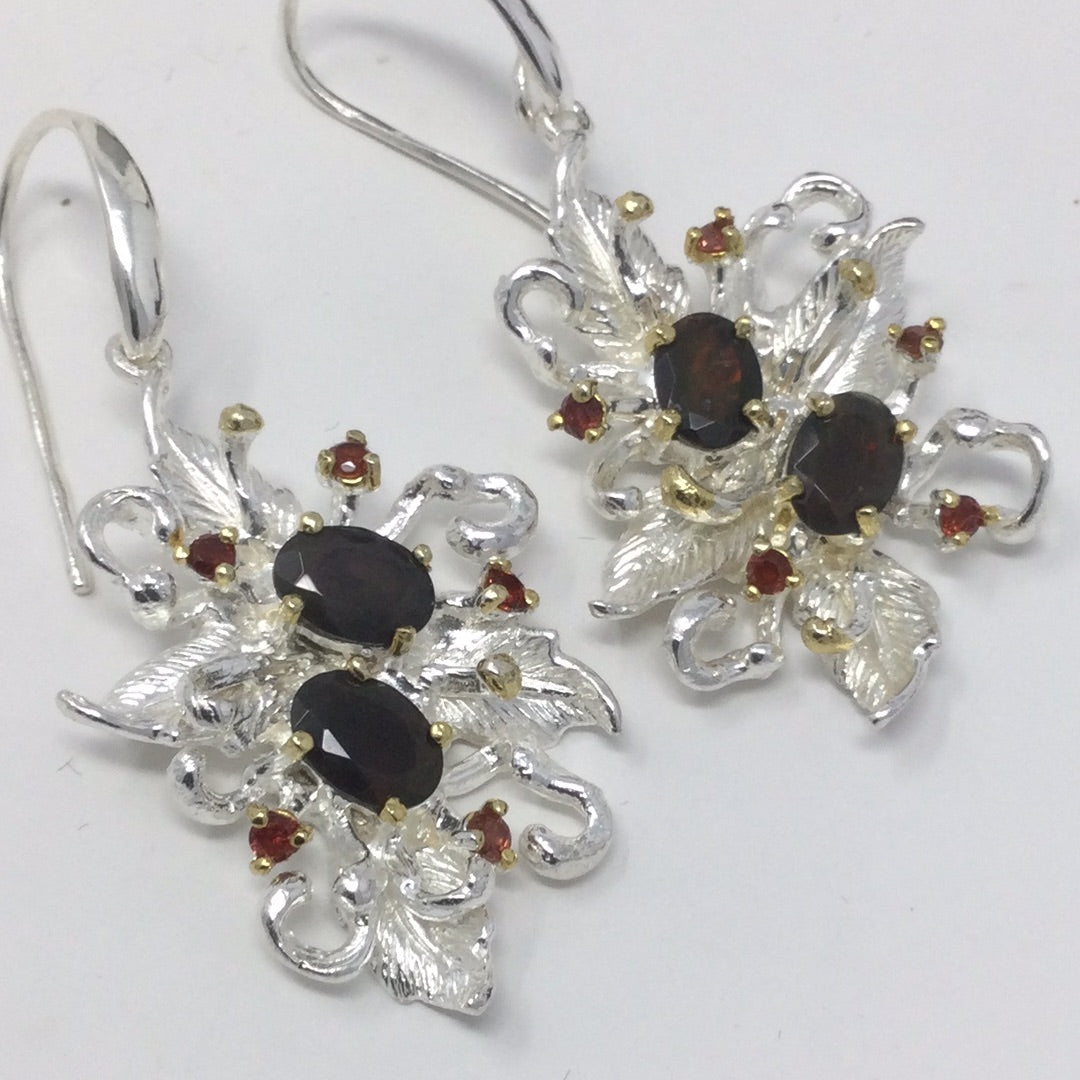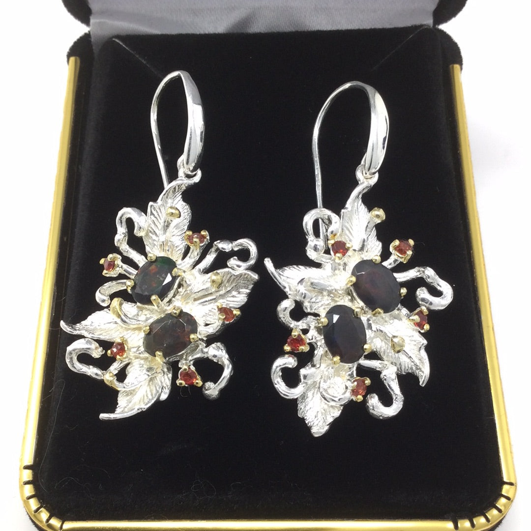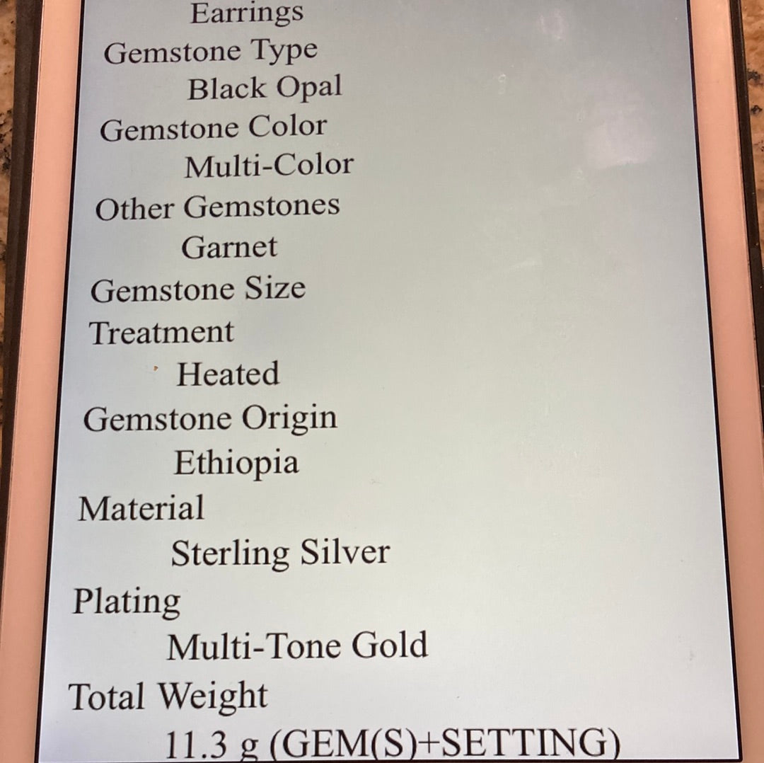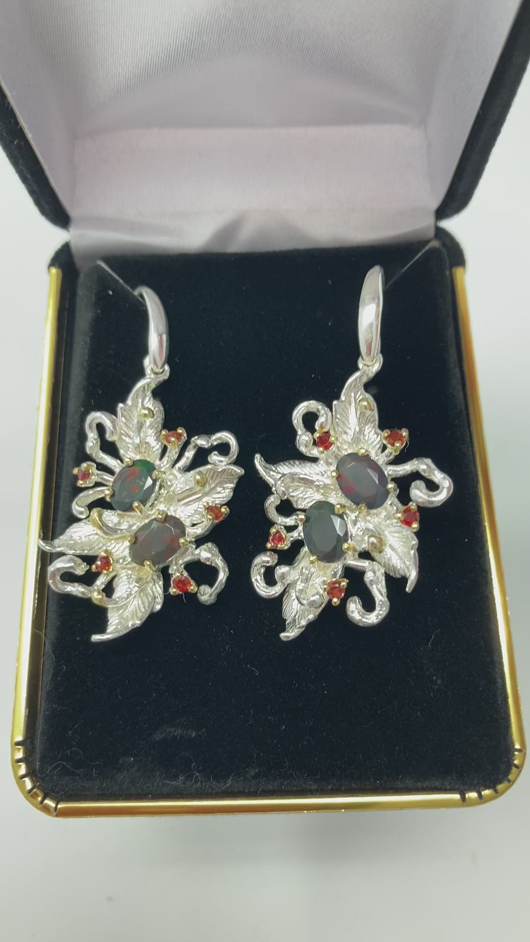 Mysterious and enchanting these lovely earrings are just so special, a gorgeous way to frame your face in elegance. You’ll notice the intricate detailing in the scrollwork and leaves in these custom made one of a kind genuine gemstone earring set in .925 sterling silver with a 14K white gold overlay. Tiny faceted garnets are hand set to compliment the the Black Opals, the Black Opals will exude flashes of red as the light hits them while you move. These are approximately 1” long.