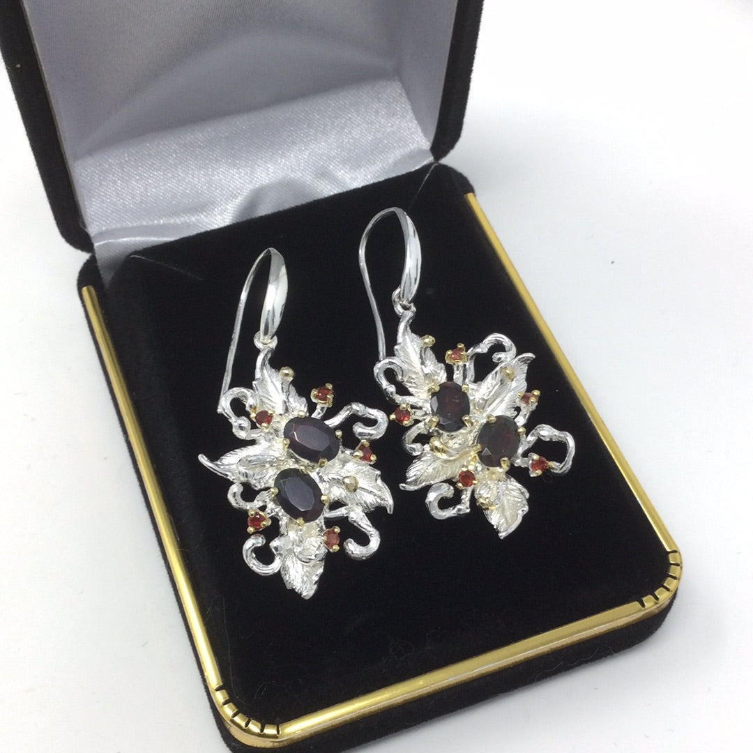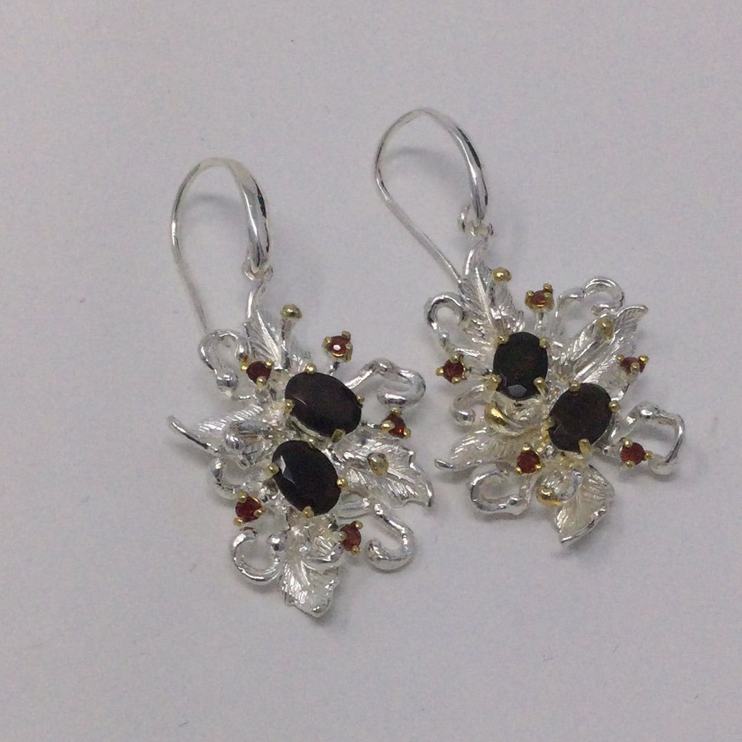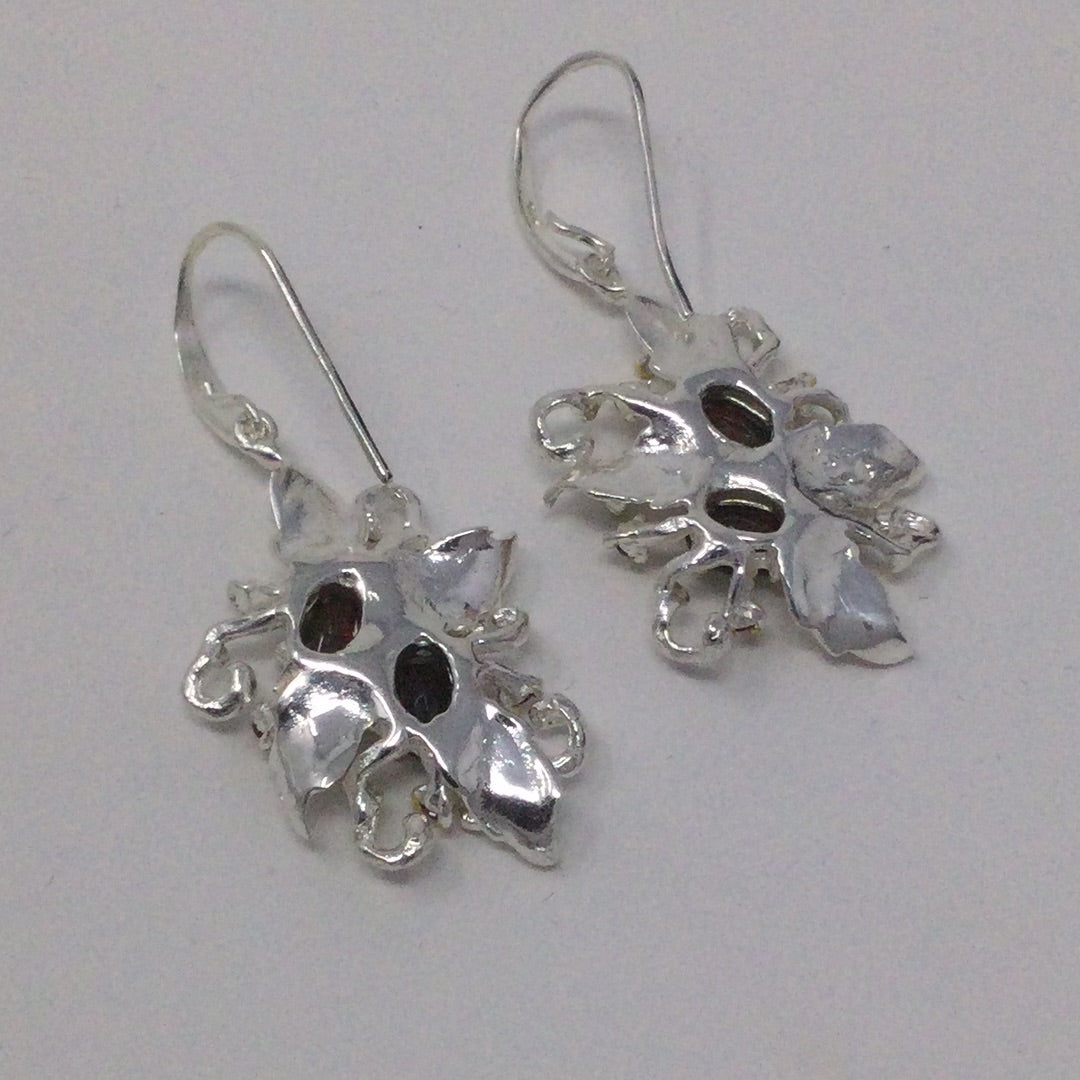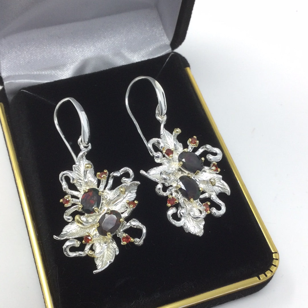 Mysterious and enchanting these lovely earrings are just so special, a gorgeous way to frame your face in elegance. You’ll notice the intricate detailing in the scrollwork and leaves in these custom made one of a kind genuine gemstone earring set in .925 sterling silver with a 14K white gold overlay. Tiny faceted garnets are hand set to compliment the the Black Opals, the Black Opals will exude flashes of red as the light hits them while you move. These are approximately 1” long.