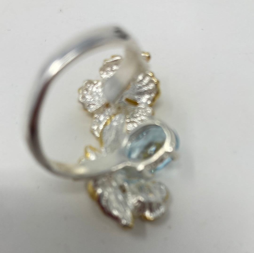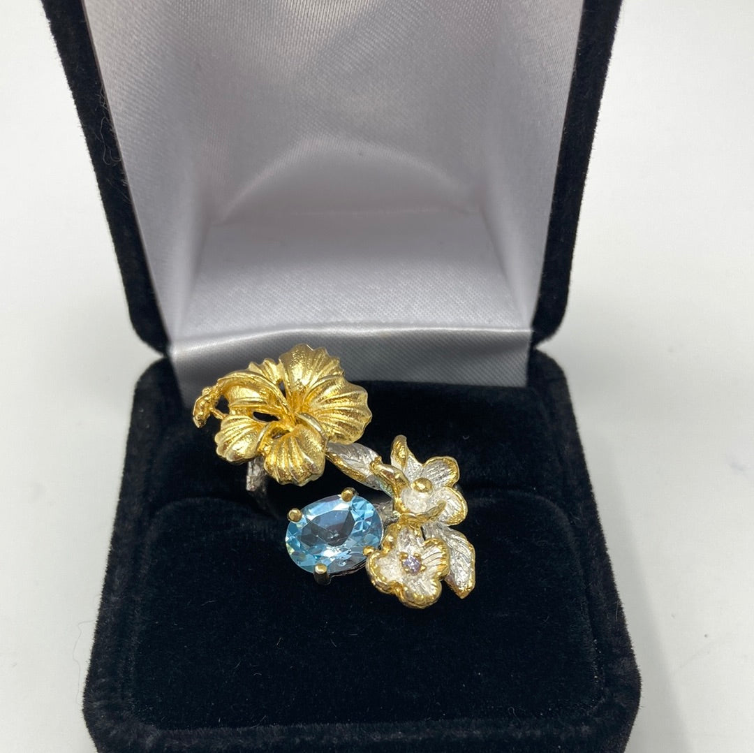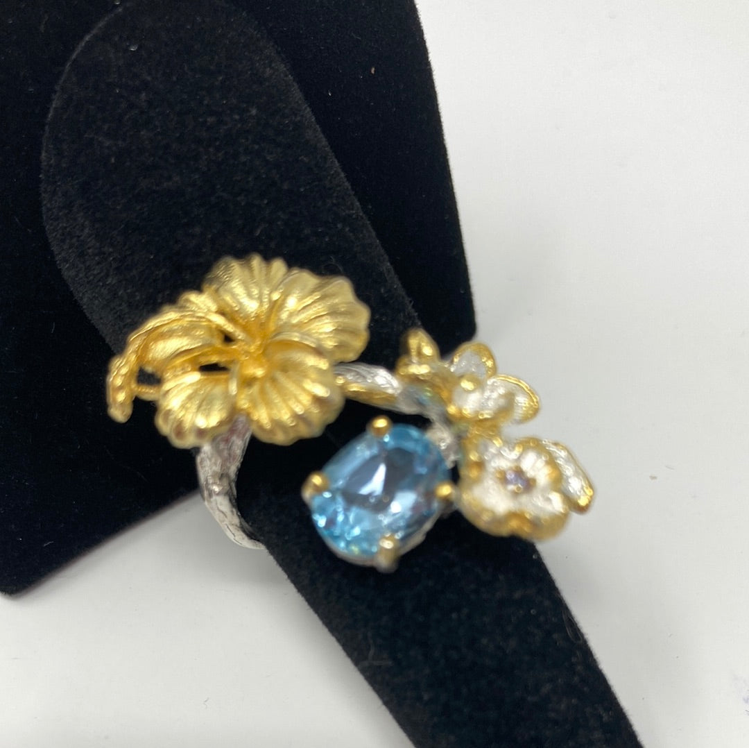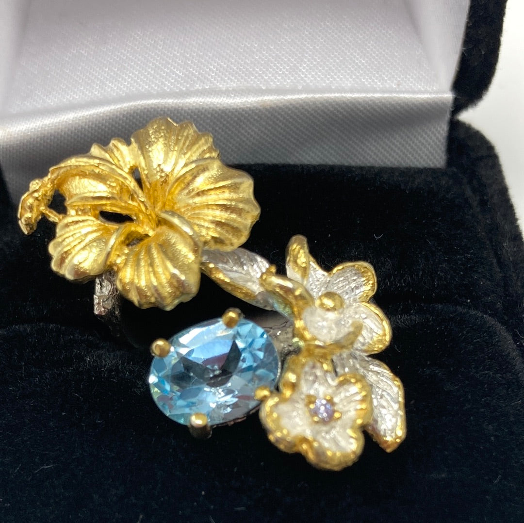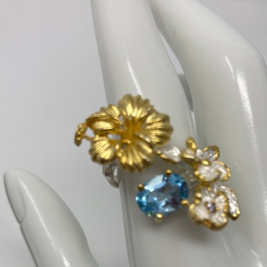 Rejoice in the beauty of nature with this Genuine Blue Topaz Hibiscus Ring. It was a masterpiece, notice the intricate detailing, recreating a beautiful Hibiscus to wear upon your finger. All crafted in .925 sterling silver with a white and yellow gold overlay for durability and beauty. This gemstone measures at 9mm by 7mm a tiny work of art to wear upon your hand. Size 8, can re resized to custom fit sized up or down with a gentle squeeze, as it is a wrap style setting