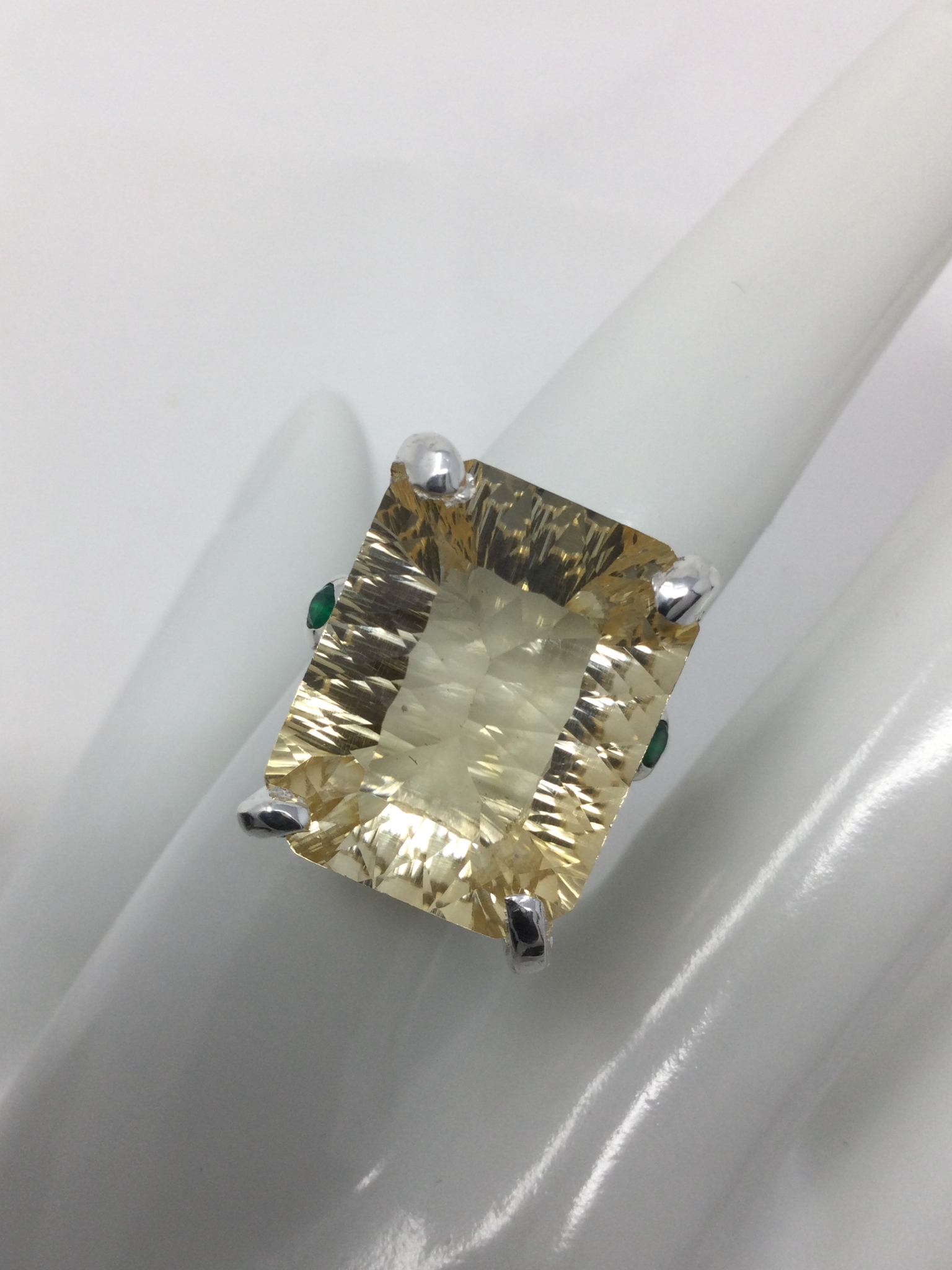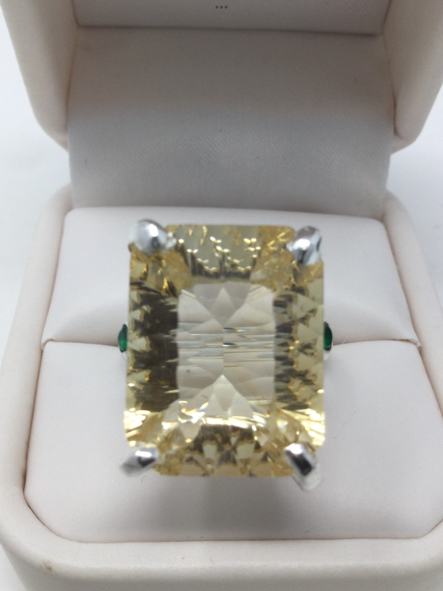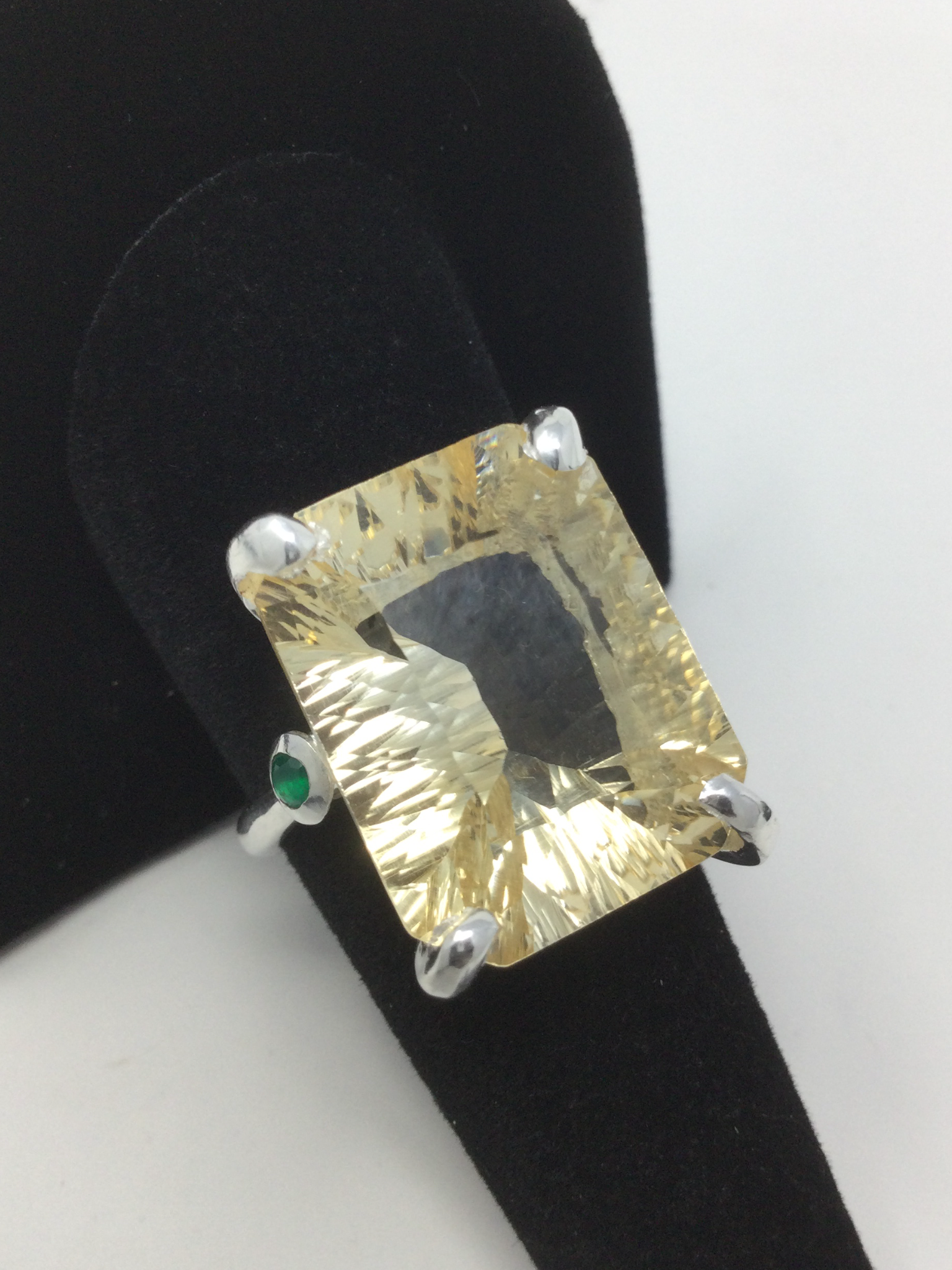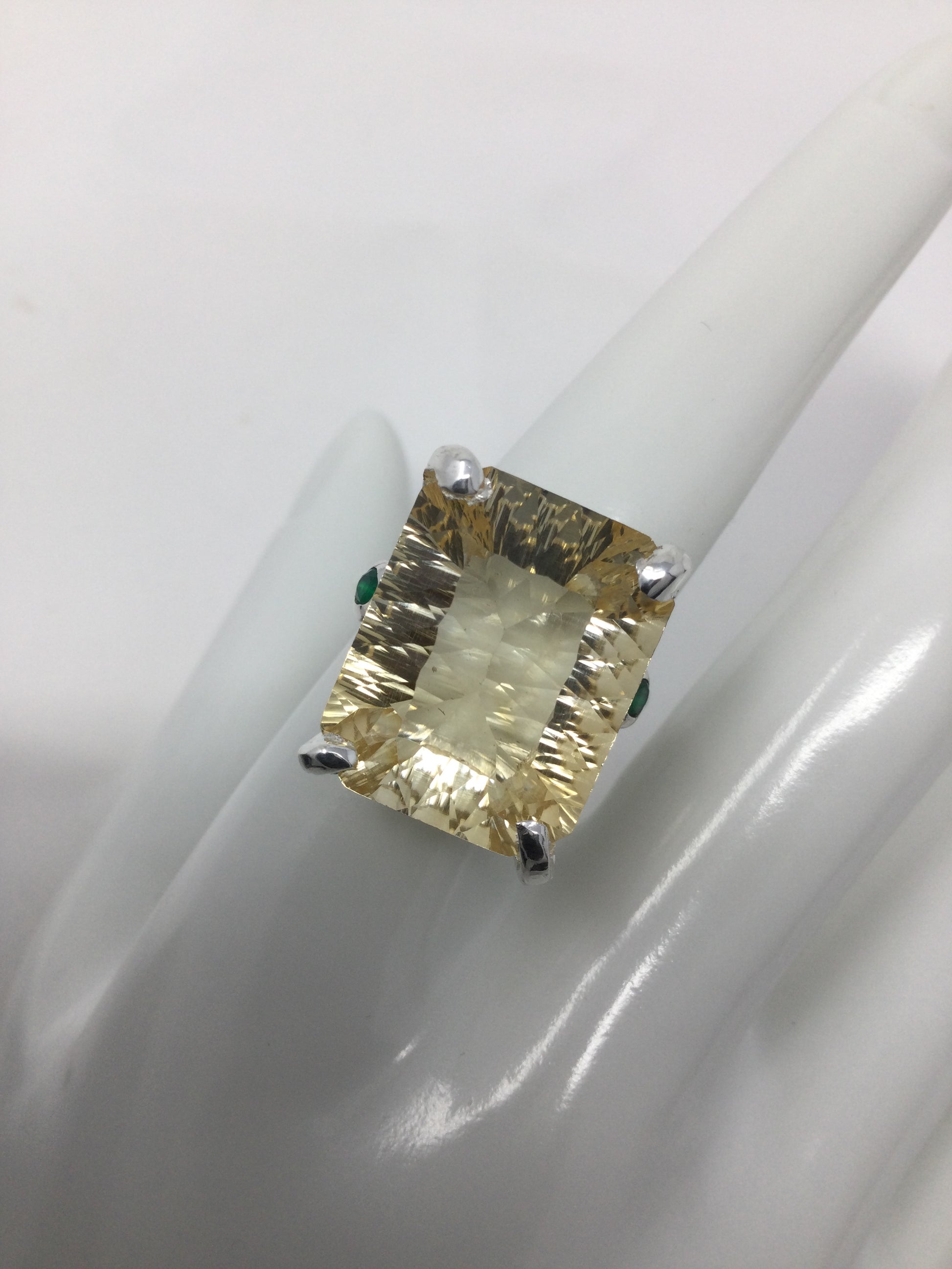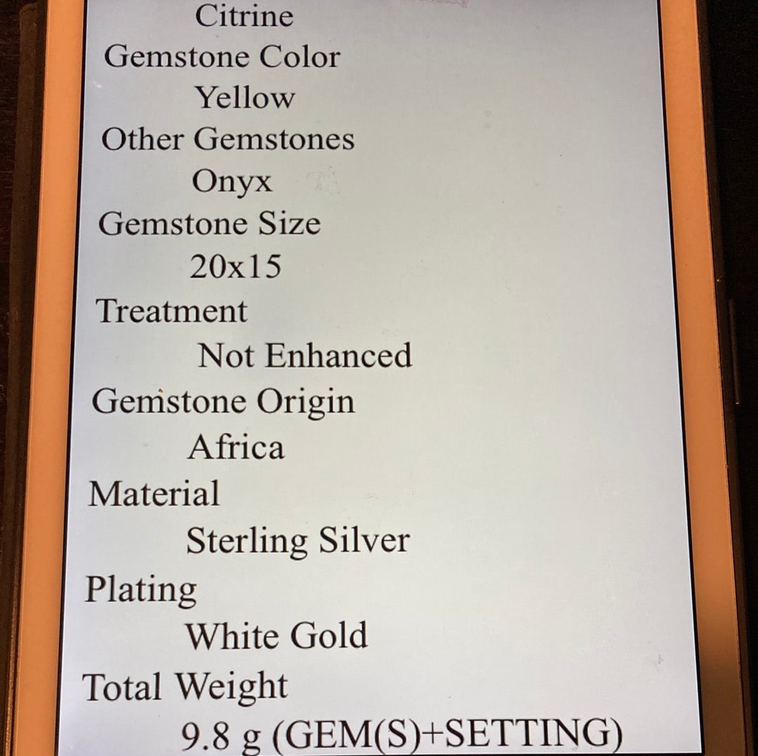 Wow, look at this fabulous genuine Citrine in that highly desirable concave cut faceting that has a look of infinity upon your hand. A soft aura of light, that exhibits your inner shine. Flanking each side a lovely Green Onyx. Seldom do I find an exquisite emerald cut gemstone in this 30 CTW size. This is a custom made, one of a kind artistic ring set in in .925 sterling silver with a white gold overlay for beauty and durability. This is a unique treasure that is not mass produced, it’s a poem for your finger, a future family heirloom. This genuine gemstone measures 20mm by15mm. Size 8, resize at your jeweler or use a ring guard.
