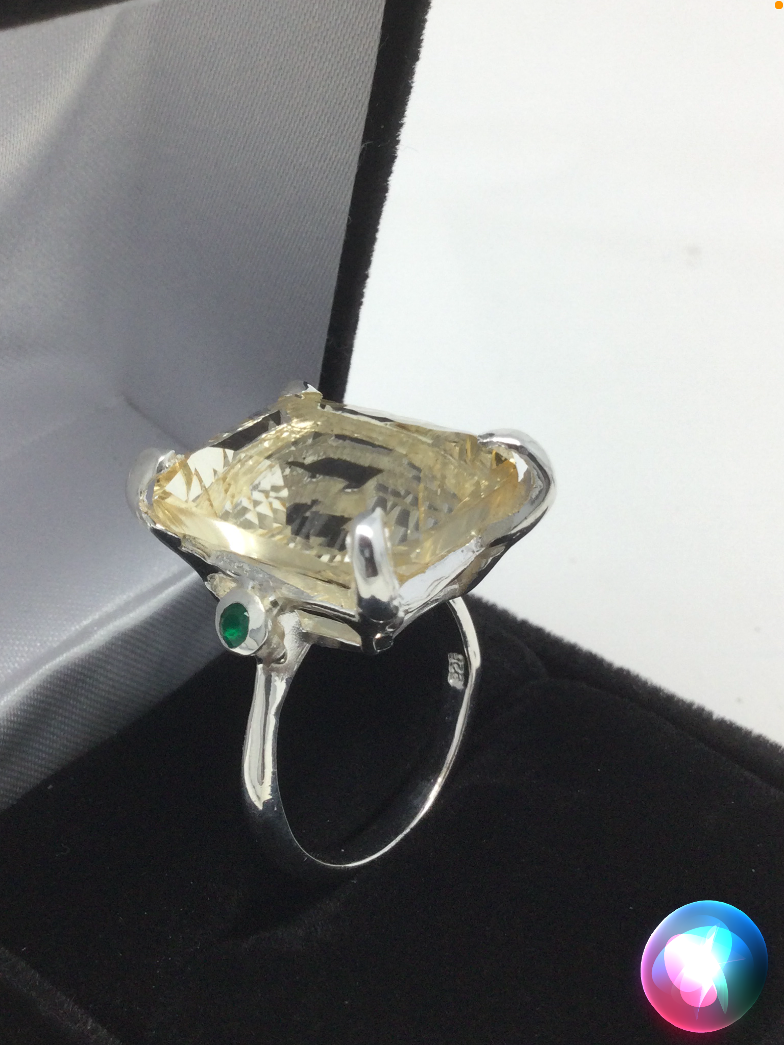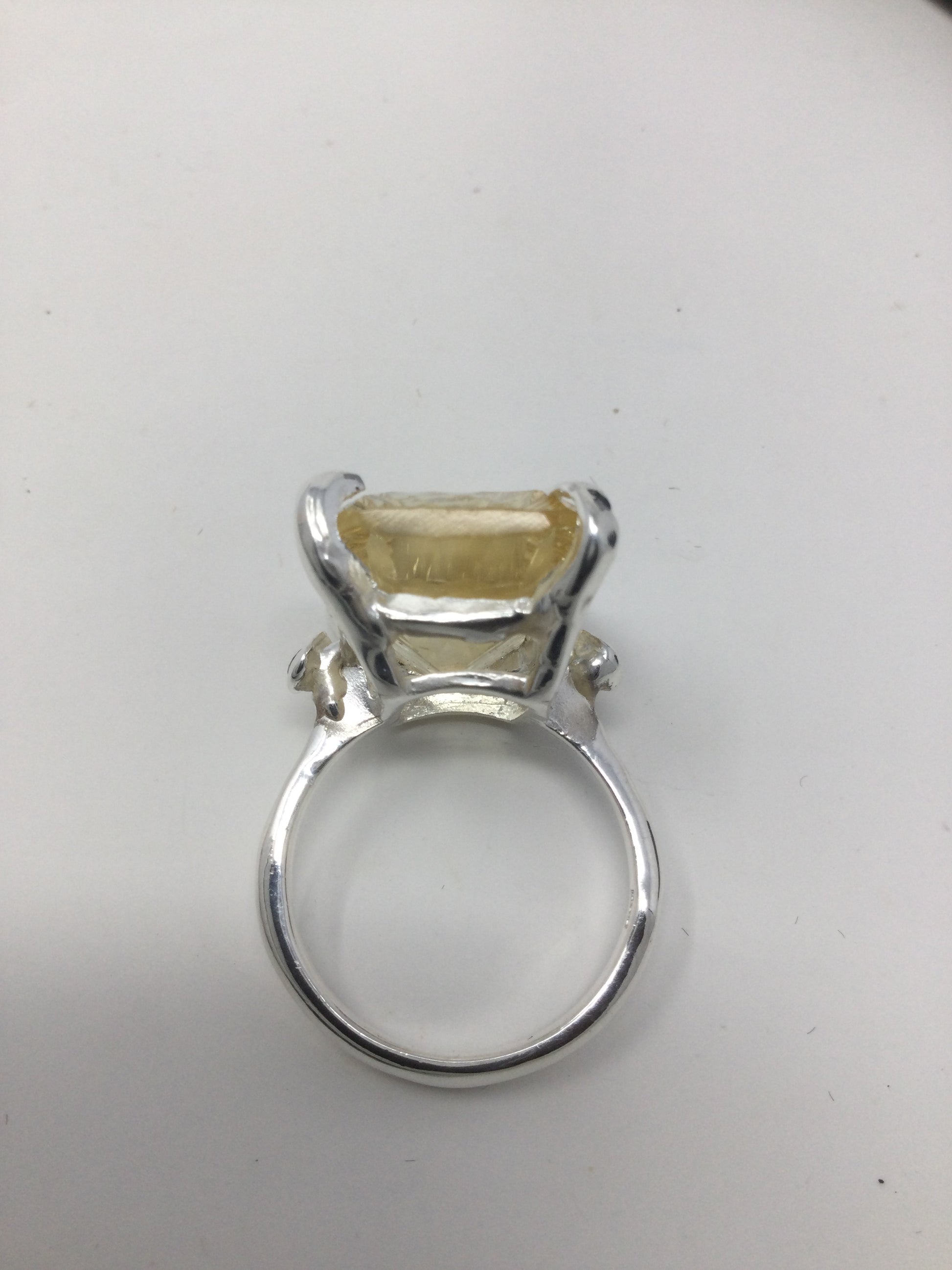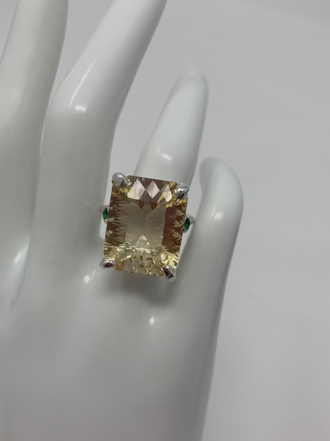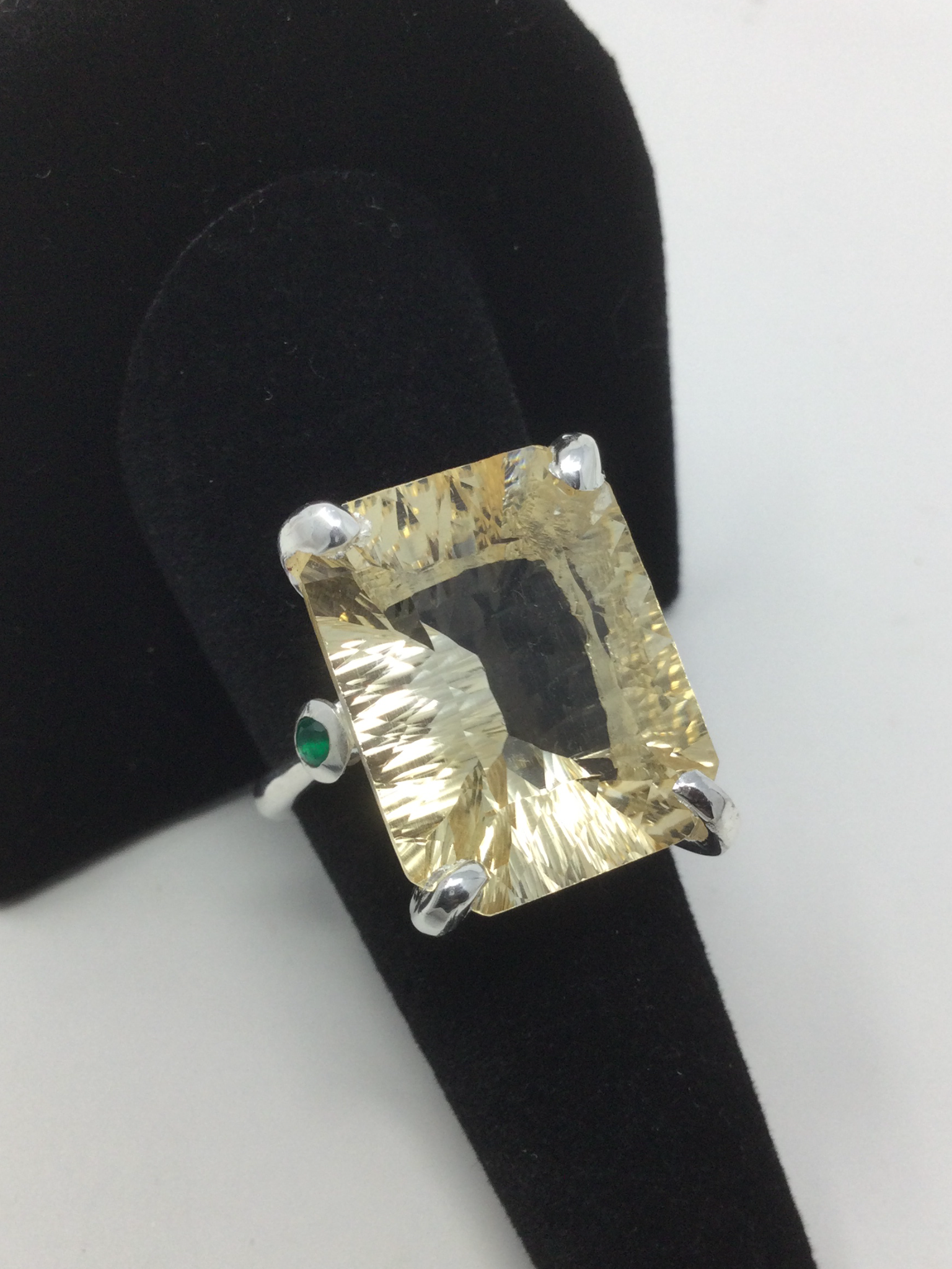 Wow, look at this fabulous genuine Citrine in that highly desirable concave cut faceting that has a look of infinity upon your hand. A soft aura of light, that exhibits your inner shine. Flanking each side a lovely Green Onyx. Seldom do I find an exquisite emerald cut gemstone in this 30 CTW size. This is a custom made, one of a kind artistic ring set in in .925 sterling silver with a white gold overlay for beauty and durability. This is a unique treasure that is not mass produced, it’s a poem for your finger, a future family heirloom. This genuine gemstone measures 20mm by15mm. Size 8, resize at your jeweler or use a ring guard.