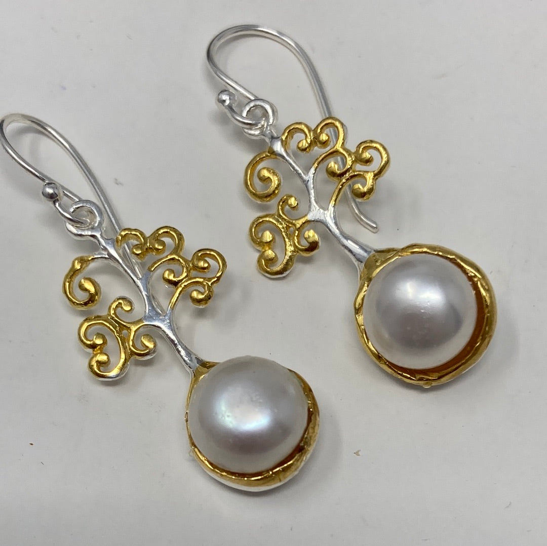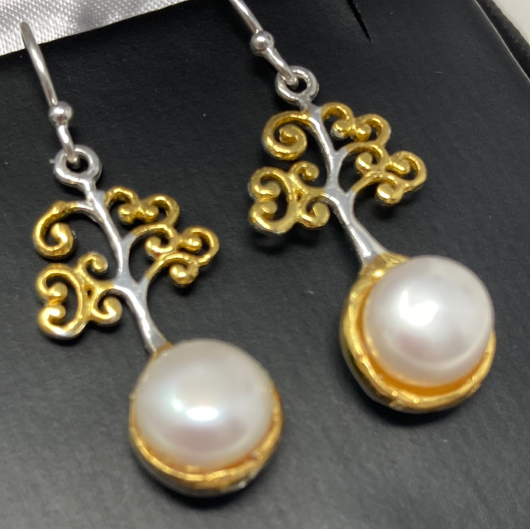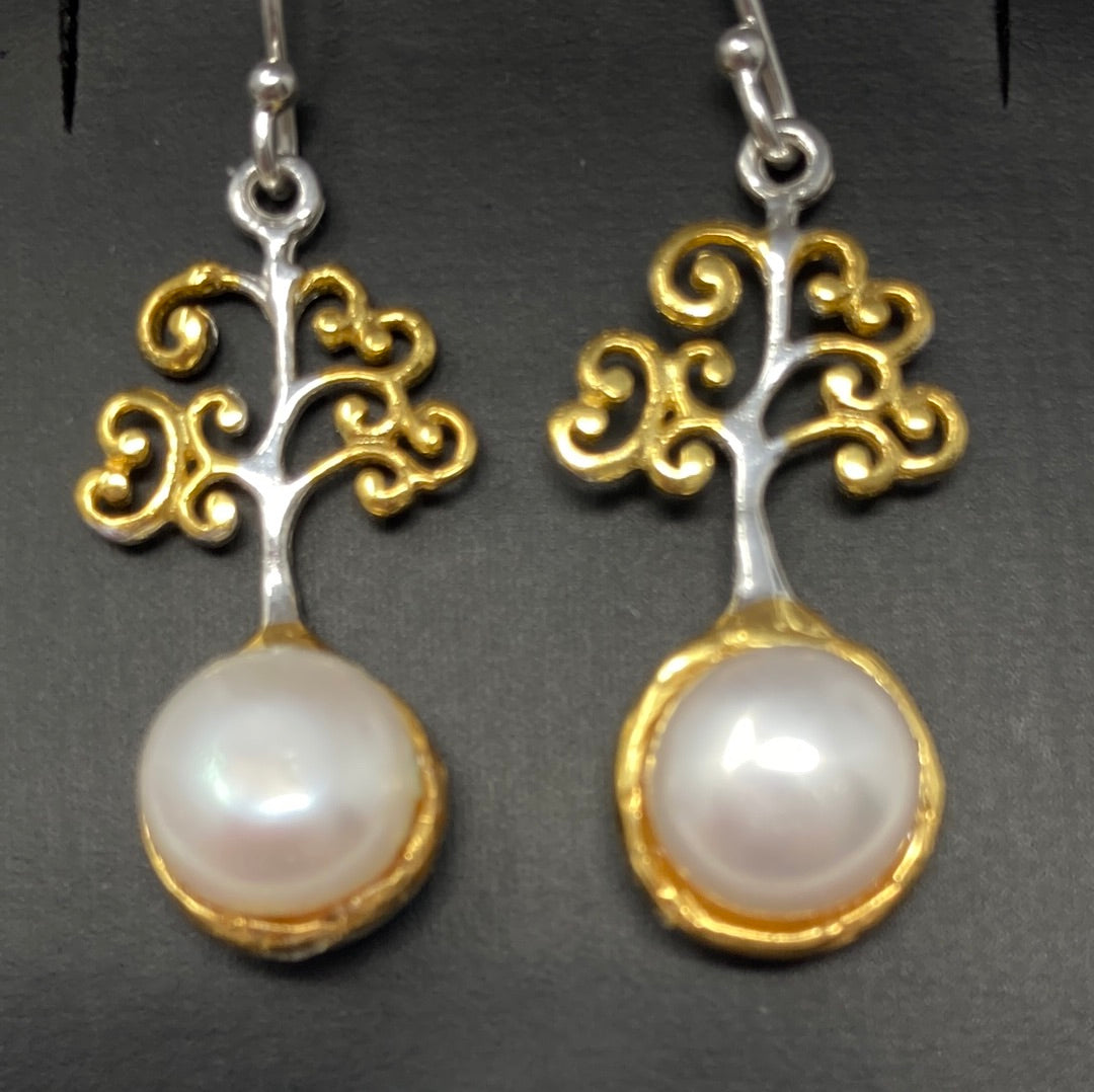 Sweet and petite these special custom crafted earring featuring a 6mm natural Pearl. These are intricately designed in a stylized tree of life design. Set in .925 Sterling Silver with yellow gold accents. Approximately 1” long