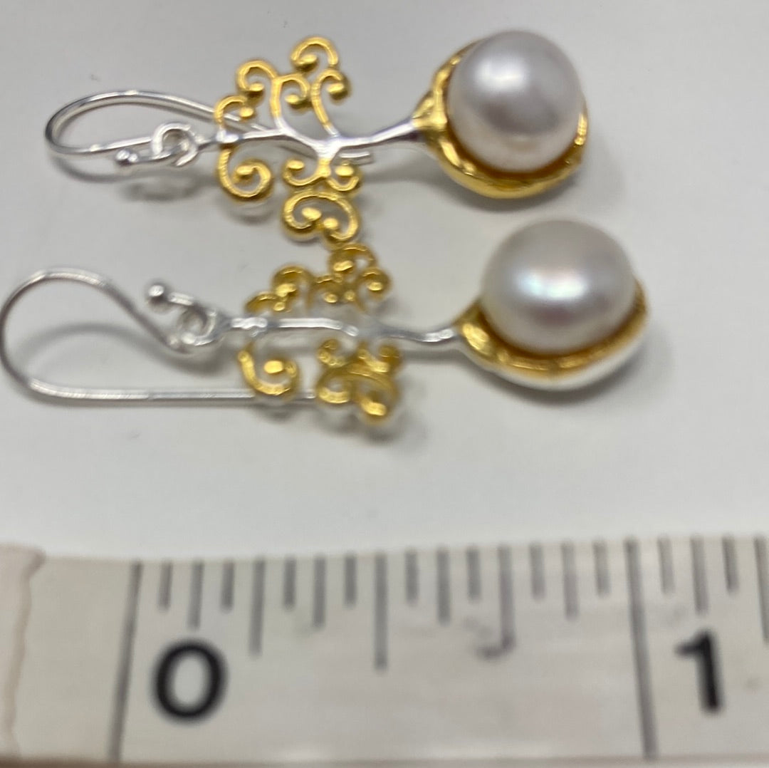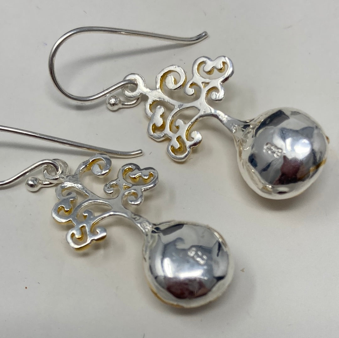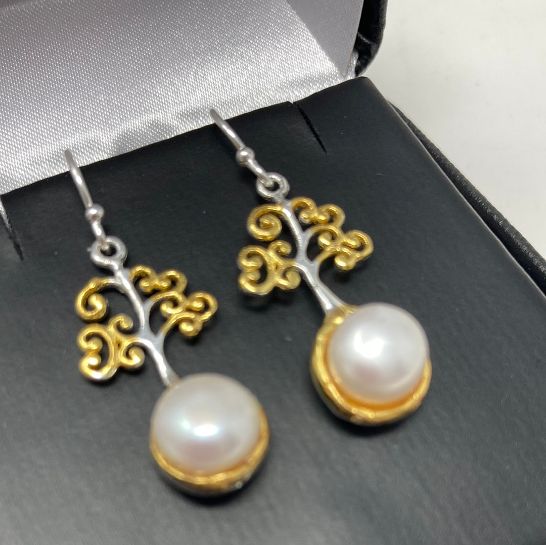 Sweet and petite these special custom crafted earring featuring a 6mm natural Pearl. These are intricately designed in a stylized tree of life design. Set in .925 Sterling Silver with yellow gold accents. Approximately 1” long