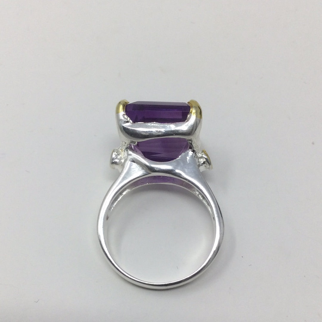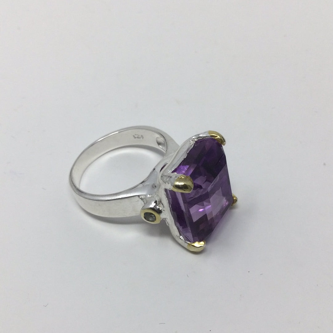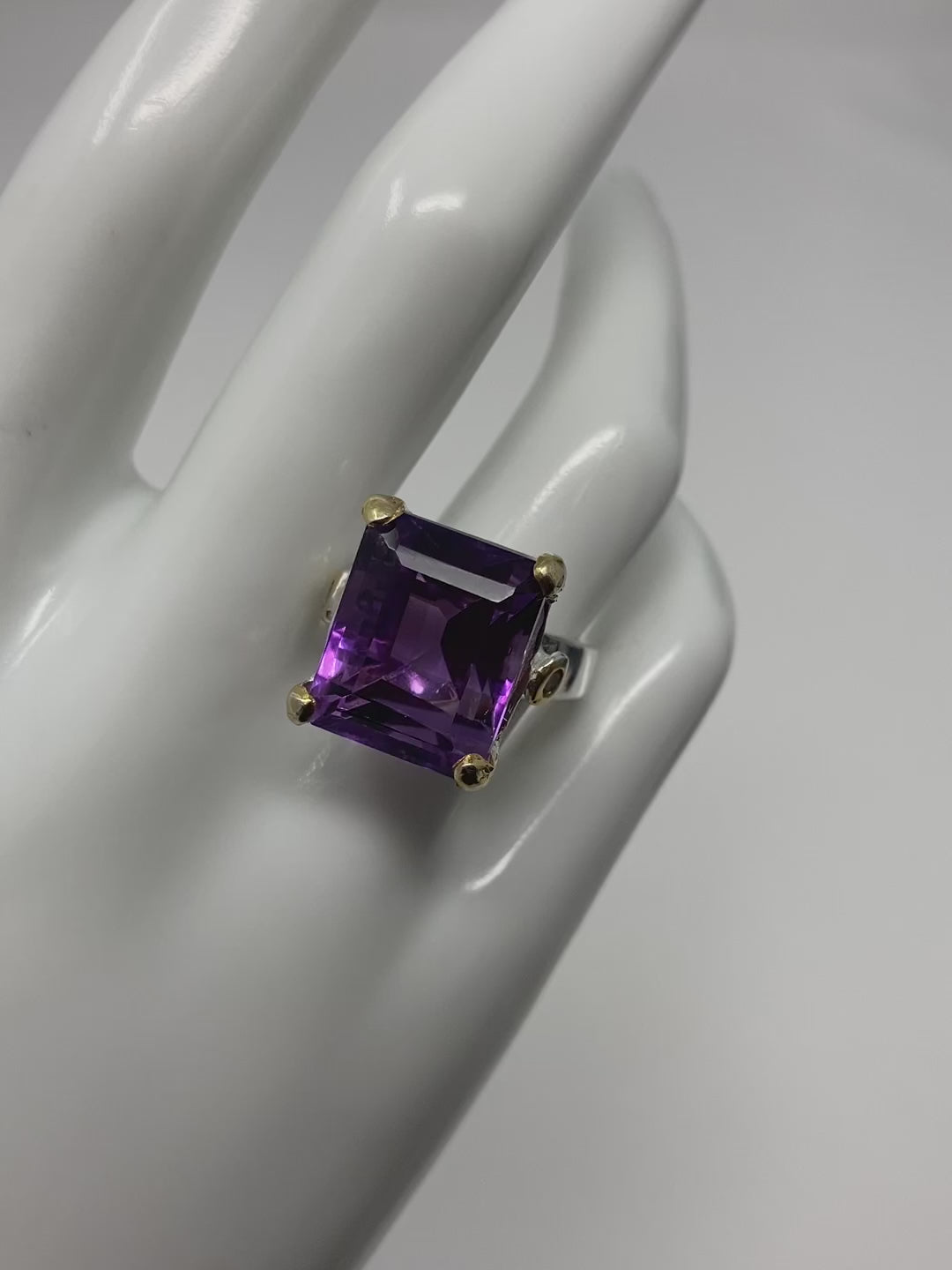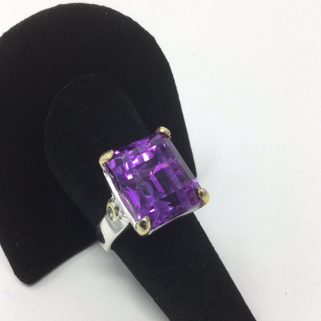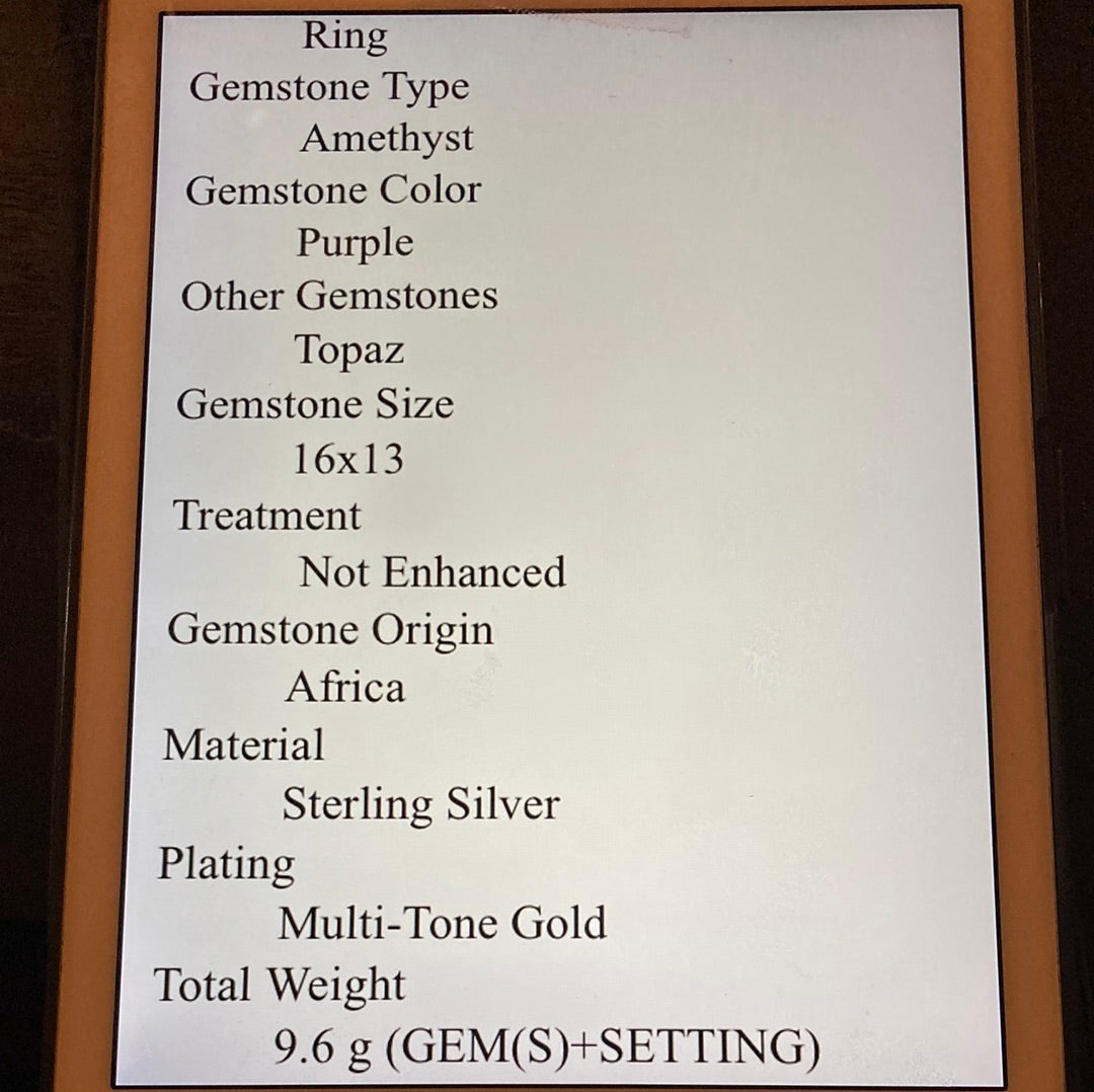 A fabulous genuine gemstone, this rich purple 20 CTW Amethyst measures in at 16mm by 13mm in that highly desirable, emerald faceted cut. This gem is hand selected and notice the depth of this ge and the interesting way the light hits the stone. Flanked on each side by Topaz, it’s a super classy look to cherish for many lifetimes to come. Always invest in genuine gemstones, a future heirloom. Set in .925 sterling silver with a white gold overlay. This ring is custom made for this gemstone and it’s a one of a kind. Size 8, Resize at your jeweler or use a ring guard.