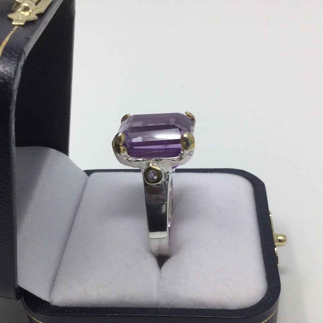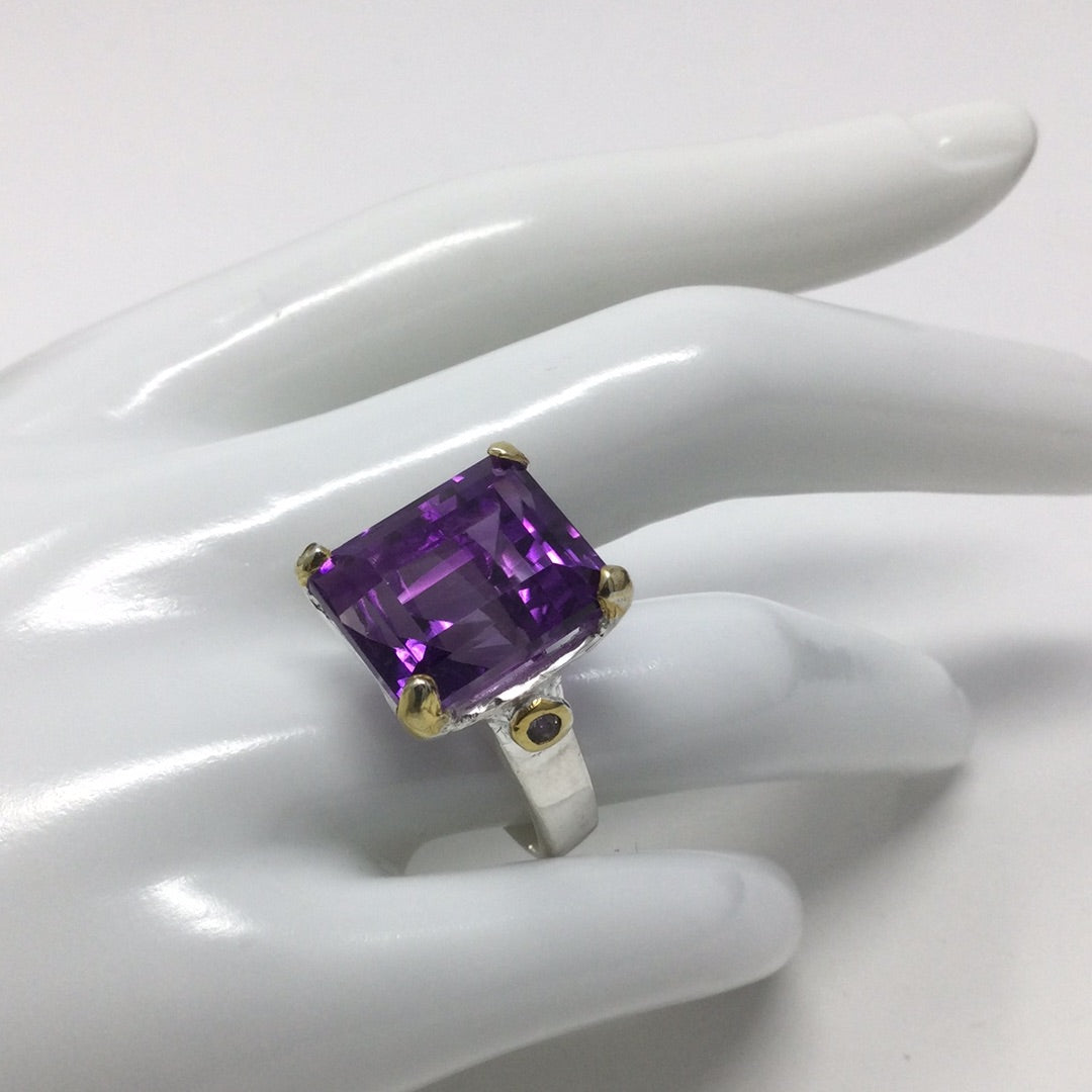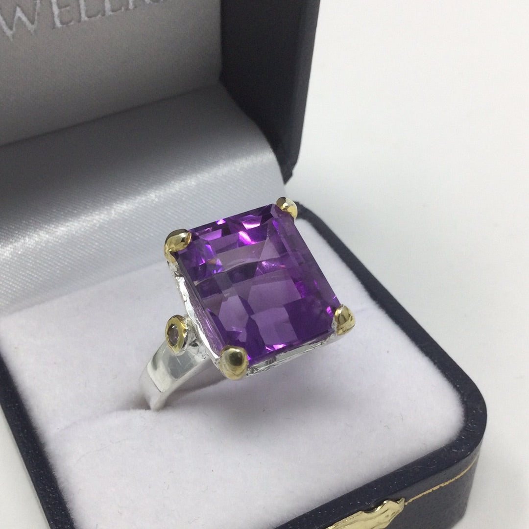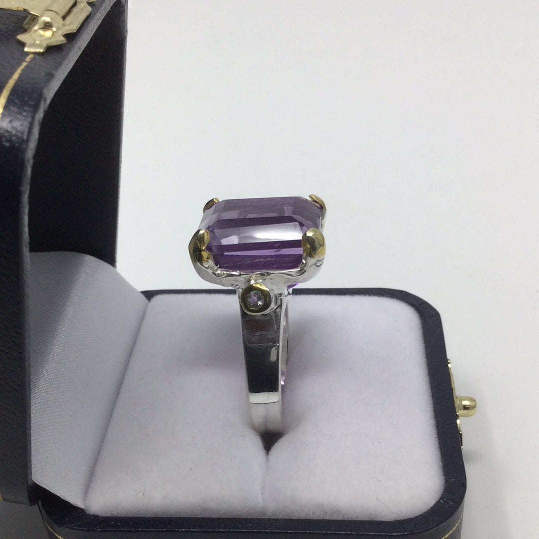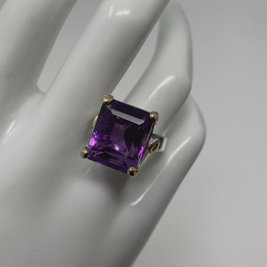 A fabulous genuine gemstone, this rich purple 20 CTW Amethyst measures in at 16mm by 13mm in that highly desirable, emerald faceted cut. This gem is hand selected and notice the depth of this ge and the interesting way the light hits the stone. Flanked on each side by Topaz, it’s a super classy look to cherish for many lifetimes to come. Always invest in genuine gemstones, a future heirloom. Set in .925 sterling silver with a white gold overlay. This ring is custom made for this gemstone and it’s a one of a kind. Size 8, Resize at your jeweler or use a ring guard.