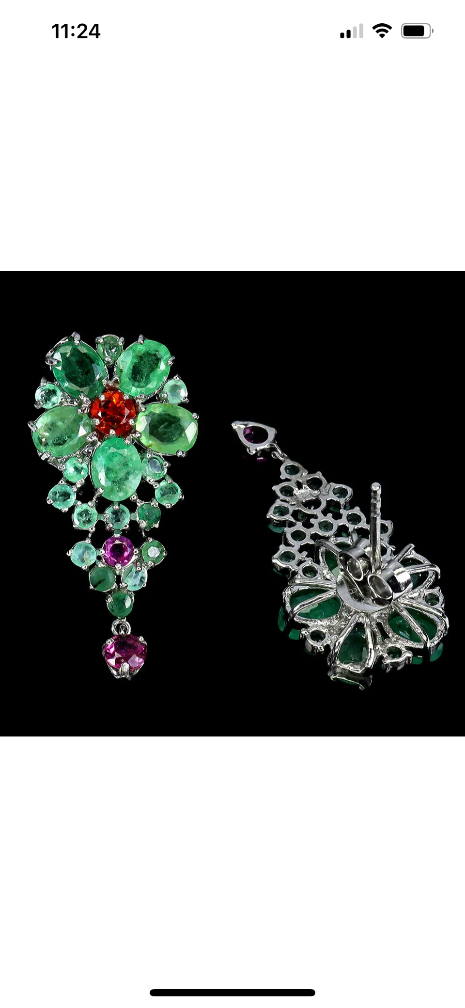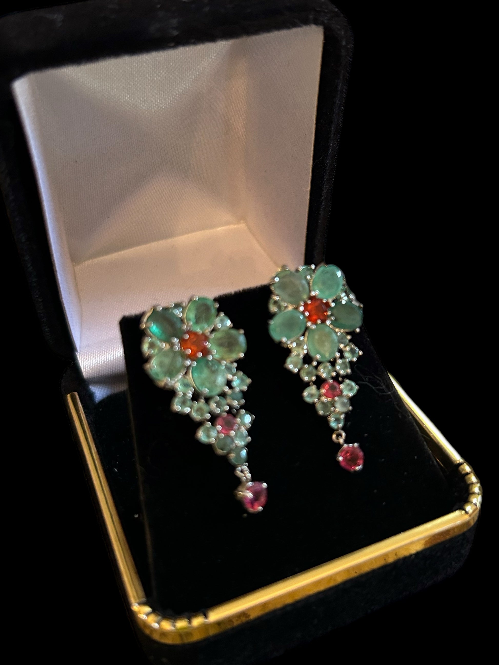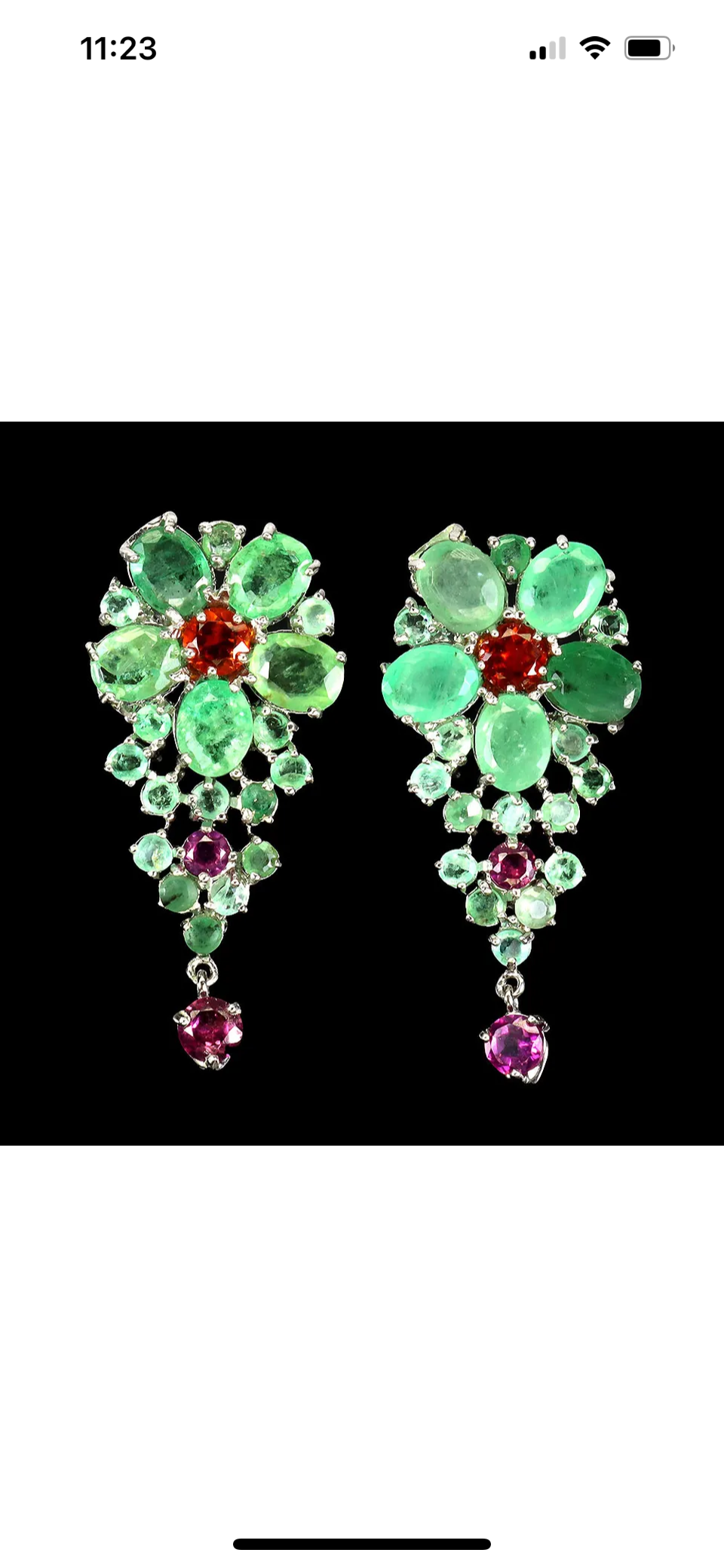 Absolutely enchanting, every girl should own Genuine Emerald earrings, accented with Citrine & Garnets. These one of a kind custom crafted earrings are set in .925 Sterling Silver. A must have, these frame your face and light up, illuminating your eyes and skin. Suburb in elegance. Approximately 3/4” long.