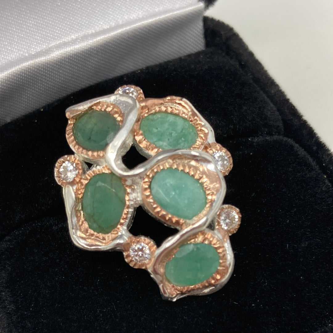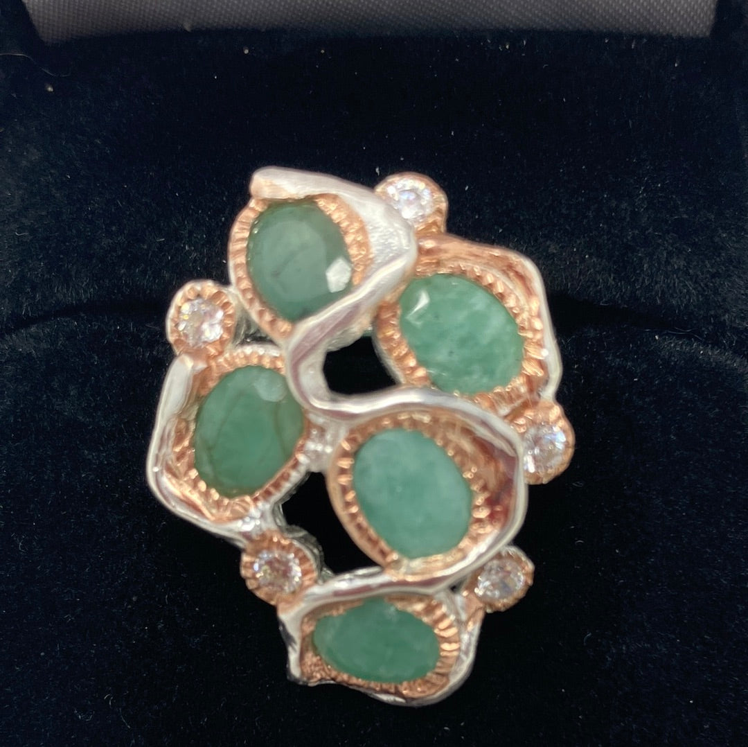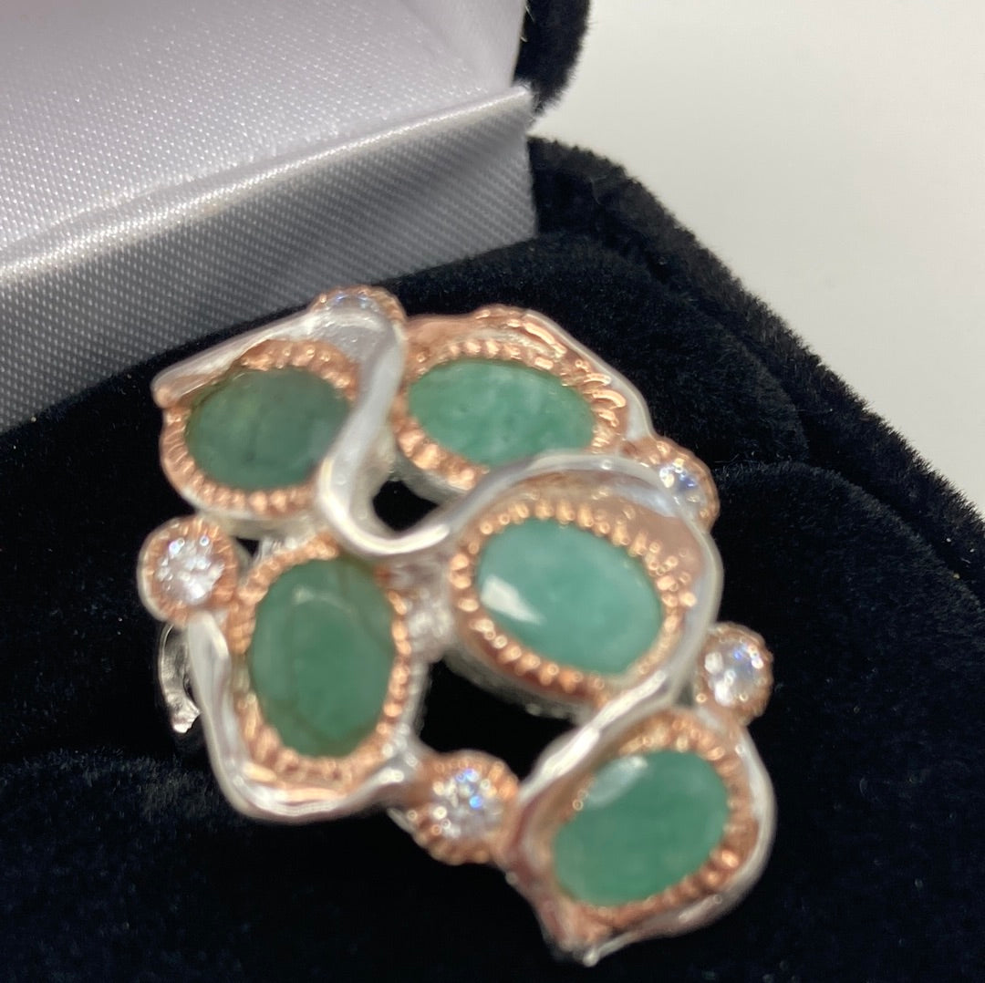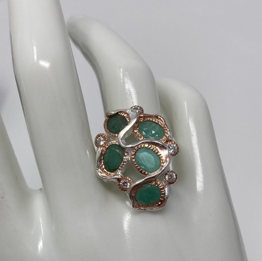 Wow, five gorgeous Genuine Emeralds in a generous 7mm by 5mm size gemstones that are impactful and majestic. Wearing genuine gemstones is an empowering feeling especially Emeralds. These are not easy to come by and this is a one of a kind, custom made design for this hand selected gemstones. Set in .925 Sterling Silver with Rose Gold accents. Invest in genuine gemstones for your heirloom collection. Size 6, Resize at your jeweler.