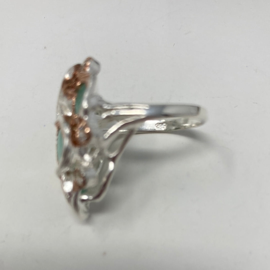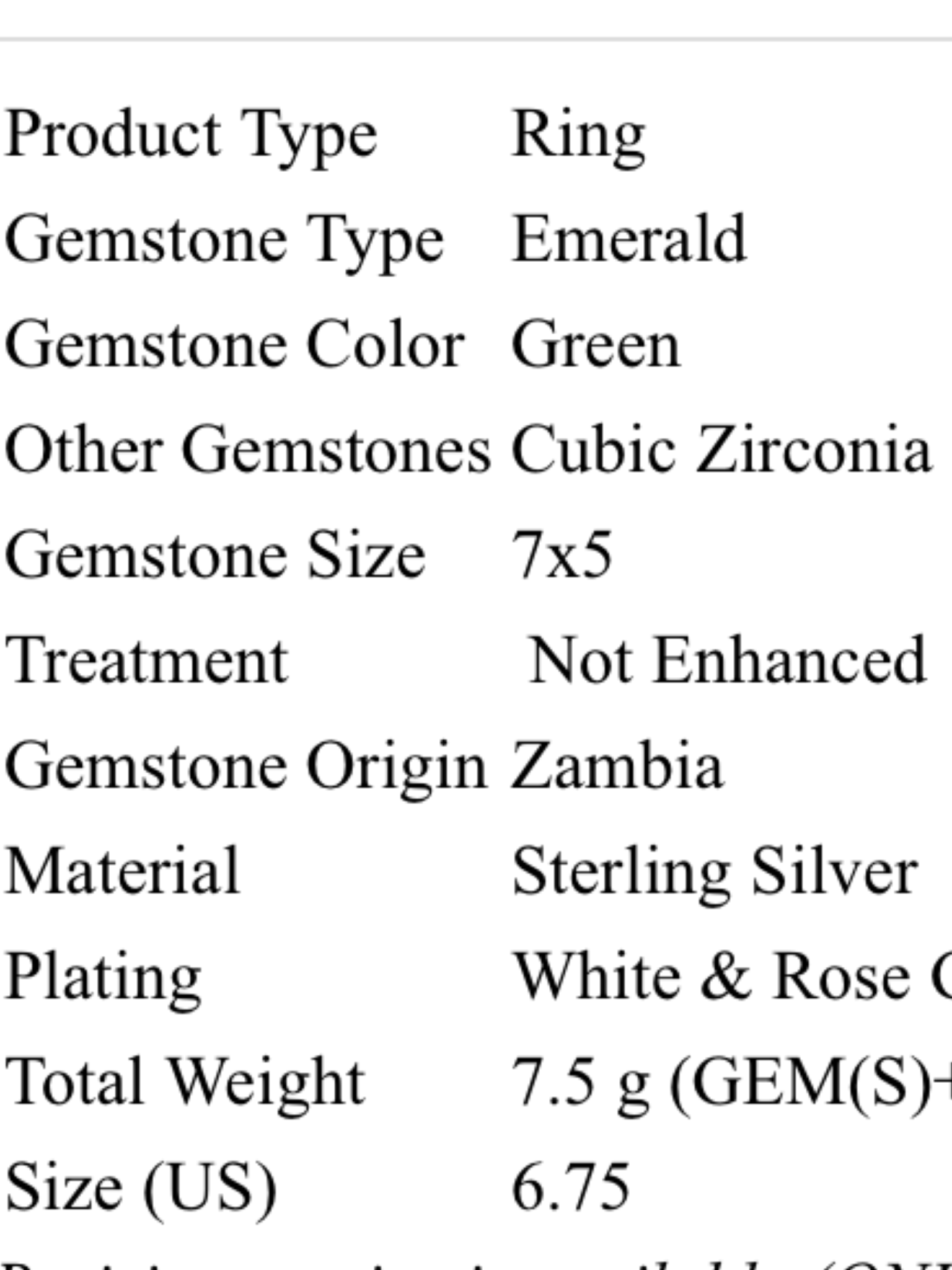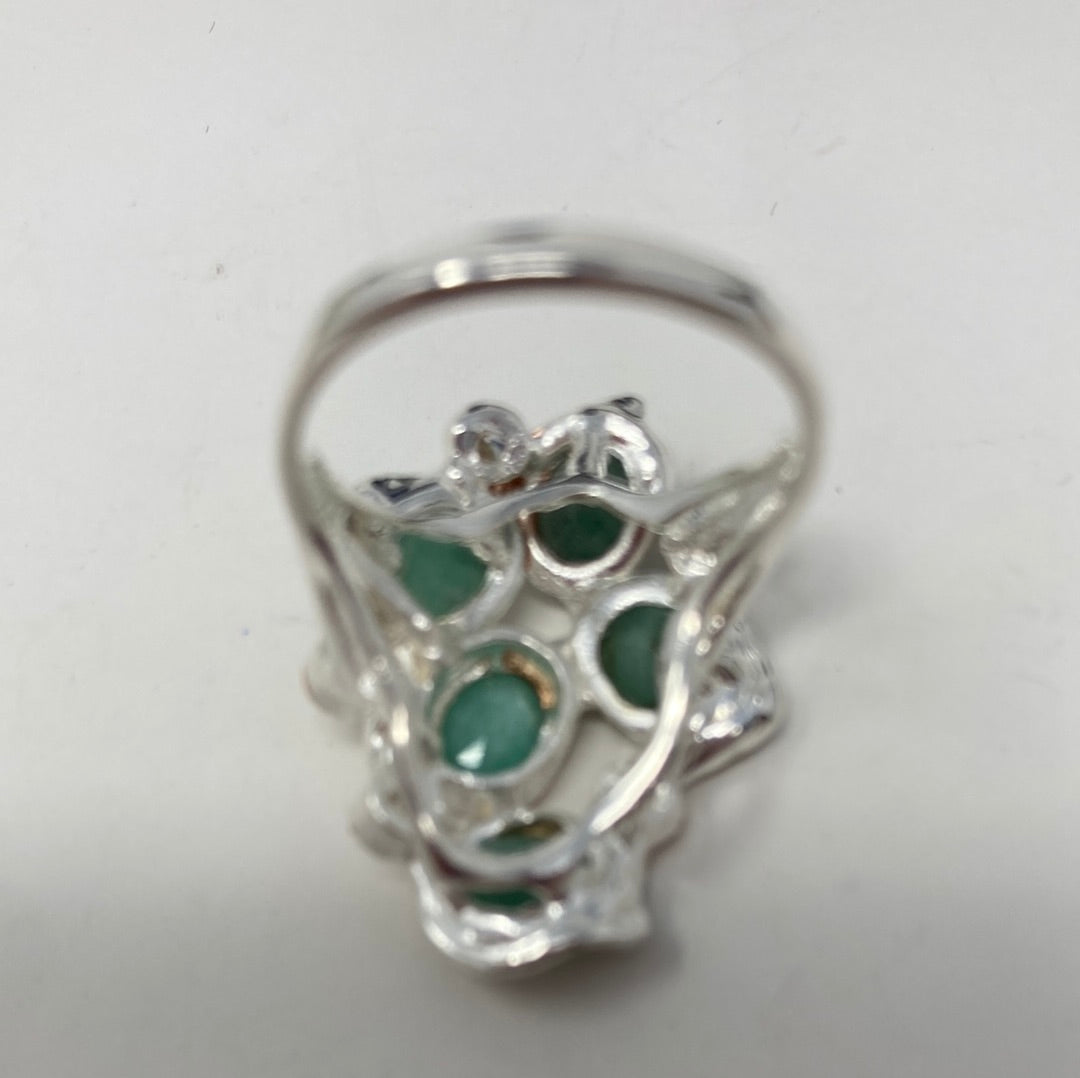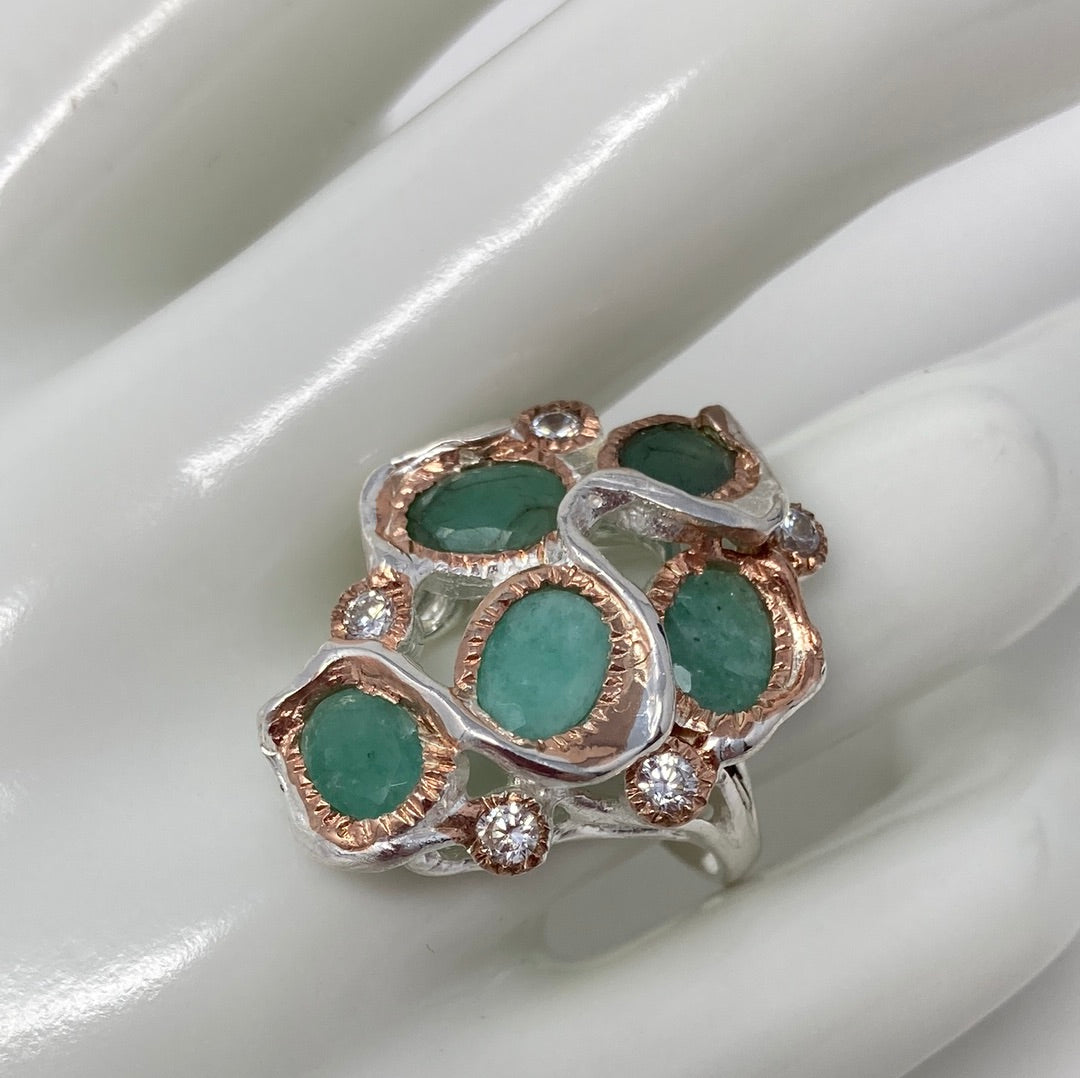 Wow, five gorgeous Genuine Emeralds in a generous 7mm by 5mm size gemstones that are impactful and majestic. Wearing genuine gemstones is an empowering feeling especially Emeralds. These are not easy to come by and this is a one of a kind, custom made design for this hand selected gemstones. Set in .925 Sterling Silver with Rose Gold accents. Invest in genuine gemstones for your heirloom collection. Size 6, Resize at your jeweler.