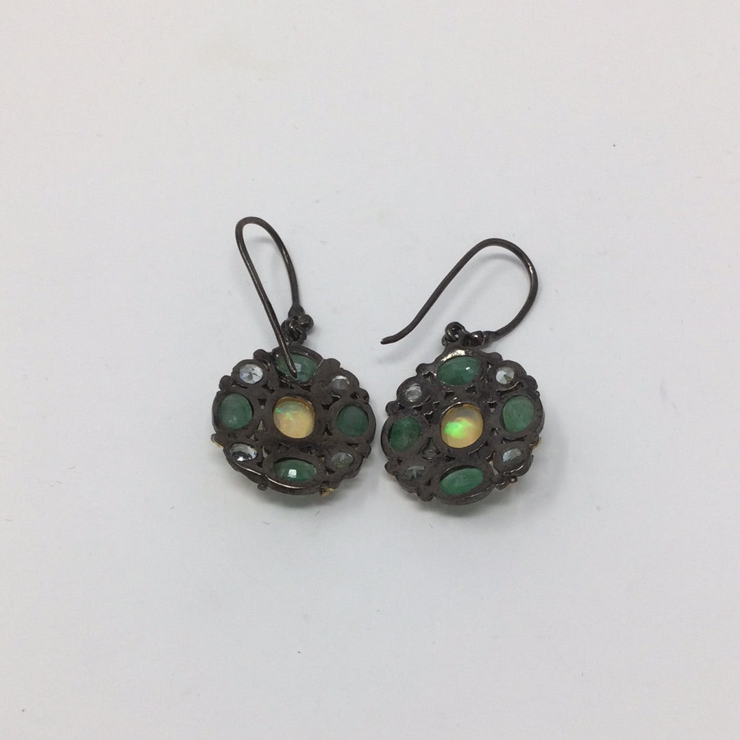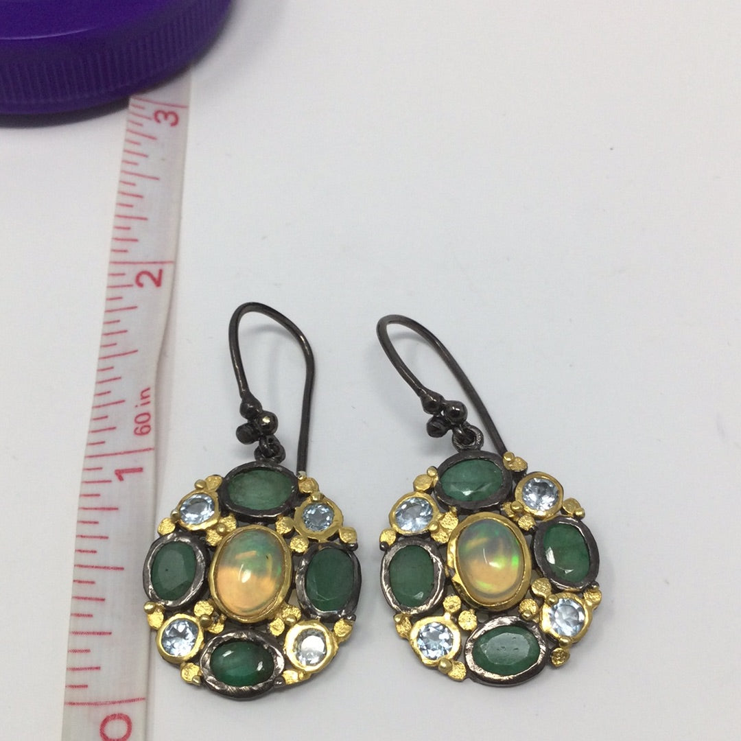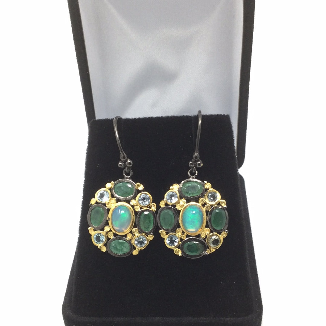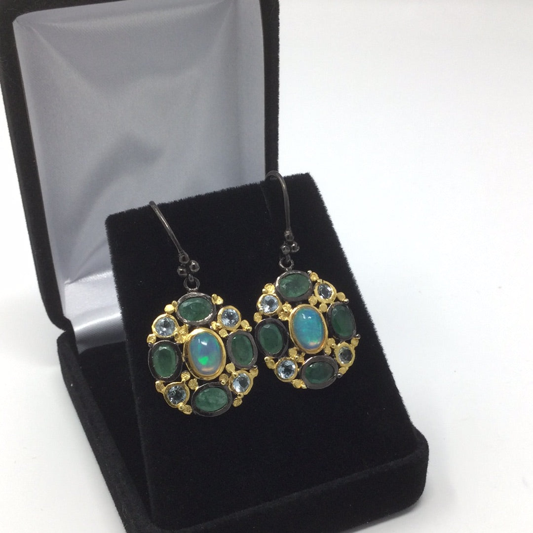 Rich, jewel encrusted earrings, a lifetime investment in timeless elegance. These earrings feature genuine Emeralds that embrace a fiery natural Opal. Accented also with Topaz, these earrings have the look of royal treasures. An enchanting way to frame your face, you deserve to be a masterpiece. Set in .825 silver with a Black Rhodium & Gold overlay. Custom made, one of a kind. A lifetime of beauty, invest in genuine gemstones, future heirlooms of tomorrow. Earrings approximately 1” Long