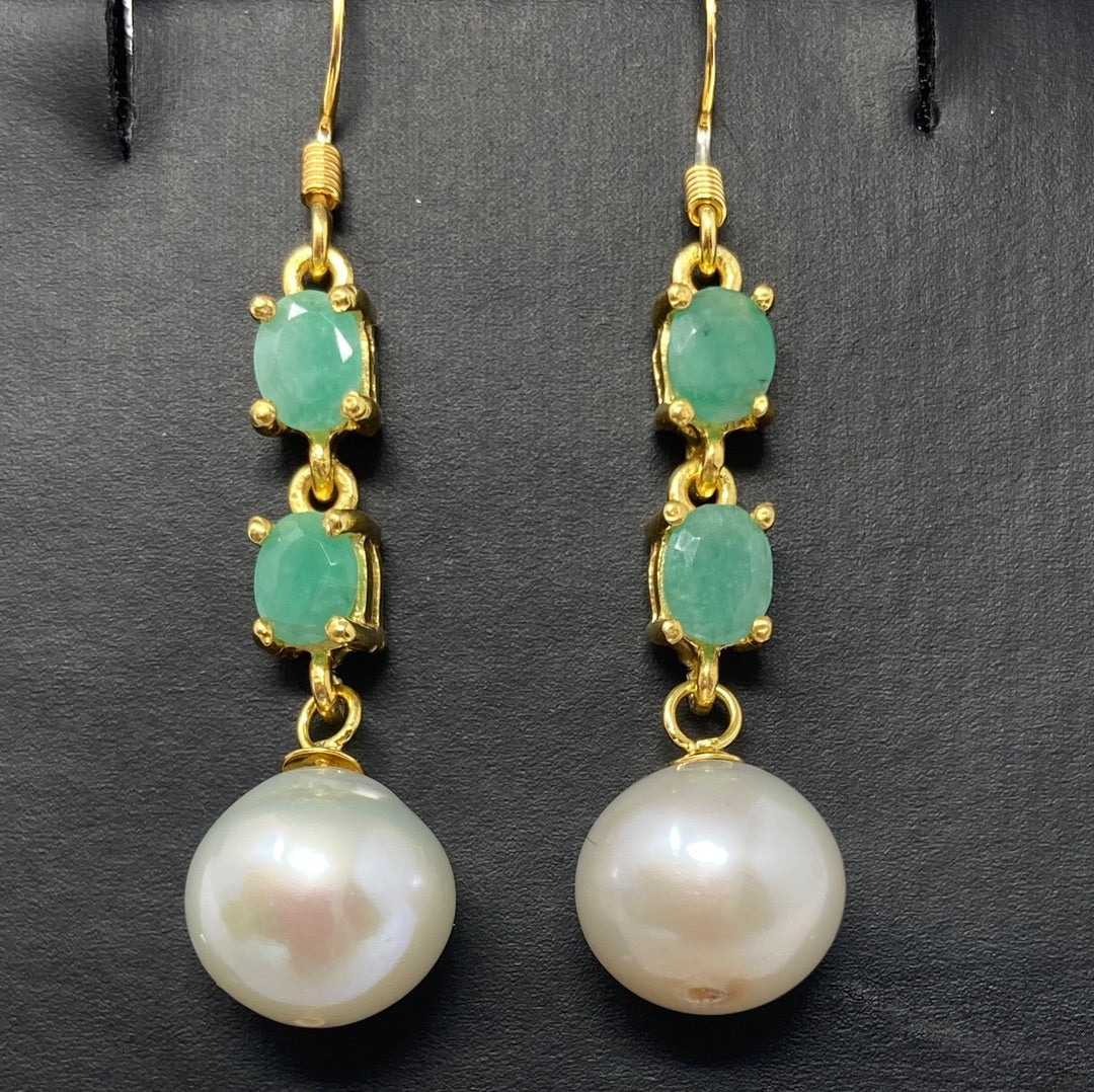 Genuine Emerald and Pearl Earrings, a super elegant statement. An exceptional way to frame your face in genuine gemstones and lustrous pearls. You can have it all for a fraction of the price at a retail jewelry store. Fine workmanship and outstanding hand selected and set genuine Emeralds. These sweet dangles are alluring with seductive movement as you walk, you’ll enchant the room in these exquisite earrings. An investment for your heirloom jewelry collection Set in .925 sterling silver with a 14k yellow gold overlay. Approximately a little over an inch long
