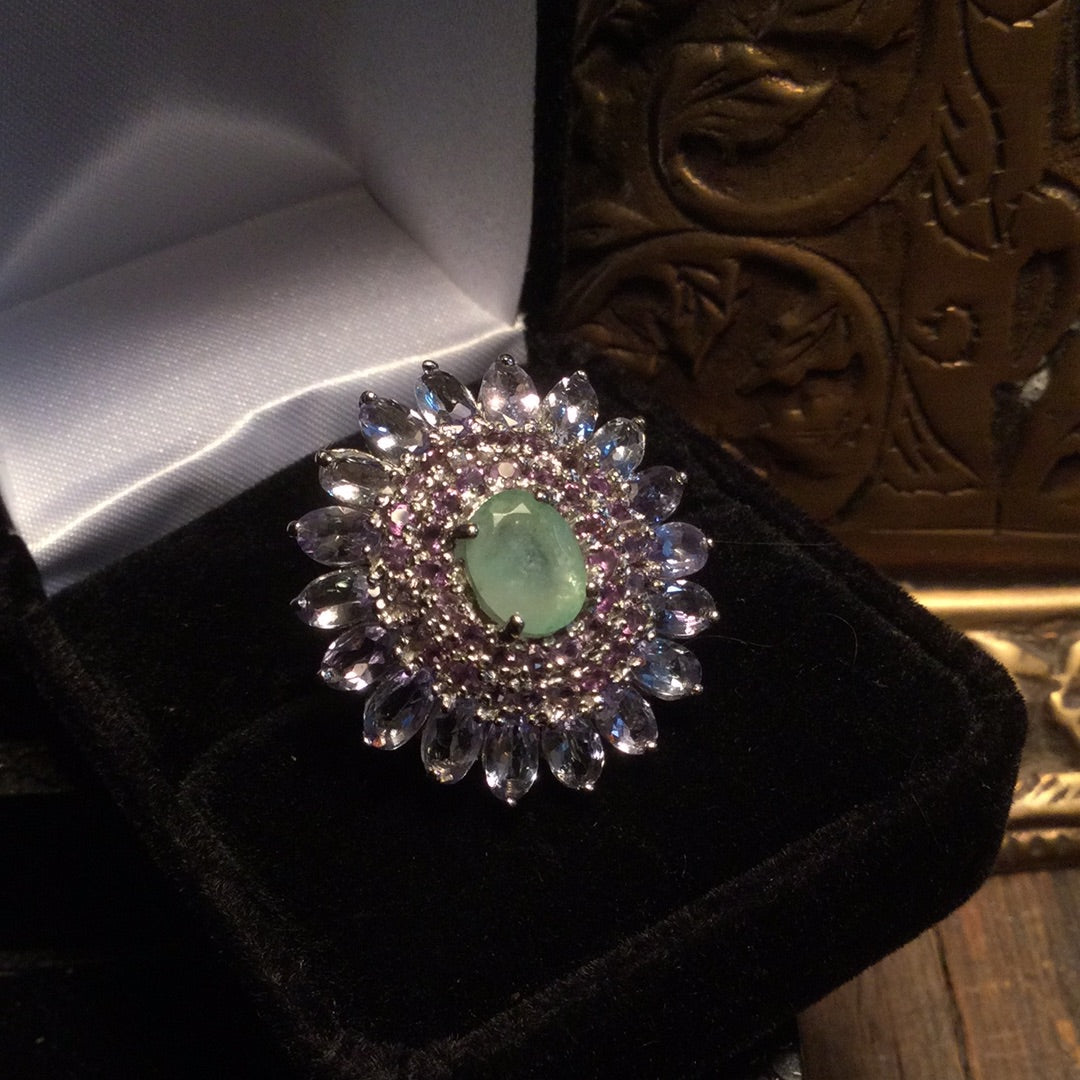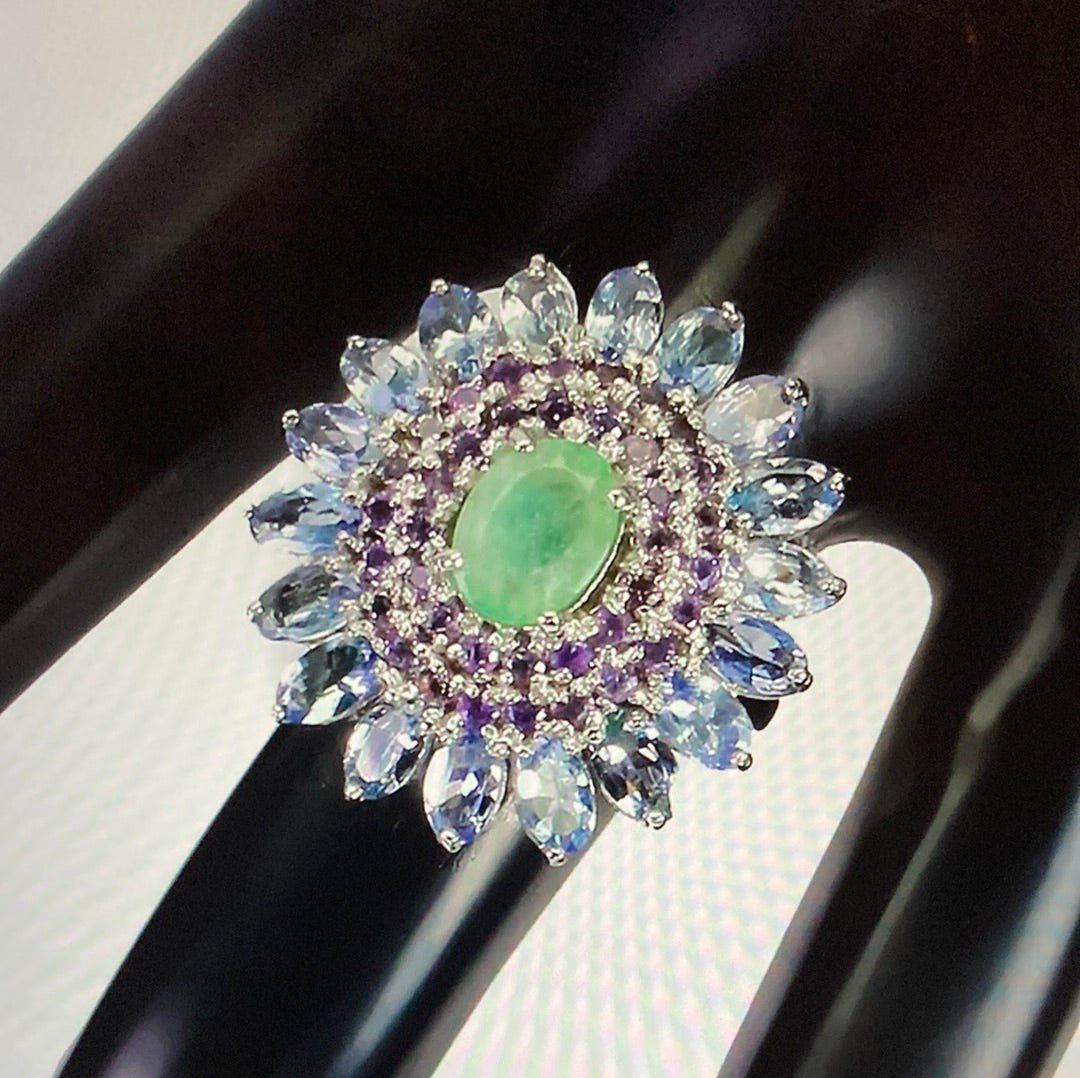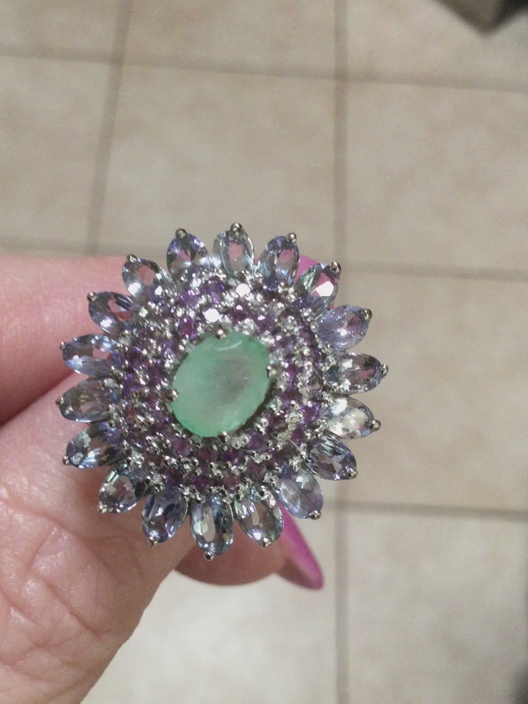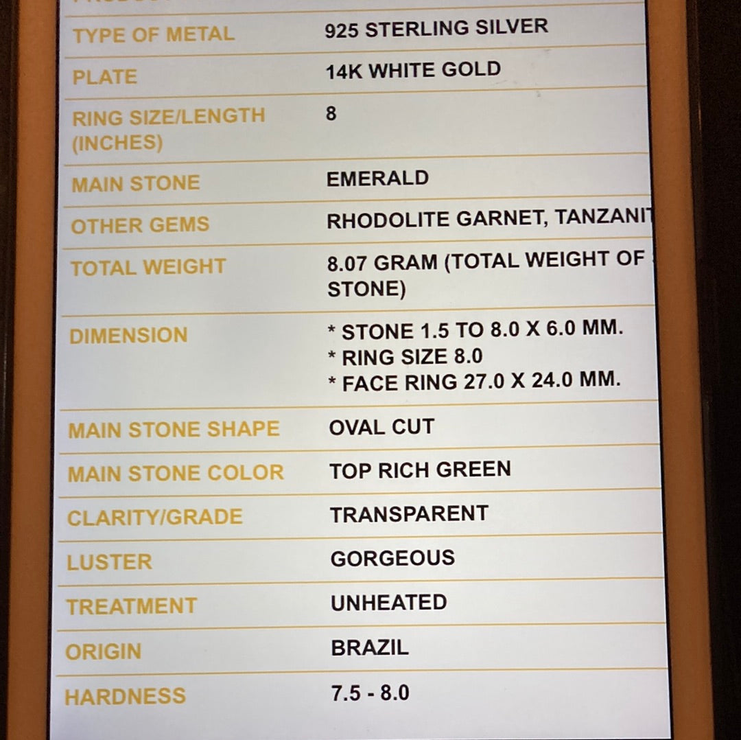 A genuine natural Emerald encrusted with precious Tanzanite gemstones. If this were set in gold it would be very pricy, several thousand dollars, This is a custom made one of a kind in this loaded gemstone ring set in .925 sterling silver with a 14K white gold overlay. All natural Emeralds have a garden, naturally occurring inclusions. This centerpiece Emerald gemstone measures approximately 8mm by 6mm, oval cut, embraced by dainty Rhodolite garnets too. Please compare prices of genuine gemstones at various jewelers, an informed consumer is my best customer. Size 8, can be resized at your jeweler.