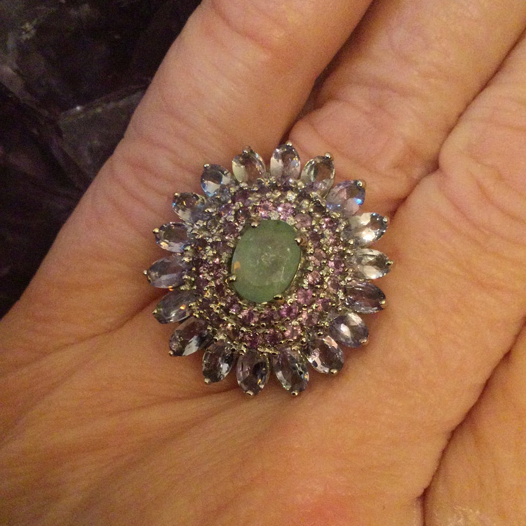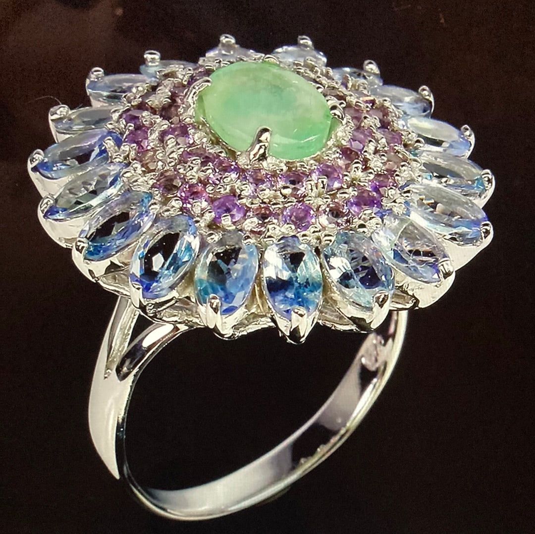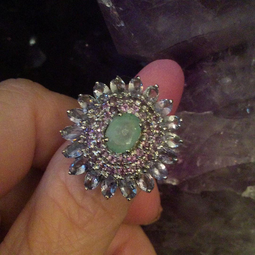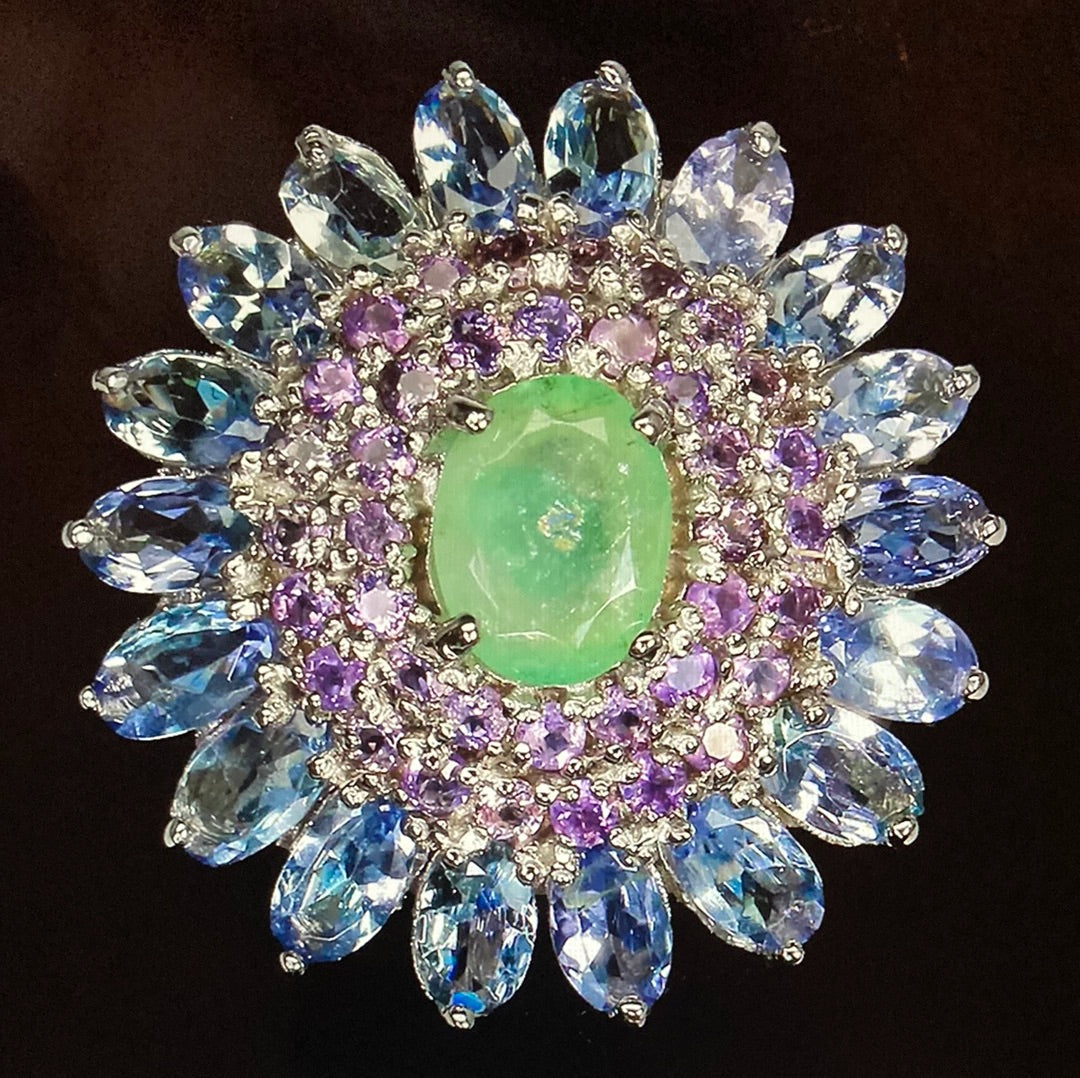 A genuine natural Emerald encrusted with precious Tanzanite gemstones. If this were set in gold it would be very pricy, several thousand dollars, This is a custom made one of a kind in this loaded gemstone ring set in .925 sterling silver with a 14K white gold overlay. All natural Emeralds have a garden, naturally occurring inclusions. This centerpiece Emerald gemstone measures approximately 8mm by 6mm, oval cut, embraced by dainty Rhodolite garnets too. Please compare prices of genuine gemstones at various jewelers, an informed consumer is my best customer. Size 8, can be resized at your jeweler.