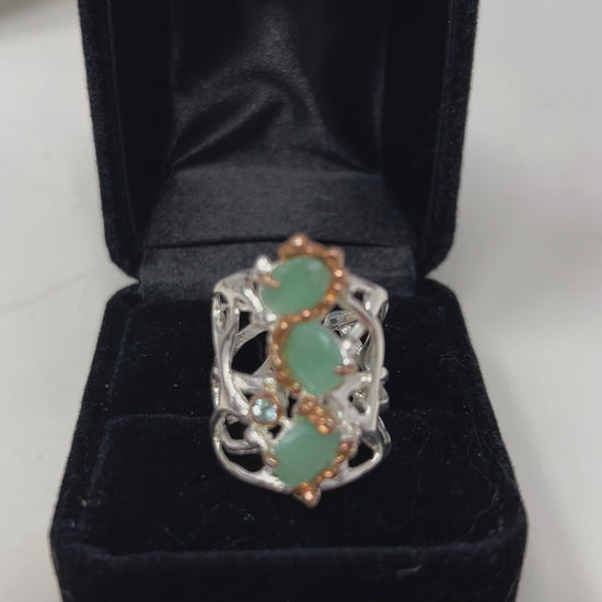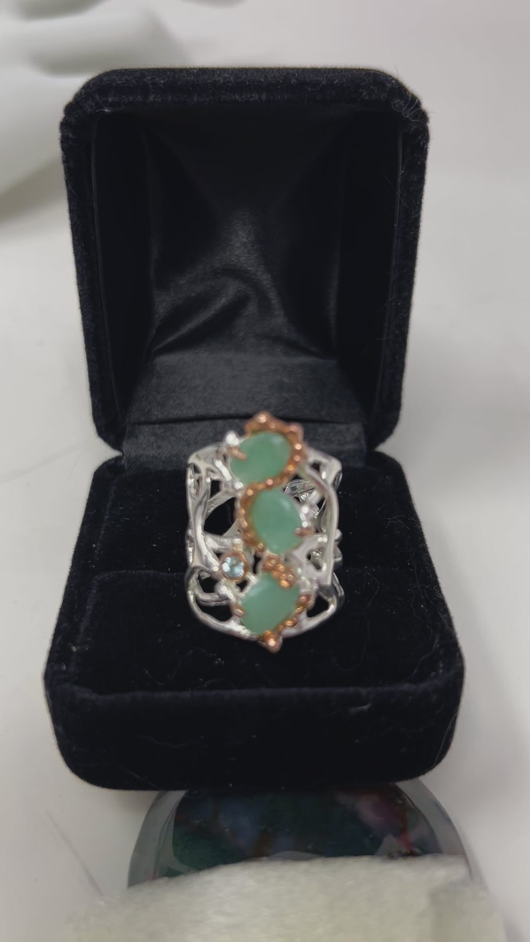 Genuine 6mm by 8mm fabulous Genuine Emerald Ring. Notice the contemporary sterling silver setting with 14k yellow gold accents. This is a custom made one of a kind from our curated collection. We never mass produce because if we did like so many other mass produced items you would get smaller, less quality gemstones. This ring has an open back and can be sized with a gentle squeeze, sterling silver is a softer precious metal. Will size from 5 to 10